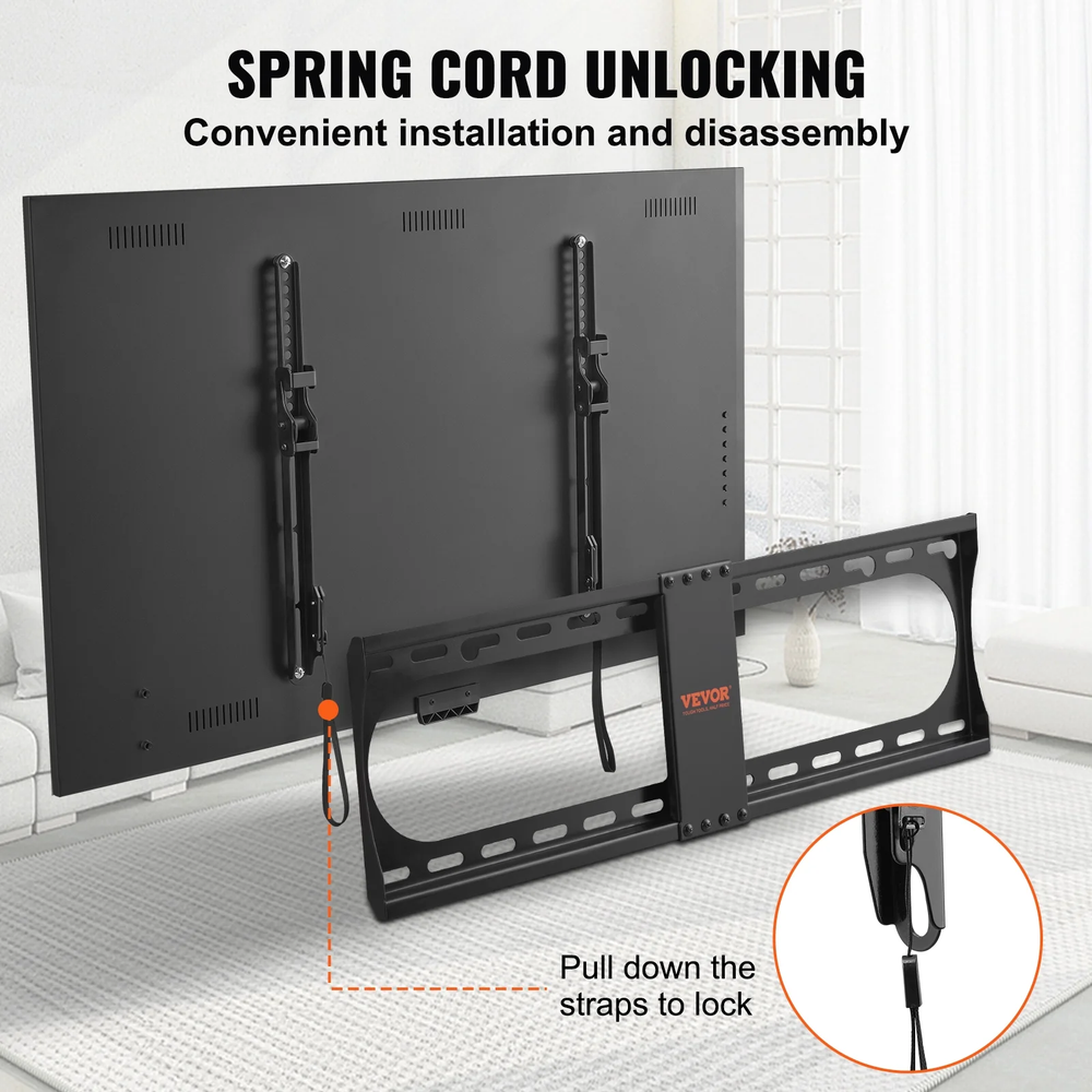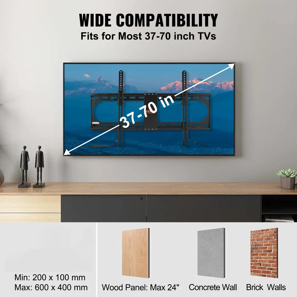Product Description Elevate Your Viewing Experience with Our Tilting TV Wall Mount! Constructed with a robust carbon steel metal bracket, our TV wall mount ensures stability and can support up to 132 lbs without wobbling. Easy Angle Adjustment Effortlessly adjust the TV angle with vertical and rotational flexibility, providing a clear visual experience. Space-saving Installation The TV mount bracket allows for a distance of 1.4 inch from the wall, occupying less than 1 square foot, which is space-saving. Hassle-free Installation With the auxiliary tools, installation is a breeze. Done in 3 simple steps! Universal Compatibility Compatible with TVs ranging from 37 to 70 inches, our fixed TV wall mount works with various brands and models. Open Design The frame gap is 1.18 inch/3 cm, allowing for easy installation of sockets. Wide Range of Applications Our ultra slim TV wall mount applies in different places including home, garden, and office, offering a reliable mounting solution for your TV. Specifications Item Model Number: RLLT2-F Product Size: 26 x 8.3 x 1 inch/660 x 210 x 25 mm Product Net Weight: 4.7 lbs/2.13 kg Load Capacity: 132 lbs Compatible TV Size: 37-70 inch Material: Carbon Steel Package Content 1 x TV Mount 1 x Set of Installation Accessories 1 x Bubble Level 1 x Velcro Strong Support for Your TVs: Our tilting TV wall mount is built with carbon steel with a durable matte finish providing sturdy and reliable support. It is wear-resistant and built to last with a max weight capacity of 132 lb. Say goodbye to wobbling and tipping Adjustable Angles: The TV mount bracket allows for angle adjustment with a +1°/-8° tilt range allowing you to adjust the angle according to your viewing needs. Reduce glare and enjoy a clearer viewing experience at your convenience Space-saving Design: Our fixed TV wall mount features an installation distance of 1.4 inches/35 mm away from the wall saving installation space. We also provide Velcro for convenient cable management keeping everything tidy and organized Easy Installation: We provide a complete installation accessories set including screws a bubble level and Velcro. Simply use the tools for a single-person setup in 30 minutes. With a spring rope unlock mechanism removing and disassembling your TV is a breeze Universal Compatibility: Our ultra slim TV wall mount is suitable for TVs ranging from 37 in to 70 inches in size with a max size of 600 x 400 mm and a min size of 200 x 100 mm. Compatible with multiple brands and models. Supports installation on max 24-inch wooden boards and concrete walls (anchoring required) Product Description: Elevate Your Viewing Experience with Our Tilting TV Wall Mount Constructed with a robust carbon steel metal bracket our TV wall mount ensures stability and can support up to 132 lbs without wobbling Easy Angle Adjustment: Effortlessly adjust the TV angle with vertical and rotational flexibility providing a clear visual experience Space-saving Installation: The TV mount bracket allows for a distance of 1.4 inches from the wall occupying less than 1 square foot which is space-saving Hassle-free Installation: With the auxiliary tools installation is a breeze. Done in 3 simple steps Universal Compatibility: Compatible with TVs ranging from 37 to 70 inches our fixed TV wall mount works with various brands and models Open Design: The frame gap is 1.18 inch/3 cm allowing for easy installation of sockets Wide Range of Applications: Our ultra-slim TV wall mount applies in different places including home garden and office offering a reliable mounting solution for your TV Specifications: Item Model Number: RLLT2-F Product Size: 26 x 8.3 x 1 inch/660 x 210 x 25 mm Product Net Weight: 4.7 lb/2.13 kg Load Capacity: 132 lb Compatible TV Size: 37-70 inch Material: Carbon Steel Package Content: 1 x TV Mount 1 x Set of Installation Accessories 1 x Bubble Level 1 x Velcro