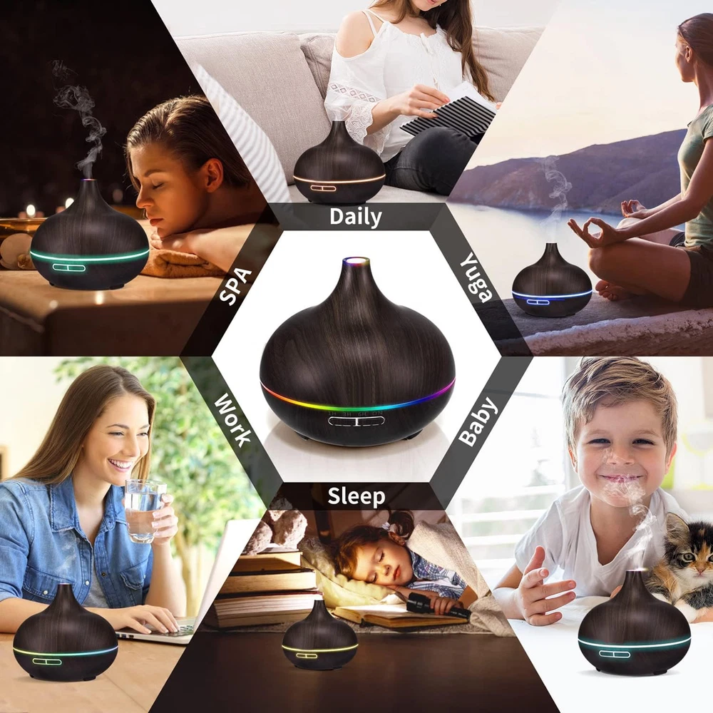 Diffuser with Remote & Essential Oils Set: The essential oil set includes our most popular black wood grain essential oil diffuser (550ml upgraded version) and top 2 pure essential oils. Lavender,rose essential oils go perfectly with ultrasonic oil diffuser to bring inviting, lively, and aromatic scent. Auto Shut-off & Large capacity: Essential Oils Diffuser can hold 550ML water up and run continuously for 10 hours.Just add a few drops of essential oils and you can enjoy a pleasant mood all day long. Time-Setting: Aromatherapy Diffusers comes with 4 built-in timer setting modes: 1 Hour/ 3 Hour/ 6 Hour/ Continuous. The bedroom diffuser gives out ultra fine and smooth mist which can soften and moisten dry and chapped skin. So sit back and enjoy work, study, yoga, relaxation, spa. Soothing Lights & Ultrasonic Technology: Adopted ultrasonic technology, this diffuser is extremely quiet when working. All you have to do is to relax and let the soothing fragrance and soothing lighting help you release all the tension of a hard day’s work. Wonderful Gifts for Your Lover and Friend: The Aroma Vapor Diffusers can be used as Humidifier,Air aroma machine, Night Light,Great Gift. To create a peaceful and comfortable environment for you to relax and enjoy life. Diffuser humidifier with essential oils is the best gift for your sweetheart. Product Description 1 Better Sleep 2 Whisper Quiet 3 Integrate Into Life How is the diffuser quality? Before the product is sold, we have done many kinds of product testing to ensure that it is the best quality on the market Which Oils Come with Aromatherapy Diffuser? Lavender, rose Is it quiet? I'm a light sleeper. The noise level of this diffuser is only 23 dB, the ultra-quiet fan can effectively reduce noise. It won't disturb you at night. Is it easy to clean? Yes, the wide and large water tank is very easy to clean, just add some warm water and diluted vinegar, and lay it aside for 15 minutes, then use a wet cotton swab to clean the middle white disc of the tank. Then wipe with a soft cloth.