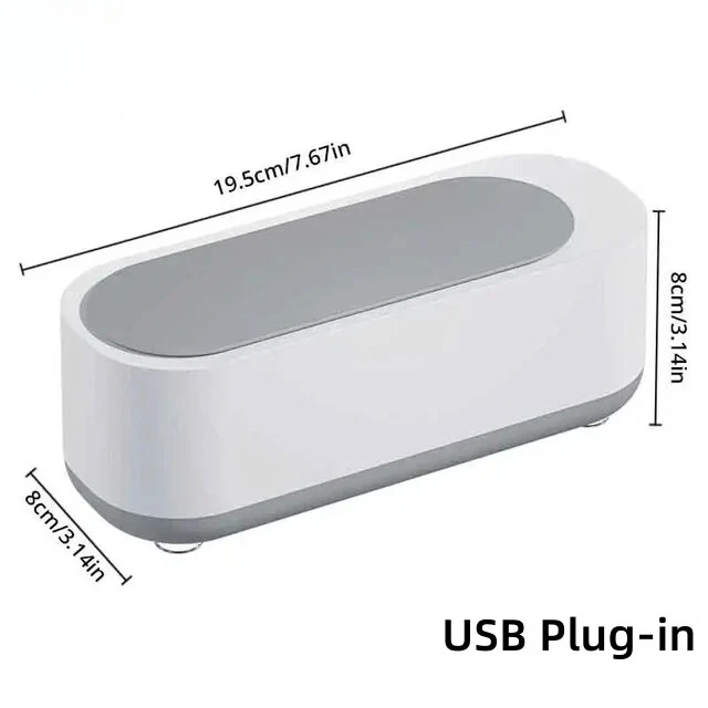 Ultrasonic Cleaning Machine 45KHz High Frequency Multifunctional Vibration Cleaner USB Charge Jewelry Glass Ring Cleaner Specification: Material: PP Rated voltage: 12V rated Power: 5W color: White Weight: 0.193 Size: 190x72x6 8mm/7.2x2.8x2.6" Power supply: 2 AAA dry batteries (not included) Suitable for cleaning glasses, jewelry, makeup brushes, toys, razors, toothbrushes, nail clippers, combs, etc. Features: 1. Multifunctional jewellery washer: can be used to clean jewellery, rings, glasses, dentures, watches, coins, etc. 2. Ultrasonic cleaning: ‘cavitation effect’, quickly cleans stains. 3. One-key start: 360° purification, deep cleans dirt from the crevice. 4. How to use: Add a suitable amount of water, one key start cleaning, efficient cleaning, easy to remove stains 5. Advanced cleaning method: Stop using traditional liquid cleaners and brushes, which can damage your valuables and hands. Ultrasonic cleaners are the perfect replacement for traditional liquid cleaners. It makes cleaning messes easier and safer, you can clean your things anytime, anywhere, and the ultrasonic won't scratch or damage your valuables. Package includes: 1.USB models: 1 x Ultrasonic Makeup Tools Jewellery Contact Lens Braces Watch Washing Machine 1 x USB cable 2.Battery models: 1 x Ultrasonic Makeup Tools Jewellery Contact Lens Braces Watch Washer (battery not included)