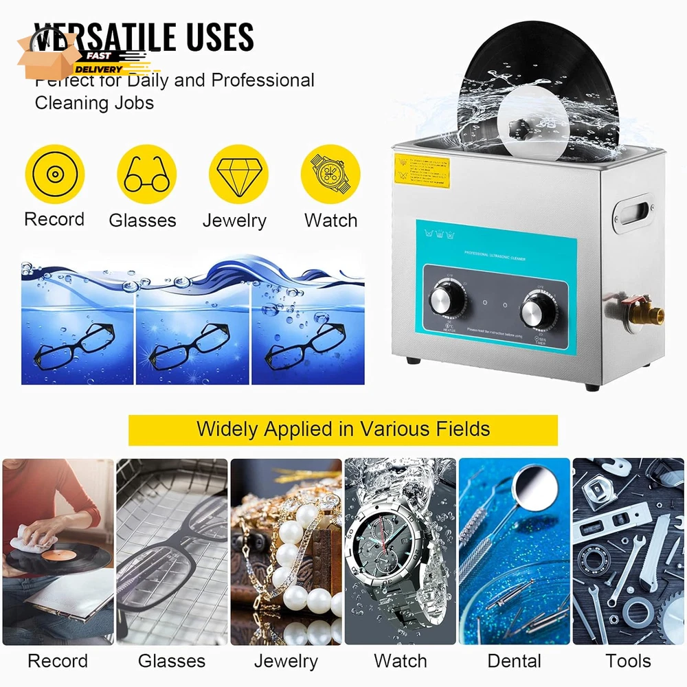 Store New Arrivals Add to Favorite View Feedback Contact Ultrasonic Vinyl Record Cleaner 6L 40Khz Vinyl Ultrasonic Cleaning Machin Description Product Dimensions 16.5 x 14.2 x 11.2 inches; 13 Pounds Premium SUS304 Material: Tank Size: 6L/1.59 Gal; Ultrasonic Power: 180W; Heating Power: 300W. This ultrasonic cleaner is constructed with sturdy 304 stainless steel, ensuring no water leakage and long service life. A ball-shaped basket is available to decrease collision between sharp items and the tank. 40khz Deep Cleaning: 40kHz ultrasonic frequency allows the ultrasonic jewelry cleaner to quickly clean small items with complex construction or irregular shape. The industrial-grade transducers create millions of microscopic bubbles that powerfully clean your possessions while saving time and energy. Mechanical Knob Control: The jewelry cleaner ultrasonic machine features two mechanical knobs to adjust functions, with an adjustable timer (0-30 min) and heater (68-176℉/20-80℃). A heating function can effectively soften and dissolve stubborn marks, thereby improving the cleaning effect. High-Capacity Rack: This commercial ultrasonic cleaner is designed with a washing rack for vinyl records, made of 6062 aluminum, which can clean 4 vinyl records at a time. The vinyl records are driven by a built-in motor at 720 degrees/min and cleaned by ultrasonic vibration. Extensive Application: Our heated ultrasonic cleaner is ideal for commercial, industrial, and residential use. The ultrasonic cleaning machine is suitable for record stores, dental clinics, hardware stores, scientific laboratories, jewelers, optical shops, watchmakers, antique dealers, etc. Product Description Key Features Premium Stainless Steel 304 stainless steel tank, better to resist alkali solution, organic/inorganuc acid than normal SUS200 products. 201 stainless steel cover, made up of several crafts to ensure no water leakage, heat-proof & anti-rust. Powerful 40KHz Frequency Industrial-level transducer, create more cavitation quantity than 28KHz products. Do well in cleaning stuffs with complex shape, holes, long-time stians. Also, it will cause much lower nouse than ultrasonic waves nearly 20KHz. Large 10L Tank & Basket Tank Capacity: 10L; Large Basket Material: Stainless Steel; With a ball-shaped jewelry cleaning basket, use tap water for general cleaning, can also add 5-10 ML detergent into water to enhance wash result if needed. Adjustable Heat & Work Time Actual 240W cleaning work time(0-30 minutes adjustable); Also can heat the liquid between 20-80℃(adjustable). Micro-chip controlled machine, with 2 mechanical knobs to adjust functions.Get brand new valuables after it finished. Elaborate & Convenient Details Input: 110V; Handles at both side for easier movement. And the top lid is to prevent heat loss and reduce noise. Right side water drain connector with valve to control water outlet speed. 4 bottom rubber feet to keep stability. Versatile Cleaning Field Professional 10L ultrasonic washer, suitable for many fields to use--Medical and Dental Clinics, Tattoo Shops, Scientific Labs and Golf Clubs.Jewelers, Opticians, Watchmakers, Antiques Dealers and Electronics Workshops, etc. Specifications Input: 110V Material: Stainless Steel Ultrasonic Frequency: 40KHZ Tank Capacity: 10L Working Time: 0-30 Minutes Cleaning Power: 240W Heating Function: 400W(Power); 20-80℃ Heating Temperature Tank Size (L*W*H): 11.8" x 9.4" x 5.9"/30 x 24 x 15 cm Product Size (L*W*H): 12.8" x 10.4" x 11"/32.5 x 26.5 x 28 cm Product Weight: 17.3 lbs/7.85 kg Package Content 1 x Sonic Cleaner 1 x Cleaning Basket 1 x Jewelry Cleaning Ball 1 x Water Pipe 1 x Stainless Steel Cover 1 x Power Supply 1 x User Manual 10L Sonic Cleaner with Heater This is a high efficiency sonic cleaner used for daily or professional cleaning works. It will emit 40KHZ ultrasonic wave to deeply wash dirt on your valuable's surface, longhole, crevice and shelter. With heating & timing function, use only tape water, if needed, some solutions, your things can be cleaned thoroughly in minutes. No scratching created, great for business, commercial or home. Note: Since our sonic cleaner has been upgraded & updated, the product (in metal or plastic handle) will be delivered randomly. Premium Material Ensured Heating & Working Adjustment Amazing Cleaning Function User-Friendly Design ABOUT US We offer the best prices around on high quality products. Our E-store includes media such as books, movies, music and games while offering electronics, toys, sporting apparel, clothing, tools, general home, garden items and more. SHIPPING We are always working hard to ensure your package arrives as soon as possible. Please understand that some factors like weather, high postal traffic, and the performance of shipping companies are outside of our control. We offer free shipping to the lower 48 states and ship within 2 business days of payment, usually sooner. We do not accept P.O. Boxes. Please provide a physical address. For shipping outside of the continental USA, we only use eBay's Global Shipping Program.The item is shipped to KY and then sent to the rest of the world. International customers are responsible for all duties and taxes. Continue to check out in order to calculate costs for shipping the item to your country. Messages regarding eBay's Global Shipping Program MUST be directed at eBay EXCLUSIVELY. RETURNS We offer a 30-Day Return Policy on items which you are not completely satisfied with. You have the option for a full-refund or an exchange of the item. No returns are available on items shipped outside of the USA. PAYMENT We accept PayPal. CONTACT US This page content is yet to come Please ad us to your favorite seller and visit again later Thank You CUSTOMER SATISFACTION We try our very best to make sure every customer is completely satisfied. If there's a problem, message us! We're happy to help. WE ACCEPT Copyright © 2021 AutoDS. | All Rights Reserved