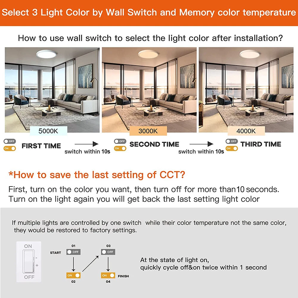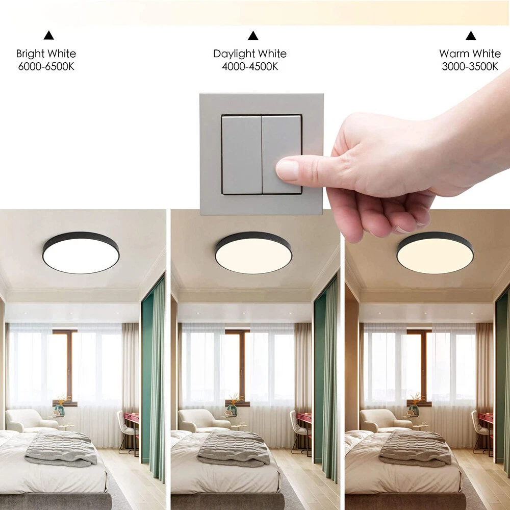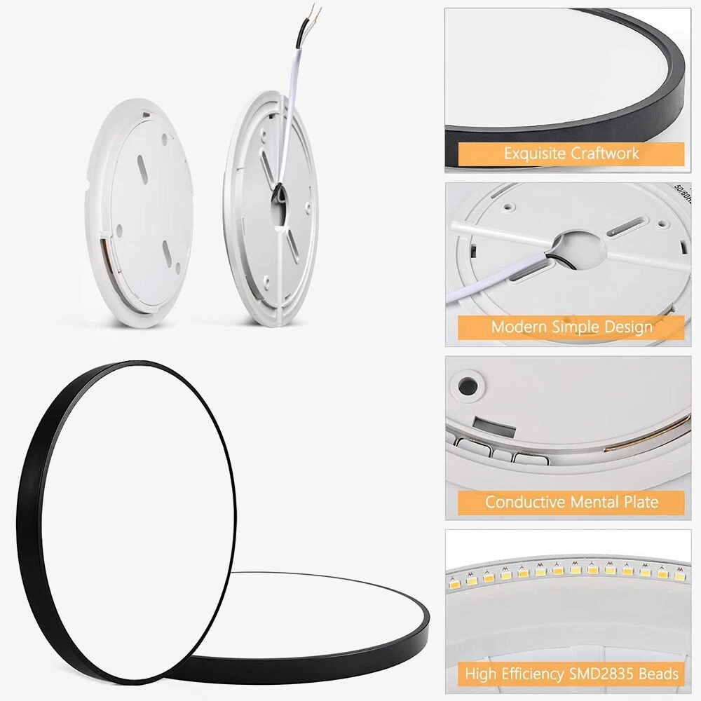 You may also like Retro Ceiling Lamp Fixture Industrial Mental Cage Pendant Lights Cafe Bar Decor 35.19 USD Free shipping Boho Rattan Ceiling Light Chandelier Woven E27 Base 3Bulb Vintage Fixture Wicker 165.59 USD Free shipping Product Description LED Flush Mount Ceiling Light Super Slim 23/30/40/50cm 24W/28W/38W/48W LED Ceiling Light 3 Color Temperature in One 3000K/4000K/6000K Adjustable Ceiling Light fixture for Bedroom Kitchen Dining Room Description: Features: *【High Performance】Our ceiling lamps are integrated LEDs, no bulbs are needed. Four sizes to choose, 9.05inch, 11.8inch, 15.7inch, and 19.6inch, suitable for all size needs. Features AC85-265V 2500lm/3200lm/4200lm/5200 lumens brightness by using only 24W/28W/38W/48W. Energy Savings of up to 90%, for example, the 28W lamp is equivalent to six 40W traditional bulbs(240W). Saving a lot of money on your electricity bills and reducing re-lamp frequency. *【3 Color Temperatures】This flat ceiling flush light has 3 color temperatures, 3000k, 4000k, and 5000k, it is controlled directly by a wall switch, 3 presses for a cycle, no need remote control or app, and is simple to work and operate. Much more durable and Longer lifespan of about 30,000hrs. *【Memory function】Powerful memory function automatically retains the last color temperature. First, turn on the color you want, then turn it off for more than 10 seconds. Turn on the light again you will get back the last setting light color. *【Soft&Bright Lighting】The flush mount LED ceiling light is equipped with high-efficiency LED beads, saving your electricity bills more than traditional LED light bulbs, and protecting your eyes from the glare of traditional lighting. 28W bright and even Lighting easily illuminates a 6-18 square room. Bring you a warm and comfortable feeling for your bedroom, bathroom, and living room. *【Stylish&Thin Design]】 These LED ceiling lights are only 0.9inch thick, well-sealed, and avoid the little bugs, perfect size, and flat ceiling lights well match the ceiling. Modern simple design meets most decoration styles, modern and elegant. *【Easy to install】Very easy to install, only need 3 steps to install. First, connect the AWG, and then fix the base on the ceiling with 3 screws, finally screw the ceiling lamp in the base, and make sure the metal plate inside the lamp is well rotated and stuck at the rightmost of the base, or the ceiling led light may not light up. *【Wide Application】Simple Design of the LED ceiling light can well suit different decoration styles, like living room, bedroom, kitchen, hallway, bathroom(waterproof IP44, no problem for daily use), etc. Energy-saving LED ceiling lights help you to save your electricity bill, a great choice for your home. Specifications: Color: Black Material: PC Working Voltage: AC85V-265V Color Temperature: 3000K Warm White/4500K Natural White/5000K White Power: 24W, 28W, 38W, 48W Diameter: 9.05inch, 11.8inch, 15.7inch, and 19.6inch Thickness: 0.9inch Brightness: 24W: 2500lm, 28W: 3200lm, 38W: 4200lm, 48W: 5200lm Working Temperature: -20℃-60℃ Package includes: 1X LED Flush Mount Ceiling Light Payment Shipping Returns Contact Us Paypal. We only ship to confirmed paypal address. Items are generally dispatched within 1~3 business days after payment is cleared. Please make sure your address in Paypal is matched with your shipping address before you pay. We offer a 30 days return guarantee. If you are not satisfied with the item, you can return it within 30 days after item received. If items have any problem due to quality, please contact us for refund, exchange or a replacement. Please contact us first before item returned. Customer Service from 9:00 am - 6:00 pm on Business Days. Payment Paypal. We only ship to confirmed paypal address. Shipping Items are generally dispatched within 1~3 business days after payment is cleared. Please make sure your address in Paypal is matched with your shipping address before you pay. Returns We offer a 30 days return guarantee. If you are not satisfied with the item, you can return it within 30 days after item received. If items have any problem due to quality, please contact us for refund, exchange or a replacement. Please contact us first before item returned. Contact Us Customer Service from 9:00 am - 6:00 pm on Business Days. powered by