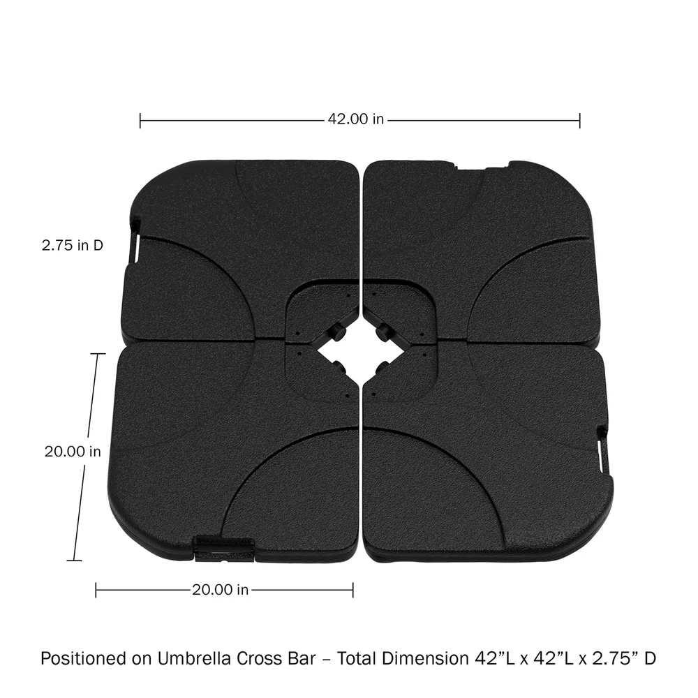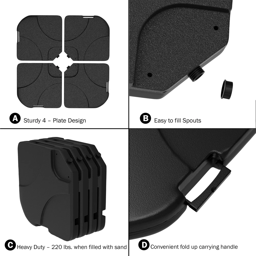 4 PLATE DESIGN- This 4-piece fillable plate set is designed to securely support your cantilever or offset umbrellas. It is not for use with umbrellas featuring a single pole or cross bar bases with flanges.\nSTURDY AND DURABLE- Each plate in this 4-piece base is made of durable HDPE plastic and can hold up to 55 pounds of sand for a total of 220 pounds. The umbrella base is strong enough to stand up to the elements in most weather conditions.\nEASY TO FILL SPOUT- The plates feature an easy to fill spout for quick and convenient filling with sand. The spouts also help to easily empty the plates for quick cleaning and storage during the winter or while not in use.\nFOLDABLE HANDLE- All the OpenSky on eBay Our eBay Store About Us Contact Us Umbrella Stand 220 Lb. Capacity 4-Piece Fillable Weighted Cantilever and Offset Umbrella Base with Handle for Deck