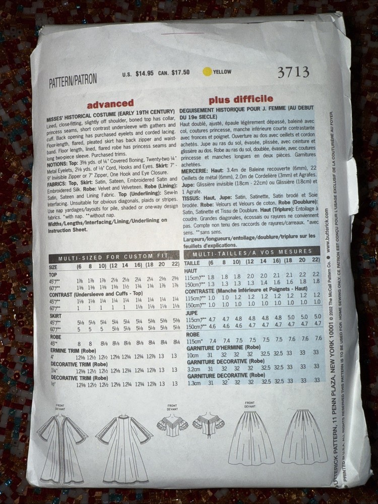 Butterick 3713 is an uncut sewing pattern for a historical Queen dress, robe, and costume gown dating back to the 19th century. The pattern is suitable for adult and teen female sizes 12, 14, and 16. The finished garments feature a skirt, dress, off-shoulder design, and a fitted top, with the option to include a royal robe. The pattern is compatible with the 2000s decade and is designed for those interested in sewing costumes and dresses.