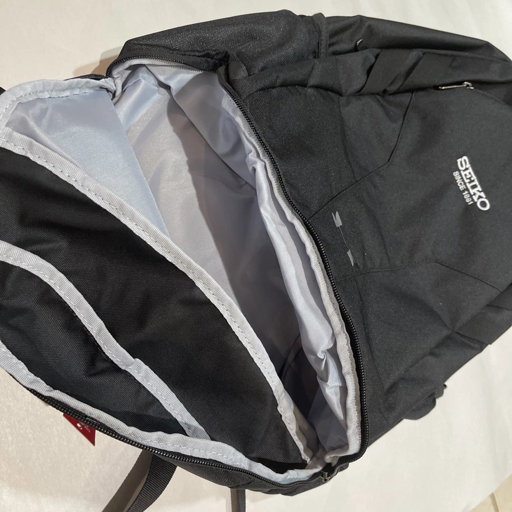 Under Armour Hustle 5.0 Backpack w/Promo SEIKO Black See Pics showing Details UA Storm technology delivers an element-battling, highly water-resistant finish Breathable air-mesh padded back panel & adjustable, HeatGear shoulder straps for total comfort Soft-lined laptop sleeve—holds up to 15" MacBook Pro or similarly sized laptop Water-repellent front valuables pocket to keep your stuff safe Large, gusseted front laundry/shoe pocket placed at bottom of bag Brand New