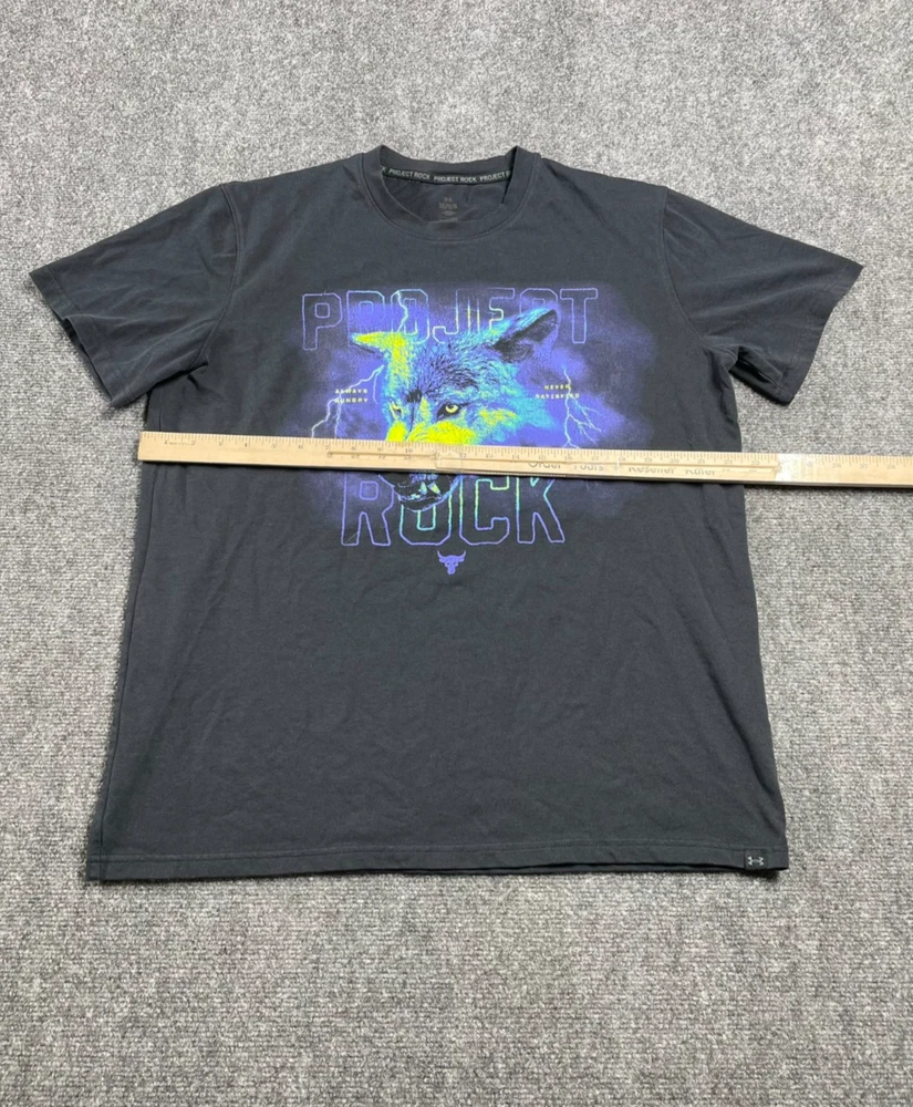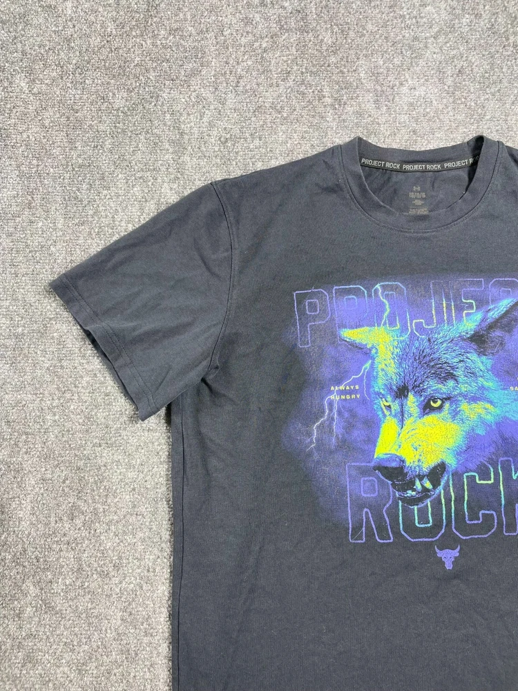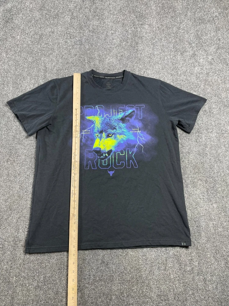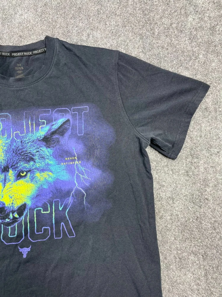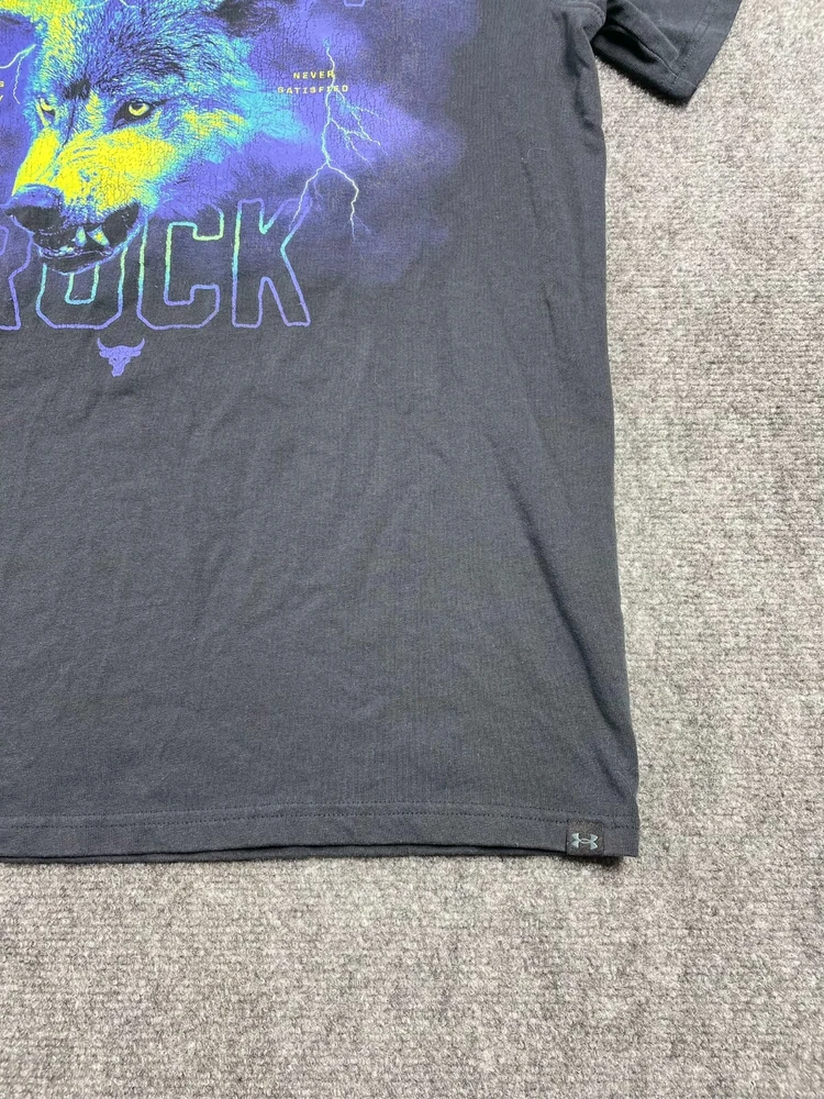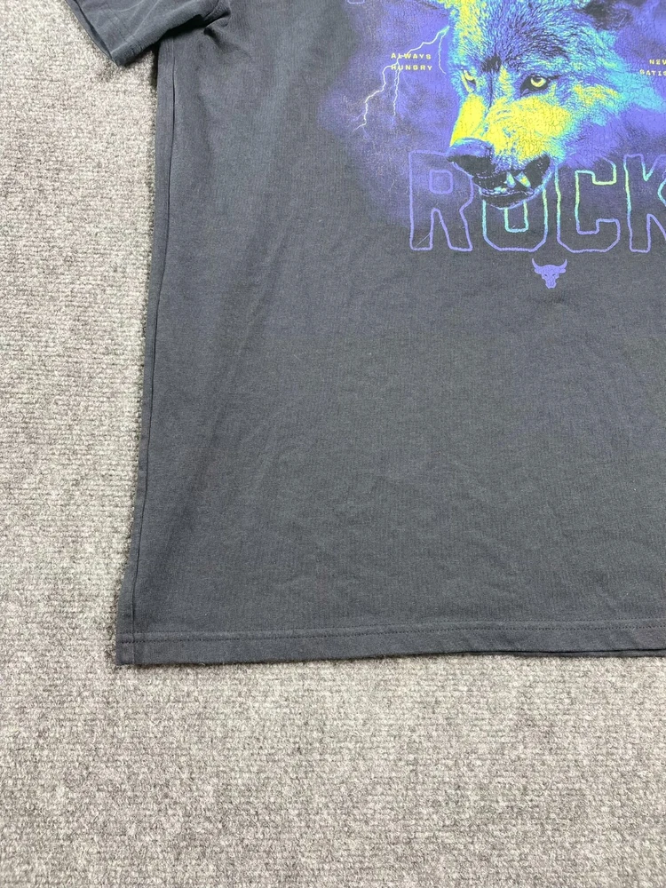 This Under Armour men's t-shirt is a must-have addition to your wardrobe. Featuring a graphic print with the character Rock and a wolf theme, this heavyweight shirt is perfect for any occasion, whether you're traveling, working out, or just running errands. Made of a blended fabric of 60% cotton and 40% polyester, this shirt is machine washable and has a regular fit. With a crew neck and short sleeves, this shirt is ideal for summer, fall, or spring. It has a pullover closure and is available in size L. The shirt is designed for various activities, including rugby, cycling, hunting, and more. It is a part of the Under Armour Project Rock product line and is suitable for men who love 80s and 90s fashion.
