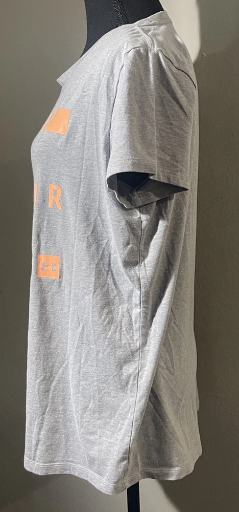 This is a women's Under Armour T-shirt in size large, featuring a solid heather gray color with a peach logo accent. The shirt has a crew neck, short sleeves, and a pullover closure. It is part of the Under Armour HeatGear product line, designed for activities like gym training, cross training, and bodybuilding. The T-shirt is made from breathable fabric, suitable for all seasons, and is machine washable for easy care. Perfect for casual wear or activewear, this modern and sporty top offers a comfortable fit for various physical activities.