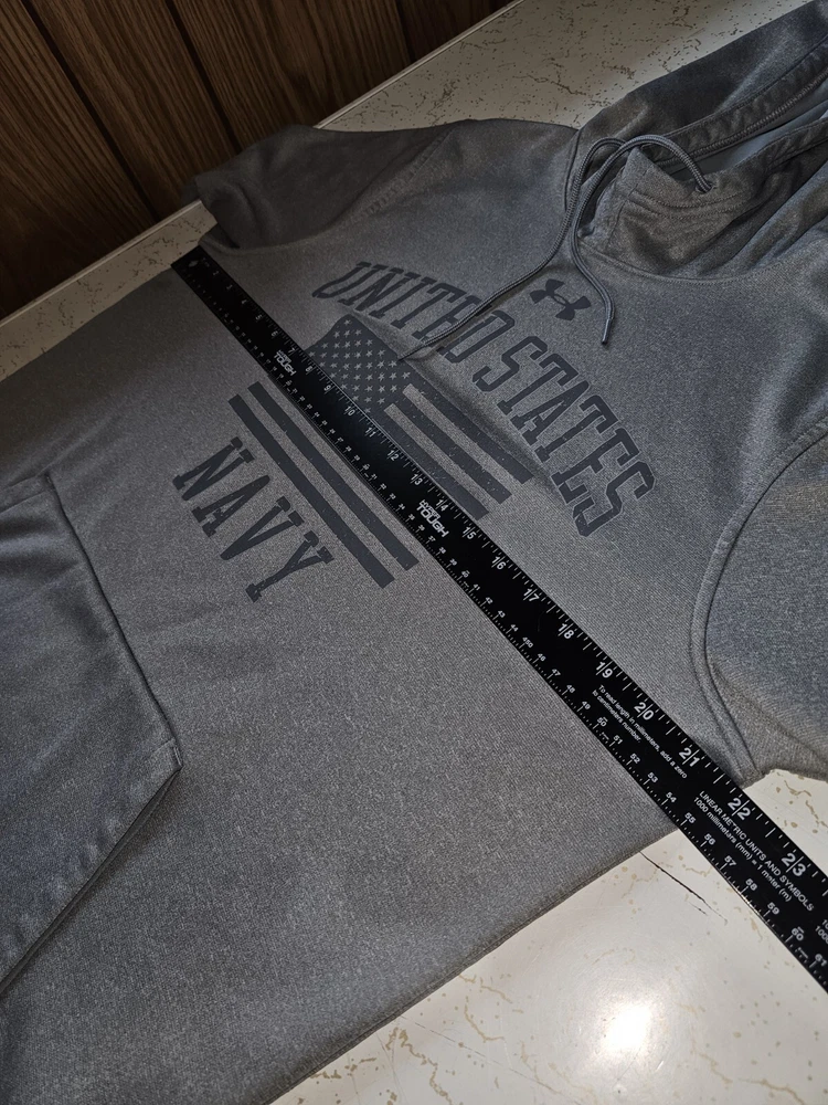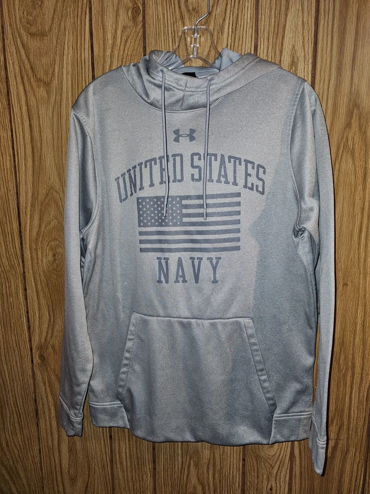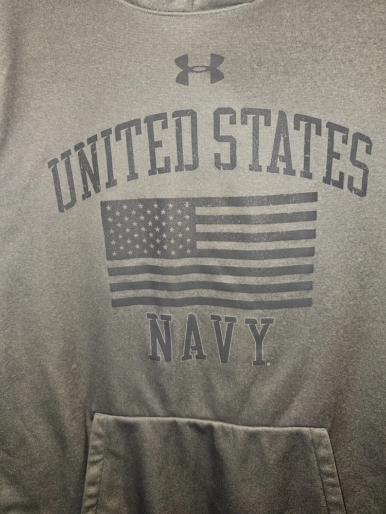 This Under Armour hoodie is a must-have for any activewear collection. Show your support for the United States Navy with the bold graphic logo on the chest. The hoodie is made of high-quality materials to ensure maximum comfort and durability. The gray color is versatile and perfect for any outfit, while the accents of the logo add a unique touch. This hoodie is perfect for women who enjoy an active lifestyle and want to stay comfortable while showing their pride in the Navy.