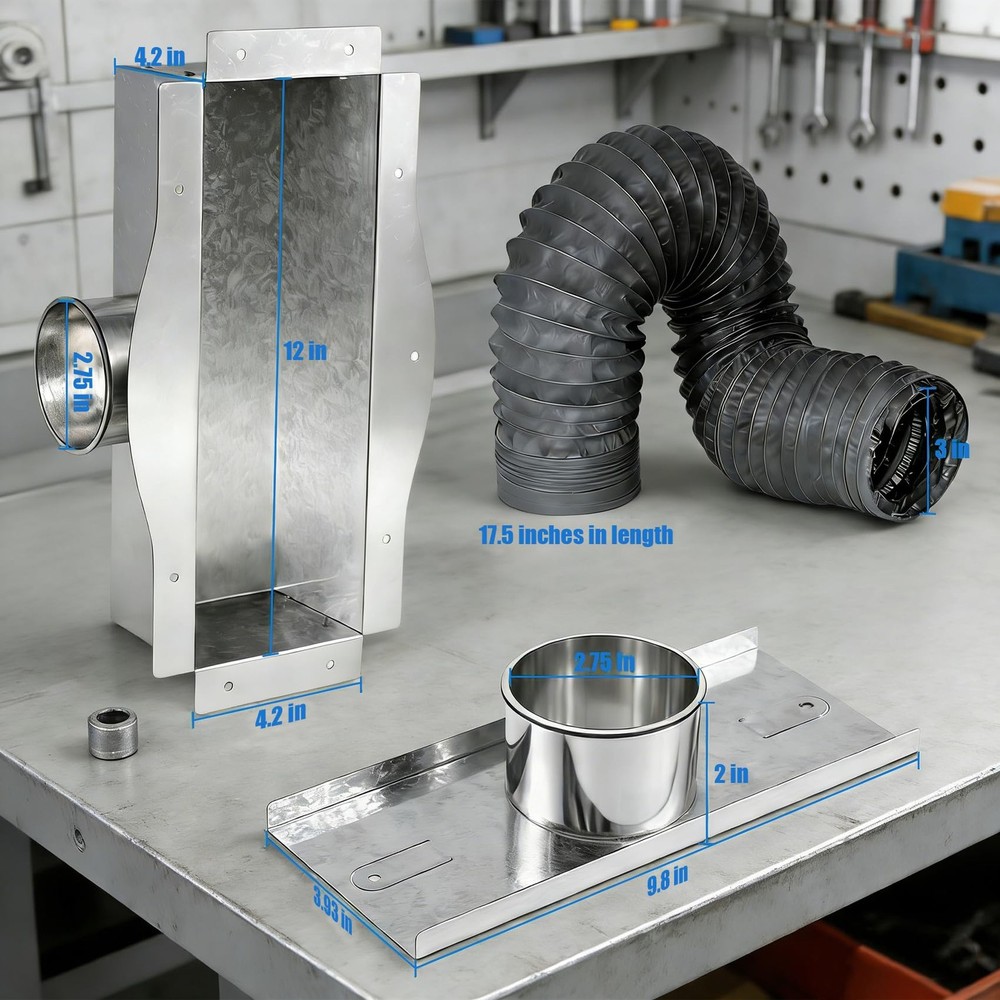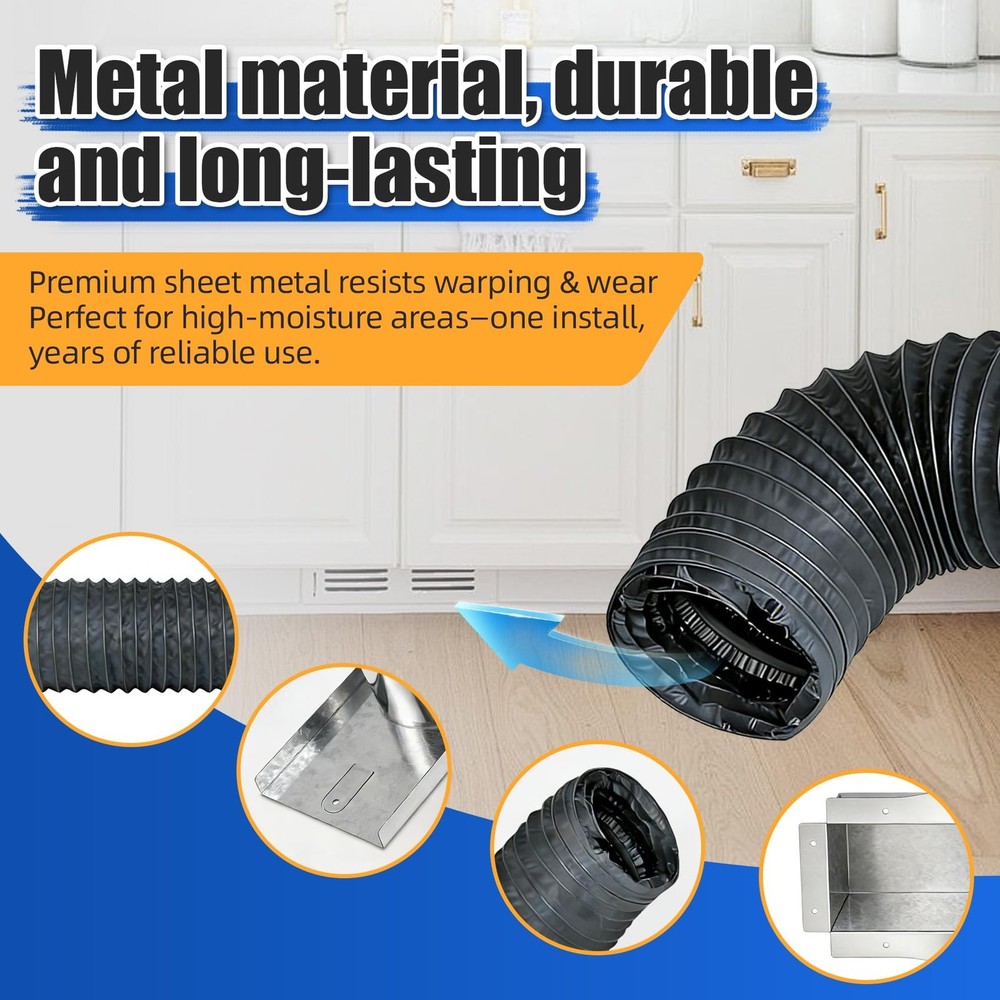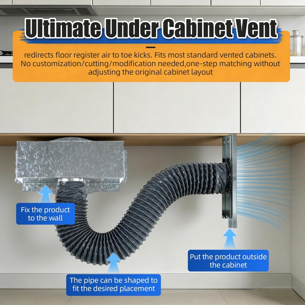 Upgrade your home’s heating and cooling system with this versatile Under Cabinet Toe Kick Ducting Kit. Designed for standard 4” cabinet cavities, this kit works seamlessly with 4x10”, 4x12” floor vents and 6” round supply ducts, making it suitable for most kitchen, bathroom, and residential under-cabinet HVAC setups. Featuring a user-friendly design, this duct kit allows for fast, tool-free DIY installation, so you can complete the setup quickly without professional assistance. The sealed airflow structure minimizes air leakage, improves HVAC efficiency, and helps maintain consistent room temperatures while cutting down on energy waste. By directing air efficiently beneath cabinets, the kit reduces excess moisture buildup, keeping the area dry, clean, and free from potential damage. Built to last, this durable toe kick duct kit delivers reliable long-term performance and enhances overall home comfort. Ideal for homeowners, renovators, and DIY enthusiasts, this all-in-one ducting and vent cover kit provides a practical, cost-effective solution for optimizing under-cabinet ventilation. Easy Installation:No extra tools or professional installation skills required;simply connect it to your floor register and toe kick air outlet,and complete the setup in minutes.Unlike traditional duct kits that need on-site assembly,it saves you valuable time and costly labor fees Airtight Seal & Enhanced HVAC Efficiency:Creates an airtight seal between the floor register and toe kick vent.Prevents air leakage into cabinet cavities,reduces energy waste and boosts HVAC system efficiency.Effectively stops the loss of cold/hot air,making your heating and cooling systems operate far more efficiently Wide Compatibility:Fits most standard vented cabinets.No customization/cutting/modification needed,suitable for residential (kitchen/bathroom) & commercial cabinetry,one-step matching without adjusting the original cabinet layout Directed Airflow Improves Indoor Comfort:Guides airflow to release evenly from the toe kick, eliminating uneven temperature distribution caused by direct blowing from floor vents. Optimizes the airflow path of your HVAC system, ensuring heated or cooled air reaches living areas directly, enhancing overall indoor comfort. Reduces energy consumption and lowers long-term utility bills Durable Metal Construction for Long-Lasting Use:Crafted from high-strength metal sheets with a corrosion-resistant coating,this vent kit is built to resist deformation and wear,Boasts a long service life.The flexible duct hose can be bent to fit different installation paths while maintaining good airtightness.Sturdy structure withstands long-term cabinet pressure without loosening or damage