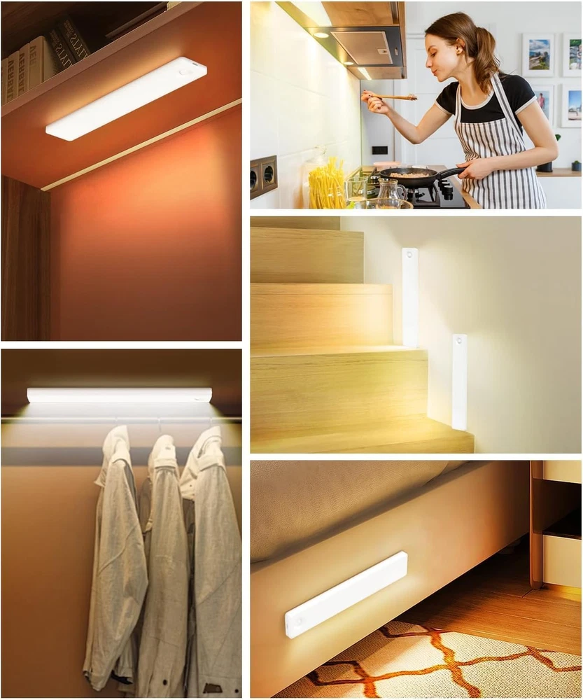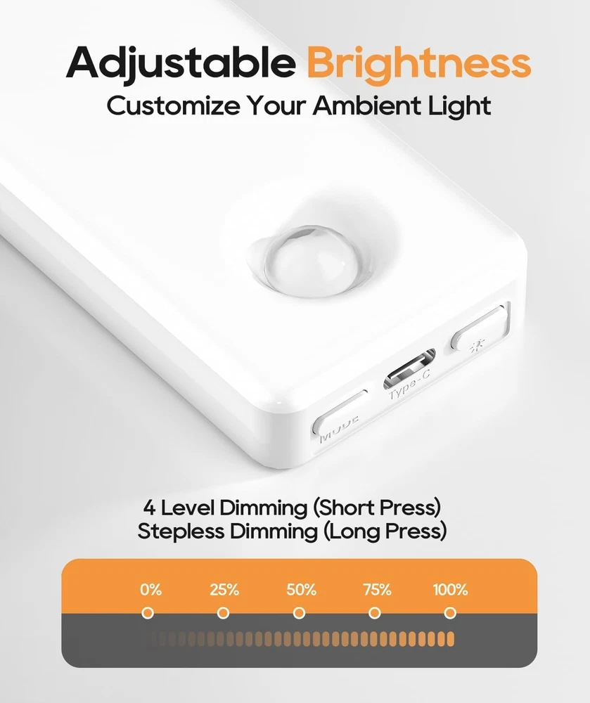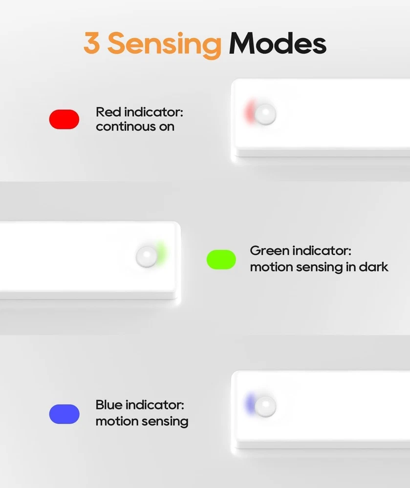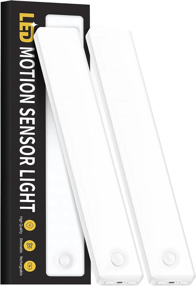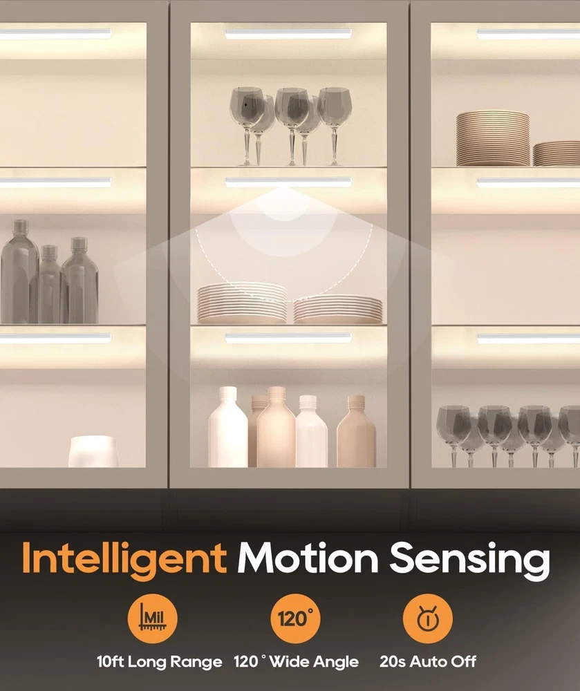 Smart Motion Sensing Technology: With a 10-foot, 120-degree sensing range, our motion sensor light indoor activates upon detecting movement, providing hands-free convenience. After 20 seconds of no motion, it automatically switches off to conserve energy. Eye-Care Gradual Brightening: Our under cabinet lights gradually brighten to avoid sudden glare, providing gentle illumination that safeguards your eyes. 36 Straight-Emitting LEDs: Compared to side-emitting, our under counter lights for kitchen offer higher luminous efficiency and greater energy savings, ensuring superior brightness while consuming less power. Long-lasting Illumination: Featuring a high-capacity battery, our rechargeable battery operated lights offer up to 60 days of continuous use in sensor mode, addressing your need for lighting without frequent charging. 4 Lighting Modes: Choose from four versatile modes: always on, day, night, and off. Day mode activates when motion sensed in all light conditions, night mode activates when motion sensed in low light conditions, ensuring energy efficiency and light only when you need it. Adjustable Brightness Levels: According to your preference, tap for 4-level dimming from 25%, 50%, 75%, or 100% brightness options, long press for seamless dimming adjustment, providing the perfect under cabinet lighting for any occasion. Effortless Installation: Equipped with built-in magnets and additional adhesive metal plates, our step lights can be easily mounted on any surface with no tools required. Enjoy enhanced lighting in minutes wherever you need illumination. Versatile Application: Perfect for under cabinet lighting wireless in kitchens, wardrobes, bedrooms, stairwells or hallways, enhancing every corner of your home. Sleek, Ultra-Thin Design: Our latest generation led lights for bedroom features a full-screen, ultra-thin design at just 0.39 inches thick, blending seamlessly into your home decor. Product Description Motion Sensor Under Cabinet Lights Add to Cart Add to Cart Add to Cart Add to Cart Add to Cart Customer Reviews 4.5 out of 5 stars 2,844 4.5 out of 5 stars 2,844 4.5 out of 5 stars 2,844 4.5 out of 5 stars 206 4.5 out of 5 stars 206 Price $9.49 $ 9 . 49 $14.98 $ 14 . 98 $19.98 $ 19 . 98 $17.98 $ 17 . 98 $23.99 $ 23 . 99 Length 8 inch 8 inch 12.7 inch 8 inch 12.7 inch Light Color Bright White Soft White Soft White 3 Color Temperatures 3 Color Temperatures Brightness 105 Lumen 100 Lumen 162 Lumen 100 Lumen 162 Lumen Light Sources 36 LED 31 LED 56 LED 62 LED 112 LED Battery Capacity 2000mAh 2200mAh 3200mAh 2200mAh 3200mAh Power Source Rechargeable Rechargeable Rechargeable Rechargeable Rechargeable Mounting Type Wireless Wireless Wireless Wireless Wireless