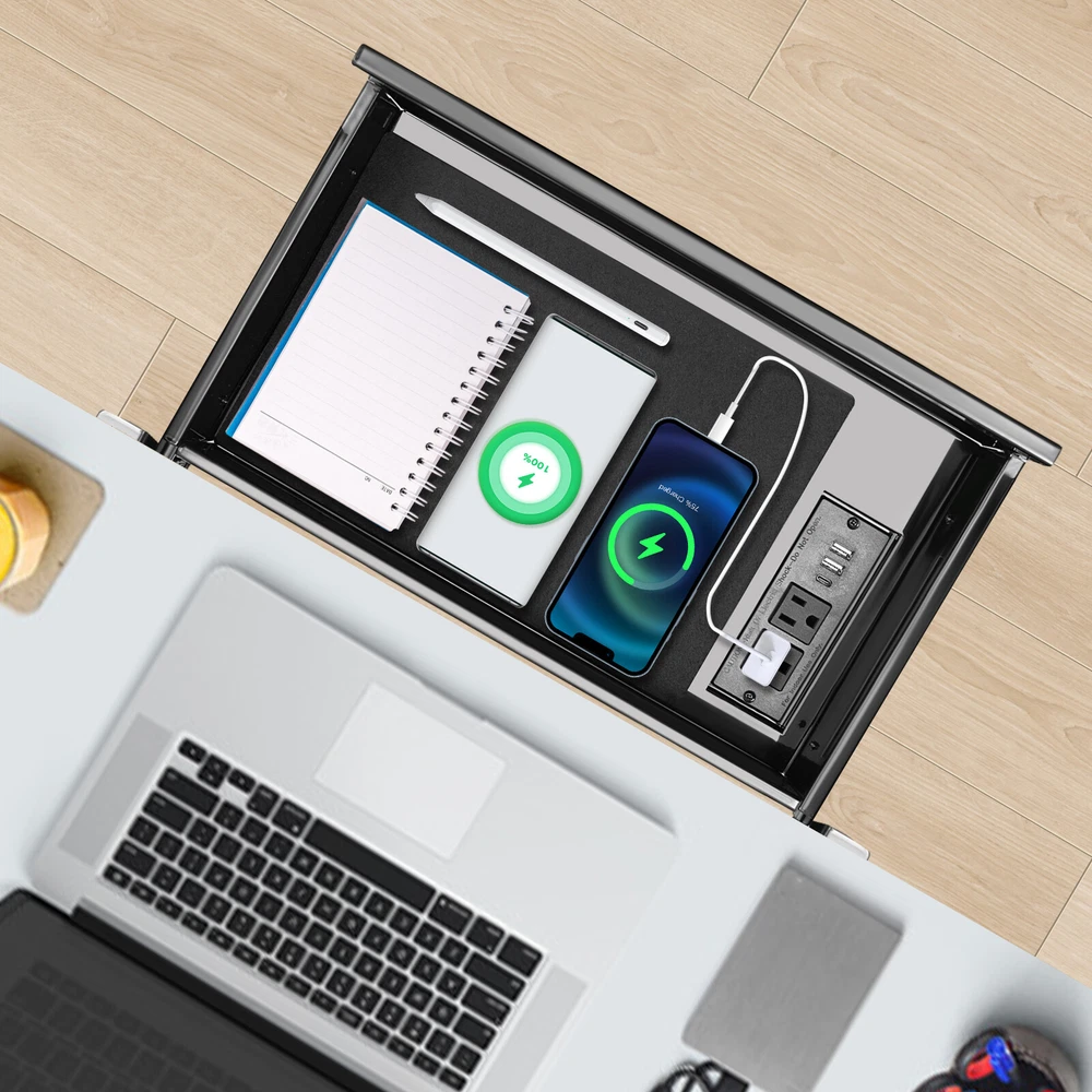 Under Desk Mounted Sliding Pull-out Storage Drawer with Built-in Power Strip Description This under-desk storage drawer with a power supply is hidden under the desk board, cleverly utilizing space to expand your storage space and improve your office experience. It comes with a power supply inside, allowing you to charge conveniently and making wires less cluttered. The sliding drawer design makes it easy to access or store items, keeping your work desk organized and making your daily work more efficient. Key Features Sturdy and Durable: The high-quality iron and welding and plastic spraying processes give the product high hardness, long service life, and good resistance to corrosion, rust, wear, and deformation. High-load Bearing: The sturdy brackets, strong screws, and thickened plates give the product a strong structure to hold 4.4 lbs items. Excellent Under-desk Storage: The under-desk mounting allows it to make full use of space, providing you with 14.3*8.7*4in of interior space, allowing you to easily store your files, notebooks, and small items. Thoughtful Design: The 1500W power strip comes with two jacks, 2 USB ports, and a type-C port making it easy for you to charge small electronics such as cell phones and tablets while keeping them and their cables organized. Convenient Design: The pull-out design allows you to easily access and store your belongings, allowing the drawer to be hidden under the table without detracting from the appearance of your table. Simple Installation: The pre-drilled holes and needed accessories allow you to quickly and easily finish the assembly and installation. Easy to Clean: The simple structure and smooth surface allow you to easily clean it with a soft cloth. Customer Service: We aim to provide quality products and services. If you have any problems, please feel free to contact us. We will reply and solve the problem for you as soon as possible. Details Soft Mat: It can be laid inside a drawer to provide a soft and cozy layer of protection for your belongings. Long Power Cord: The 6.56ft power cord allows you to install it with less distance limit. Application The product can be used in indoor environments such as homes and offices for paper, writing utensils, office supplies, electronic equipment, and other items. Specifications Color: Black Material: Iron Shape: Rectangular Mounting Type: Under Desk Mount Process: Welding, Plastic Spraying Assembly Required: Yes Plug Standard: US Standard Power Supply: 110V-130V/12A, 1500W USB Output: 5VDC/2.1A Load Bearing Capacity: 2kg/4.4lbs Product Length(Including Brackets): 17.5in Product Width: 22.86cm/9in Drawer Exterior Length: 39.88cm/15.7in Drawer Exterior Height: 10.67cm/4.2in Power Cord: 2m/6.56ft Interior Dimension: 36.32*22*10.16cm/14.3*8.7*4in Usable Drawer Space: 29.46cm/11.6in Packaging Size: 42*25*6cm/16.54*9.84*2.36in Gross Weight: 3.5kg/7.72lbs Net Weight: 3kg/6.61lbs Package Included 1*Under-Desk Storage Drawer 1*Power Supply Strip 1*Soft Mat 1*Chinese Diagram Other Needed Accessories Notes Please check the size carefully before ordering. Please note that the product is intended for use in indoor environments only. Please make sure your desk can hold up to 11 lbs(drawer weight + weight capacity) before purchasing. Please read the safety precautions on the product label before use. Please allow the slight color difference caused by the shooting light and 1-3cm error due to manual measurement, and make sure you do not mind before you order. Welcome to our store for shopping!! ❤️❤️ Welcome to our store for shopping!! ❤️❤️ Payment Delivery details Terms of sales About us Contact us Payment We accept ebay payment 。 Fees such as import duties, taxes are not included in the item price or shipping costs. These charges are the buyer's responsibility. Delivery details Shipping: 2-9 working days to: USA Terms of sales We maintain high standards of excellence and strive for hundred percent customer satisfaction. Feedback is very important to us. We hope that you contact us immediately before you give neutral or negative feedback, so that we can address your concerns. It is impossible to address issues if we do not know about them! About us Your satis faction is our ultimate goal. We work hard to earn your trust and future business. Our certified technicians have tested each item before shipping. The unit comes with 1 year limited warranty on all manufacturing defects. a) If you receive a defective item, you may return it or ask for a discount. Please contact us within 14 days after you receive the package. b) What you returned must be intact and in its original packaging as re? u. Customer is responsible for shipping costs of the returned item. c) We will cover the cost of shipping back t with the shipping rate indicated in the registration page. We will send you a new unit or refund the full payment you paid. Thank you. Contact us Business Hour Business Hour: Monday To Friday: 8:30 AM to 5:00 PM (Beijing China time) Due to time zones, our reply to your questions may not be immediately. But within above working time, we will reply your email within 24 hours. If it's non-workdays, please kindly be patient and wait till Monday. Please contact us with ebay message. Please feel free to contact us if you have any questions. Monday To Friday: 8:30 AM to 5:00 PM (Beijing China time) Due to time zones, our reply to your questions may not be immediately. But within above working time, we will reply your email within 24 hours. If it's non-workdays, please kindly be patient and wait till Monday. Please contact us with ebay message. Please feel free to contact us if you have any questions. Brand OCASAMI Transportation does not include canarias *Feature**! Creative Design,Durable Material Type Under-Desk Storage Drawer Color Black Material Iron Shape Rectangular Mounting Type Under Desk Mount Process Welding, Plastic Spraying Assembly Required Yes Plug Standard US Standard Power Supply 110V-130V/12