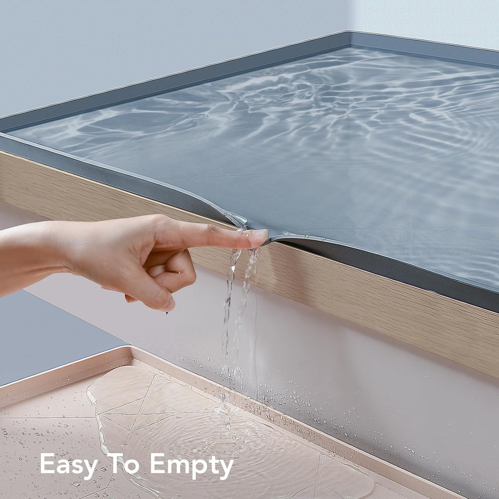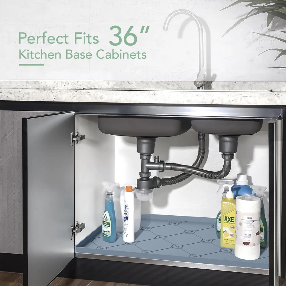 UNDER THE SINK MAT: This waterproof under the sink liner can protect your cabinet from damage caused by leakage, seepage, and chemical spills. It is a good investment to protect your cabinets FITS LIKE A GLOVE: The size of the SOONSURE under sink drip tray is 34’’ x 22’’ x 0.67’’, which is designed to fit most 36 inch kitchen and bathroom base cabinets. Pliable and thick silicone keeps it from warping or curling like PVC tray EASY TO INSTALL & CLEAN: Flexible silicone allows you to easily fit this waterproof tray under your kitchen or bathroom sink and quickly remove for cleaning. Keep your cabinet dry & clean EDGE REINFORCEMENT DESIGN: This under sink mats and protectors has a reinforced lip around the edge to contain spills. Holds up to 2 gallons water, buying you more time to address a leak. Great for rental properties and vacation homes MULTIPURPOSE: This under sink drip pad pan are not only suitable for kitchen and bathroom cabinets, but also for crafts, pets, laundry, dishwashers or wine cabinets and other occasions to prevent stains and spills Product Description Widely Application: This large waterproof silicone pad can be used as craft mat, work mat, pet feeding mat or silicone mat for counter top , etc. SOONSURE Under Sink Cabinet Mat WHY CHOOSE US? Long lasting, buy once and lasting protection Gives some peace of mind should a plumbing leak occur Safe to use, No odor, No VOCs, non-toxic, or off-gassing 0.67" tray edge is more friendly to sliding storage drawers Keep the area under your kitchen sink dry and clean Under Sink Drip Tray Product material: 100% food-grade silicone Product size: 34 inch x 22 inch x 0.67 inch Suitable for: Standard 36" wide cabinet Temperature Resistance: -20℉~446℉(-30℃~230℃)