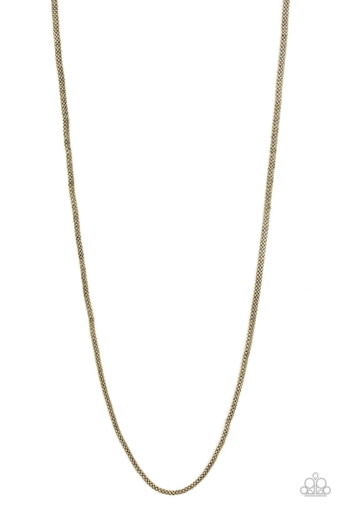 Underground - Brass - Paparazzi Accessories Men's Necklace Item ID Number: 446 Color Brass Description Brushed in a high-sheen finish, a shimmery strand of brass mesh chain drapes across the chest for a sleek look. Features an adjustable clasp closure. Sold as one individual necklace. Additional Images