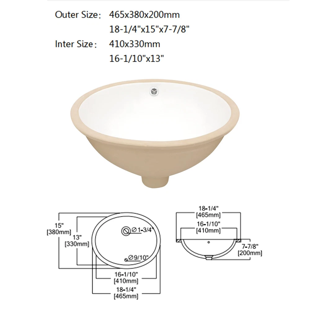 Sleek and contemporary Oval undermount bathroom sink, offering modern, elegant and glamour to update lavatory bathroom. This bathroom sink is crafted with high grade ceramic porcelain, specially designed for impact-resistance. This oval bathroom sink has a smooth, non-porous surface with a baked-on glaze for added durability and a high-gloss finish. Simply wipe the sink surface with a damp cloth to keep it looking beautiful with minimal maintenance. Ceramic bathroom sink Exterior Dimension: 18-1/4" x 15" x 7-7/8" ; Interior dimension: 16-1/10" x 13" . Under counter installation, easy to install, 1-3/4" drain opening as standard to match universal drain set. Faucet and sink drains are not included in the package. Commitment: We always put our customers first and are here to help you at any time. If you have any questions or concerns, we will respond within 12 hours.