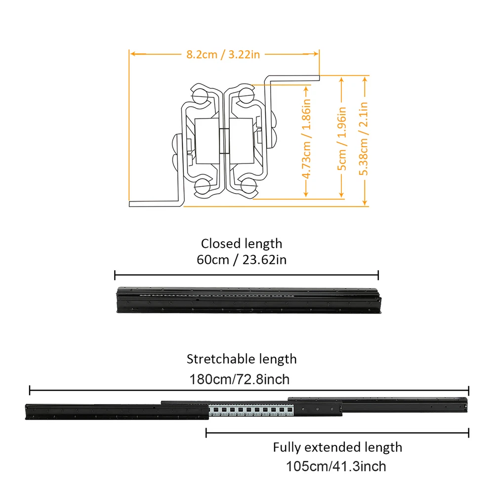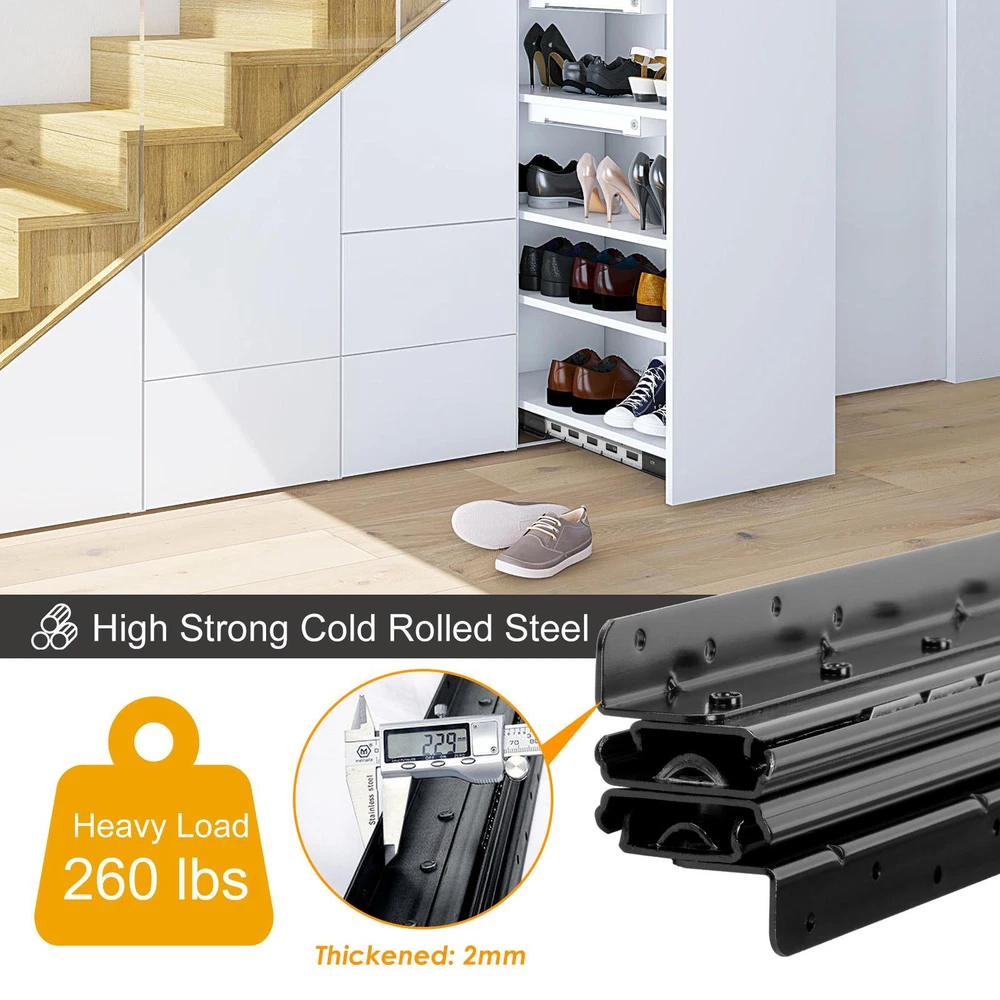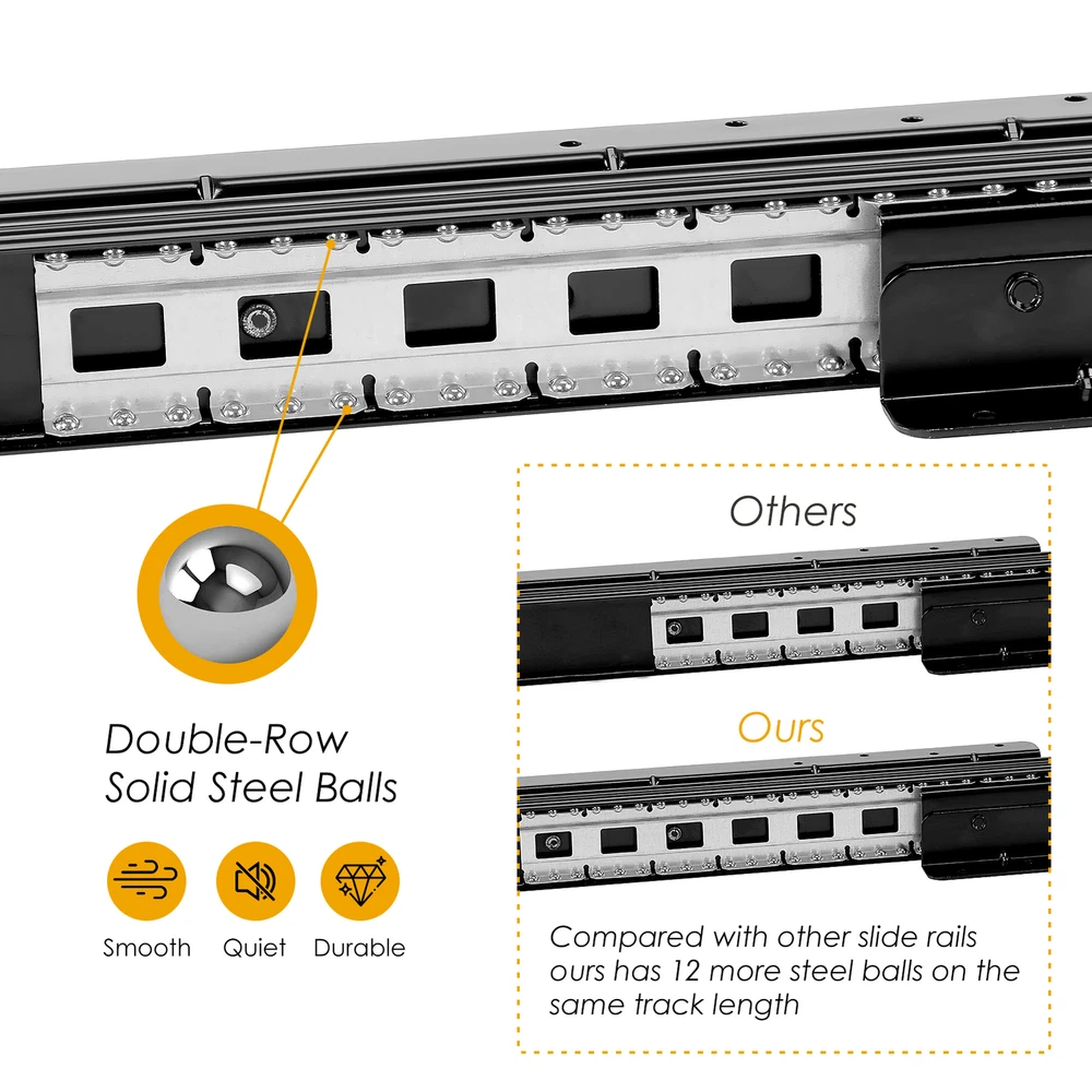 Store category Sign Up Now ! You may also like Product Description Bullet Points: Built to Last: These undermount drawer slides are made of high-density, high-strength 2mm thick cold-rolled steel and feature industrial-grade solid steel balls for long service life, making them capable of handling heavy loads up to 265lb Maximizing Efficiency: Electrophoretically treated to minimize friction, this undermount drawer slide features industrial-grade, rust-proof solid steel balls for quieter sliding Seamless Access: The undermount drawer slides can be fully pulled out, providing enough space for you to easily screw in stairs during installation. With a larger storage area, you can efficiently organize and access all items in your drawer with ease, making the most of your available space Smooth Slide: With 12 additional steel balls on the same length of track and anti-collision silencers, our undermount drawer slides provide a smooth and gentle sliding motion. Strong and not easily jammed, these slides make opening and closing drawers labor-saving while eliminating noise Seamless Functionality: Expertly crafted to fit sundry cabinets, wine cabinets, stair cabinets, and any tall or heavy storage cabinets, these bottom-mounted drawer slides assure seamless opening and closing With a heavy load capacity of up to 265lb and full extension, they minimize friction resistance and are strong enough not to get stuck. Say goodbye to frustrating drawers and get the smooth sliding experience you deserve! Specifications: Product name: Heavy Duty Drawer Slides Product size: A about 600 mm/23.62 inches B about 800 mm/31.5 inches C about 1000 mm/39.37 inches Stretching range: 600-1450/800-1850/1000-2250 mm Maximum load: about 120kg/264.6lbs Packing quantity: 1 pair Color: Black Track width: about 94mm/3.7 inches Packing List: 2* Cabinet Drawer Slides 2 packs* Screws Notes: 1. Due to different lighting and screen settings, the item color may be slightly different from the picture. 2. Due to different manual measurements, please allow a 1-2cm difference in size. Payment Delivery details Terms of sales About us Feedback & DSRs Payment Before you palce an order, please kindly make sure that you have a paypal account. We accept PAYPAL payment only. Payment should be completed within 2 days after auction closed, or unpaid dispute will be filed for an closing auction. An unpaid case will be filled after 4 days. Delivery details We ship to your eBay address. Each package will be shipped to US by UPS Regular Parcel with tracking number. Please check your shipping address carefully before checkout, it can't be changed if order completed. All items will be shipped within 1-2 business day upon receipt of payment.Orders placed on weekend will be shipped within 3 days. If you do not receive your item in 7-10 business days.please contact us immediately for further assistance. We will be responsible for any damages or losses incurred in the shipping process. About us We maintain high standards of excellence FIVE STAR and strive for 100% customer satisfaction! Positive Feedback is very important to us. We hope that you contact us immediately Before you give us neutral or negative feedback, so that we can satisfactorily address your concerns. We promise to offer the lowest price and high quality produce. Our working time: From Monday to Friday(9:30 am to 18:00pm), we don't working on holidays ,hope you can understand and know that , thank you. Please always talk to us via ebay Message. We appreciate your business and look forward to growing our e-Bay sales with satisfied customers. Feedback Contact us If you have any questions, please feel free to contact with us by ebay Message during our business hours ( 9:30a.m. to 5:30 p.m.), or email us through eBay, we will try our best to help you to resolve it. For any presale or after-sale questions,please do feel free to email us! Due to the time difference, each email will be replied within 1 working day,and weekend will be delayed a bit. Feedback