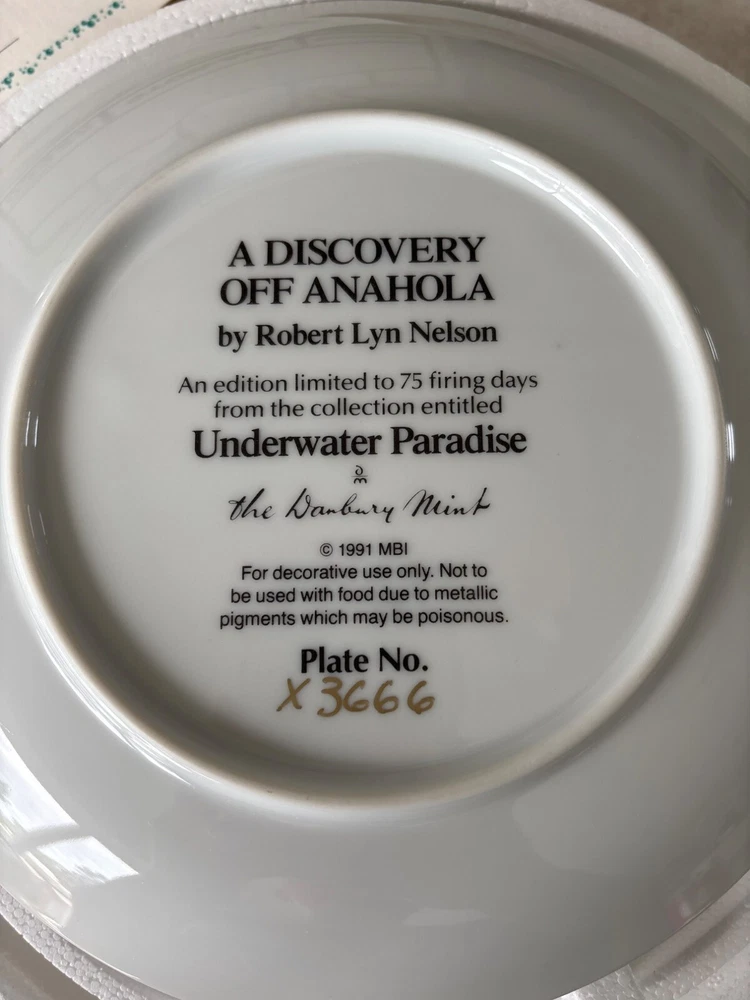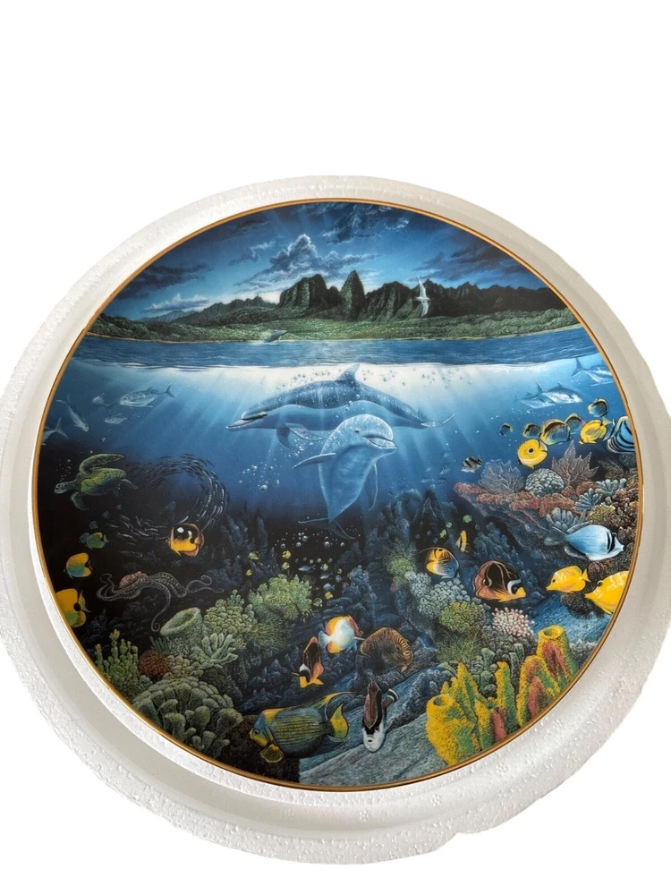 This exquisite porcelain plate features the stunning artwork of Robert Lyn Nelson, capturing the serene beauty of marine life. Part of a limited edition, this collector's piece is a testament to craftsmanship and artistry. It's a timeless addition to any fine art collection. • Diameter: 10.5 inches • Material: 23K gold rim • Limited edition of 75 firings • For decorative use only • Includes certificate of authenticity Condition: Pre-Owned Like New Like new condition with certificates. NO Major damages "Power Selling Mom Consignment"