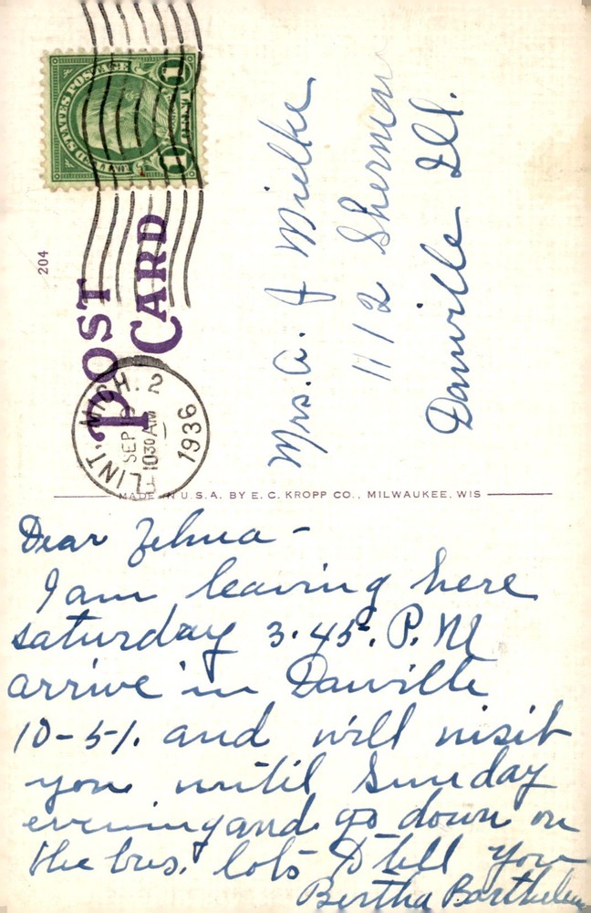 Postcard with a view of the Union Industrial Building in Flint, Michigan. Message from Mrs. G. & Mielke to Zehna about visiting Danville. Plans to arrive on Sunday evening by bus.