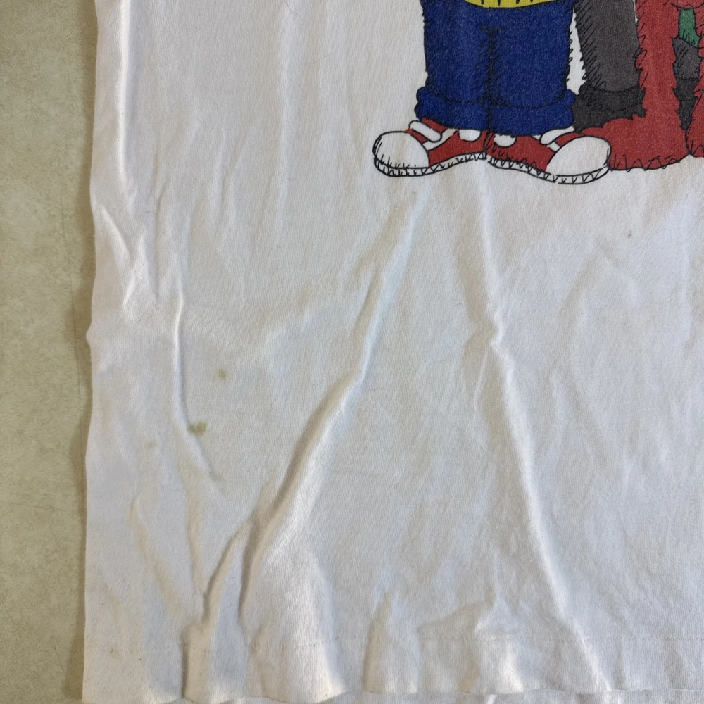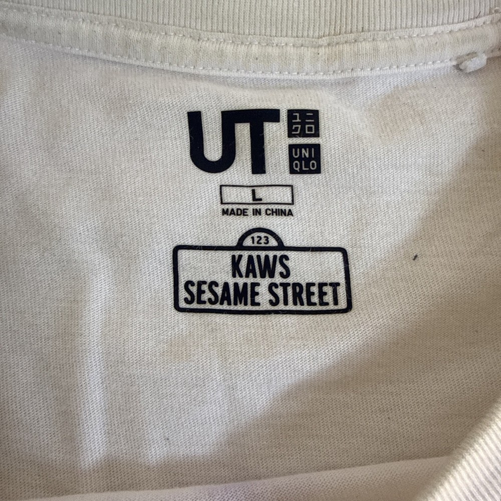 The Uniqlo Kaws Sesame Street Shirt is a classic white t-shirt featuring a distressed graphic print of Kaws x Uniqlo collaboration. Made of cotton with a crew neckline and short sleeves, this regular fit shirt is perfect for men in size large. The logo accents on the shirt add a cool and trendy touch to this popular streetwear piece, making it a stylish addition to any wardrobe. SKUH