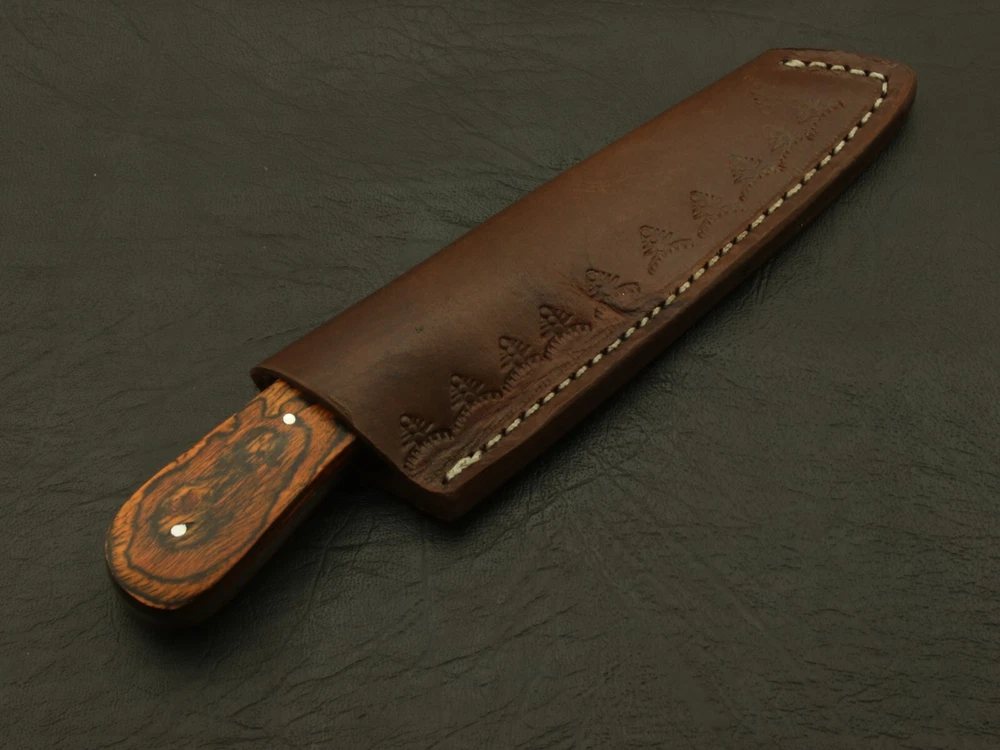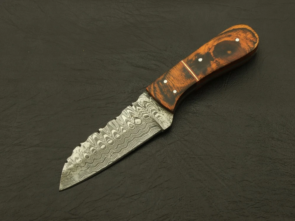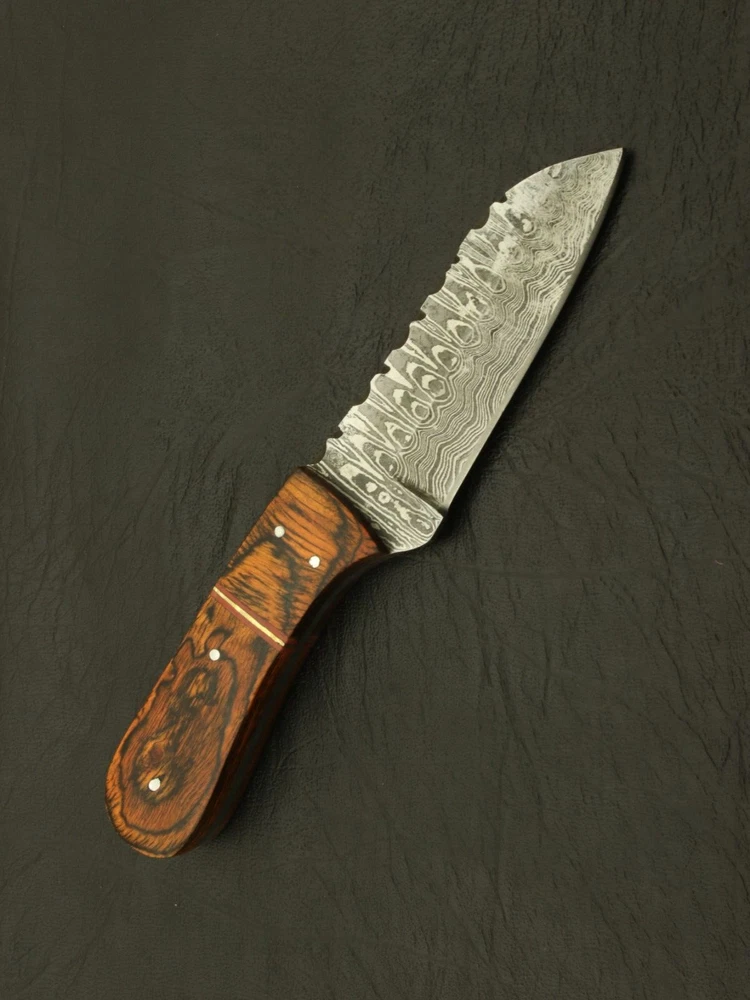 Classy Custom Handmade Classical pattern Damascus Steel Hunting/skinning Knife If you’re looking for a fixed blade knife that will be a reliable companion, look no further! This knife epitomizes the bold. The main qualities that make it great: sturdiness, sharpness, and looks. The ergonomic design is easy to hold and carry with the included leather sheath. Great for survivalists, tactical personnel, outdoors-men or anyone who appreciates fine craftsmanship and an amazing blade. The blade is Damascus steel, Cutting edged, and classical sharp. It's sturdy enough to last through even the harshest conditions. The handle is beautifully polished, with real rose wood & pakka wood . Designed to feel comfortable and natural in the hand. Even in different conditions, you'll feel confident that the knife will stay firmly within your grasp. Included with the knife is a genuine leather It's brand · Overall Length: 7” · Blade Length: 3.5” · Handle Length: 3.5” Handle is made of rose wood & pakka wood Care Instructions: Keep the blade dry after each cleaning. Warning: Take care when removing product from packaging. Keep fingers clear of blades. Store away from children. Complimentary gift messages *Gift wrapping service available for minimal additional fee ADD ONS: *Custom orders for 10 or more pieces. You can choose & submit your own handle or design. LIFETIME WARRANTY No premium knife is complete without a lifetime warranty; our masterpiece knife is fully covered for life, We do sell wholesale, please contact us for special discounts on bulk orders. FEEDBACK POLICY: YOUR FEEDBACK IS VERY IMPORTANT FOR US, IF THEIR IS ANY KIND OF PROBLEM PLEASE GIVE US OPPORTUNITY TO SORT THE ISSUE