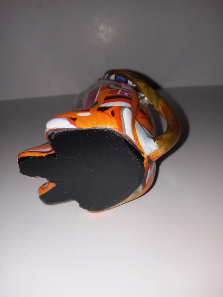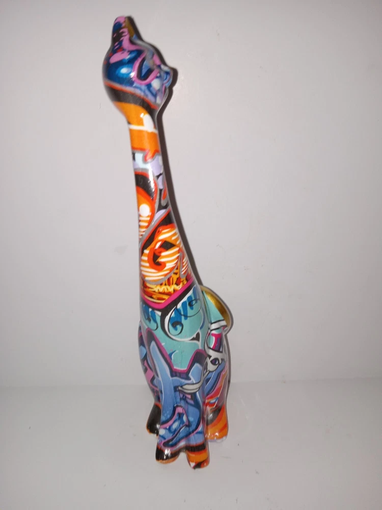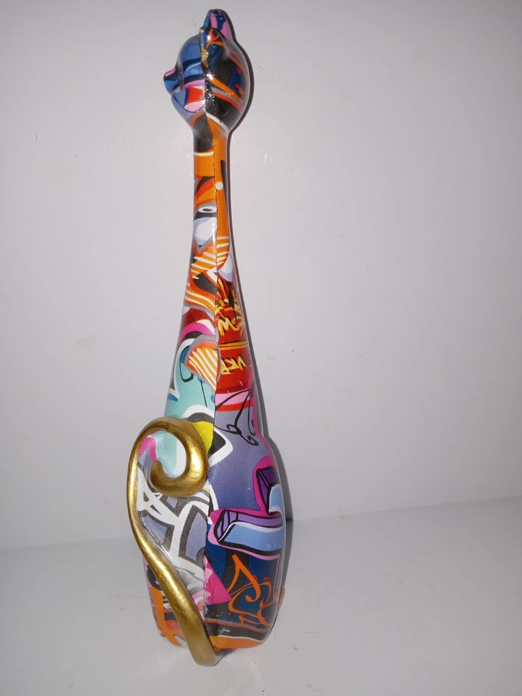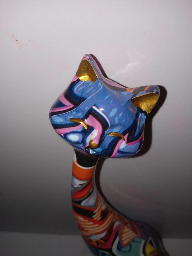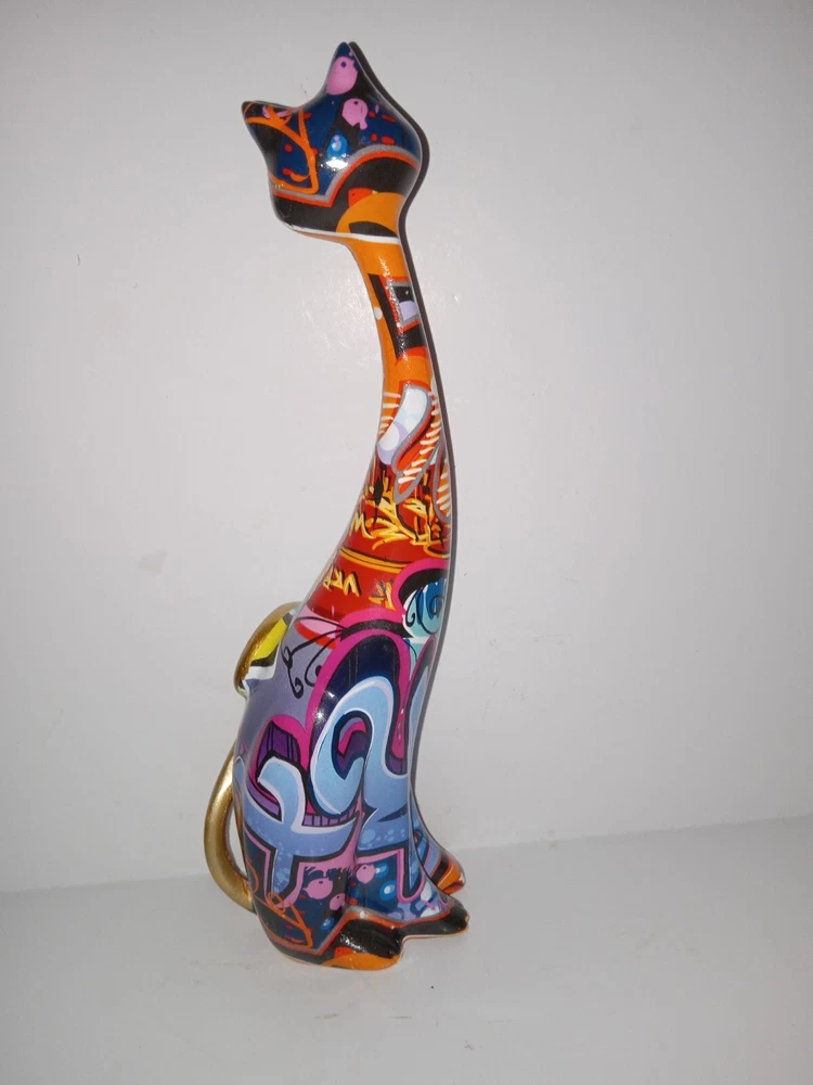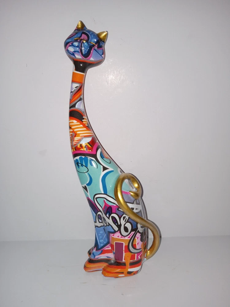 This unique figurine will add a touch of creativity to any home décor. The abstract painted cat resin statue stands at 9 inches long and features a colorful and eye-catching design. The statue is perfect for those who love cats and want to showcase their love for their furry friends. The statue is made of high-quality resin and will last for years to come. This statue is a great addition to any sculpture or figurine collection and is sure to be a conversation starter. Great condition.