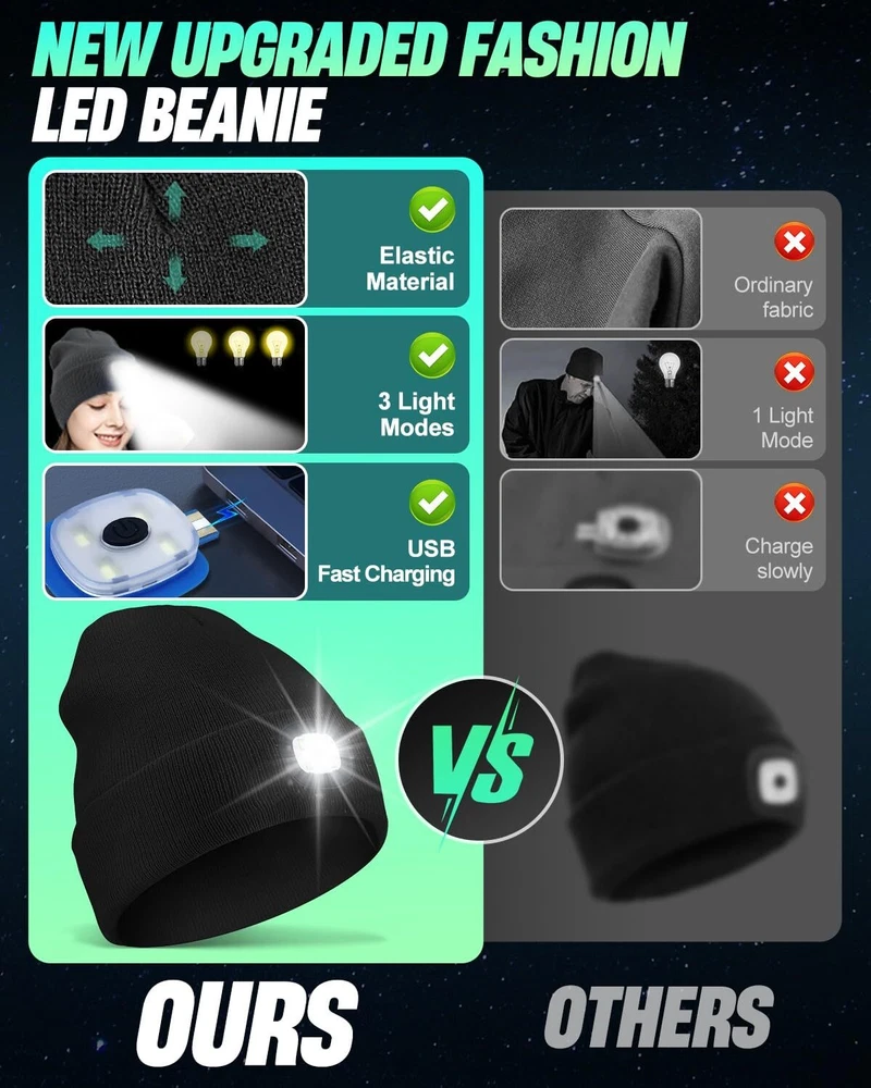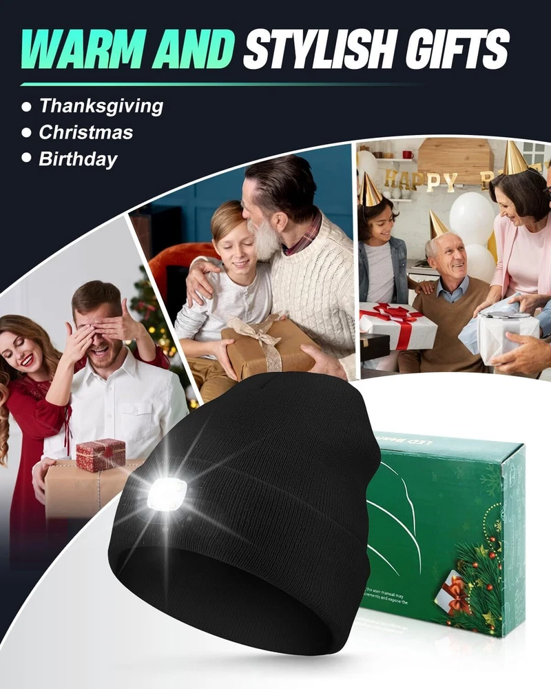 [Ideal Gifts] - This versatile led beanie is suitable for both men and women, making it a unique gift option for occasions like birthdays, Thanksgiving, Christmas, and more. The led hat is a great winter gift for anyone, including parents, grandparents, partners, friends, and siblings. [Universal Fit]-Crafted from stretchable materials, this hat light offers a comfortable fit for heads of all sizes, from small to large, and even those with unique shapes. The headlamp beanie design allows for easy wearing and removal, providing flexibility and adaptability. This led beanie light is a unisex style that suits both men and women. [USB Rechargeable]-Equipped with a built-in light, this beanie light features a standard USB port for convenient battery charging. You can effortlessly charge it using a car charger, computer, or portable power bank. Once fully charged, the headlamp hat provides up to 6 hours of continuous lighting, with a charging time of approximately 2 hours. [Adjustable Brightness]-Enjoy the convenience of three adjustable lighting modes with this beanie headlamp. A simple touch of a button in led beanie hat with light allows you to switch between low, medium, and strong light settings in the led beanie hat with light , giving you the flexibility to customize the intensity based on your needs. [Widely Used]-This hands-free hat with light is an ideal companion for various winter outdoor activities. Whether you're camping, fishing, hiking, climbing mountains, hunting, or clearing snow, this knit hat with light for men will keep you cozy while providing practical illumination.