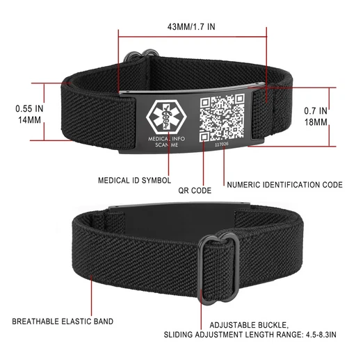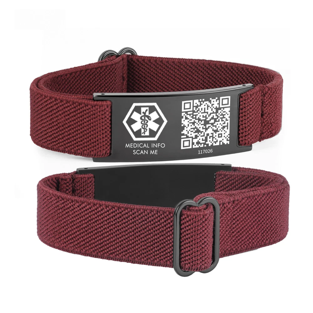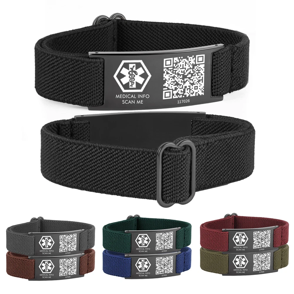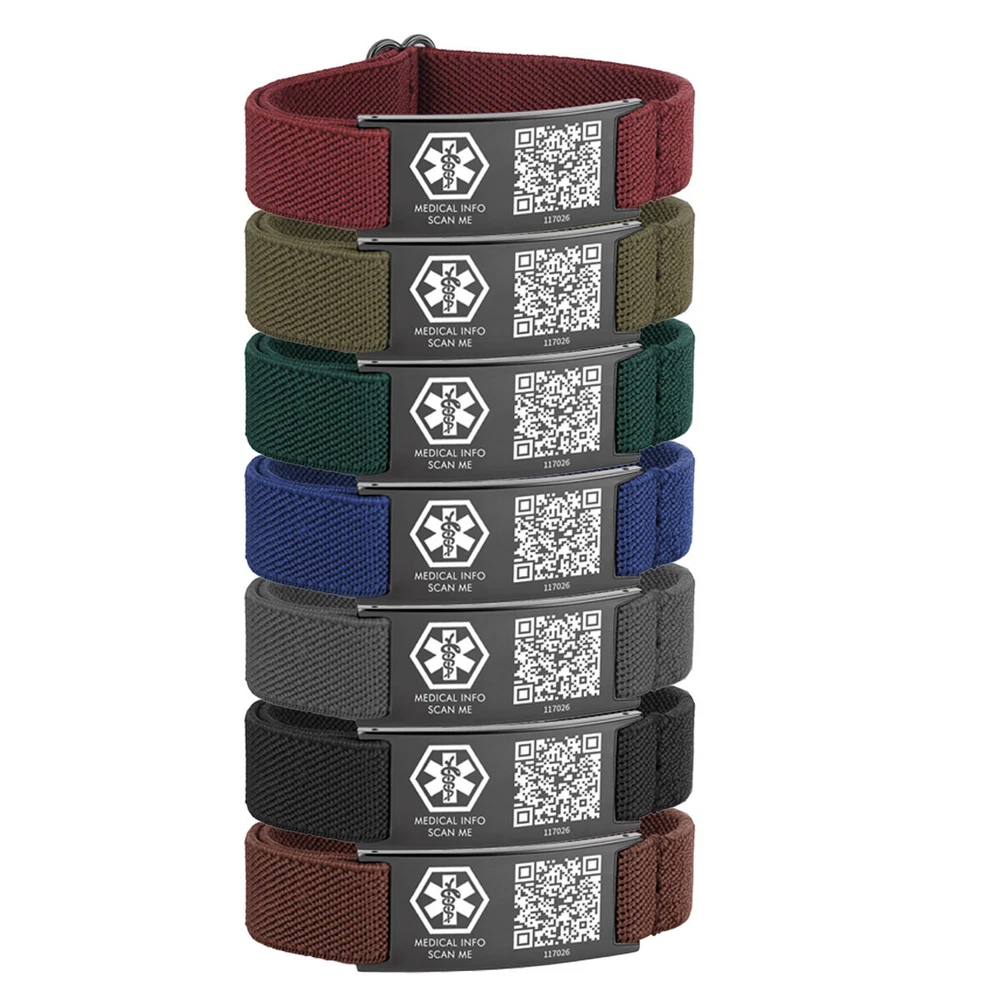 Nylon QR Code bracelets available in 7 colors. These bracelets are comfortable and has a breathable elastic band that slides to adjust for a wide range of sizes. Range is 4.5"-8.3". Band Width is 14mm, Tag is 18mm wide. Unisex style and will work for all ages, Kids included! If you have a large amount of medical information this bracelet is for you! Many features include: Medical Emergency Information: This bracelet incorporates cutting-edge QR code technology to securely store comprehensive medical information, significantly exceeding the capabilities of traditional engraved tags. Simply scan the QR code to access a detailed emergency medical profile for swift and accurate information retrieval. Durable and Precise Design: The QR code along with the medical ID symbol is meticulously engraved on a black stainless steel plate. The high-contrast engraving ensures reliable scanning, while the unique numeric identification code facilitates easy bracelet replacement and customization. Store Unlimited Medical Information: The dynamic web-linked profile enables you to manage and update your emergency medical details—including conditions, allergies, medications, and emergency contacts—effortlessly at any time from anywhere. Effortless Setup and Use: Activating your bracelet is straightforward—simply scan the QR code to create an account. You can then enter or update your information, upload photos, and adjust settings without requiring an app or incurring subscription fees. PLEASE NOTE: This item requires approximately 2 weeks (USA) and 3 weeks (Canada/International) for processing and delivery. No rush orders, and no returns.
