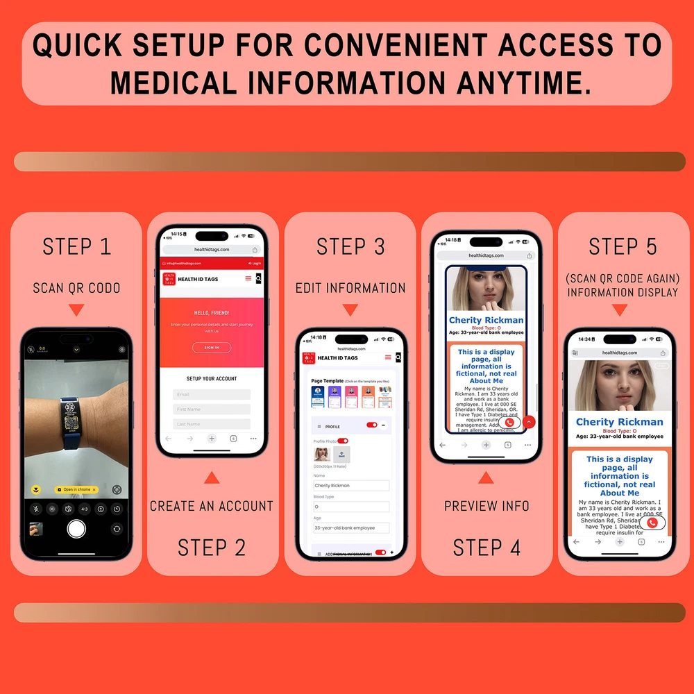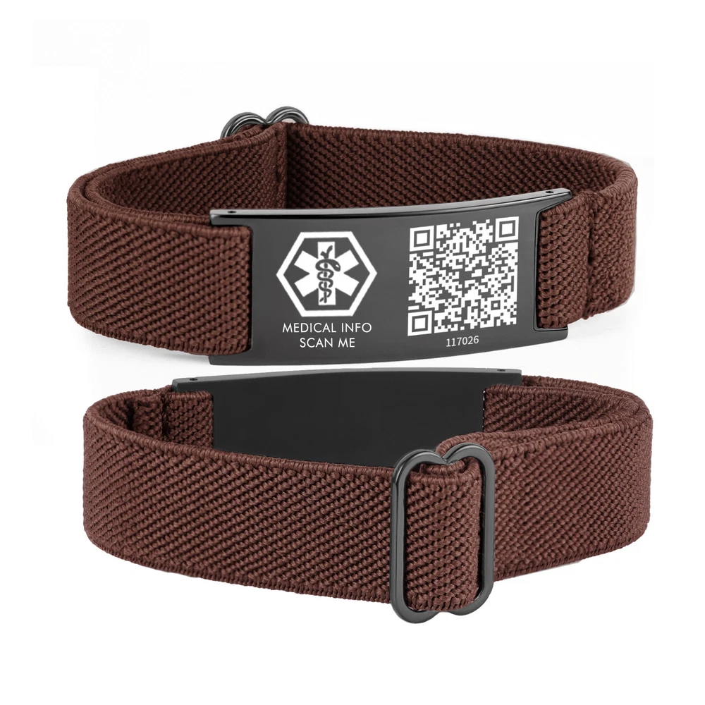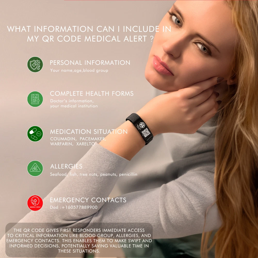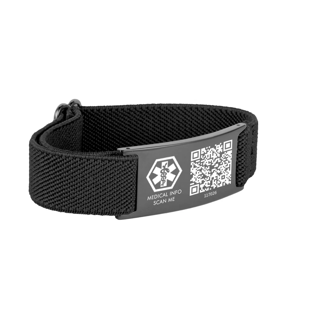 Nylon QR Code bracelets available in 7 colors. These bracelets are comfortable and has a breathable elastic band that slides to adjust for a wide range of sizes. Range is 4.5"-8.3". Band Width is 14mm, Tag is 18mm wide. Unisex style and will work for all ages, Kids included! If you have a large amount of medical information this bracelet is for you! Many features include: Medical Emergency Information: This bracelet incorporates cutting-edge QR code technology to securely store comprehensive medical information, significantly exceeding the capabilities of traditional engraved tags. Simply scan the QR code to access a detailed emergency medical profile for swift and accurate information retrieval. Durable and Precise Design: The QR code along with the medical ID symbol is meticulously engraved on a black stainless steel plate. The high-contrast engraving ensures reliable scanning, while the unique numeric identification code facilitates easy bracelet replacement and customization. Store Unlimited Medical Information: The dynamic web-linked profile enables you to manage and update your emergency medical details—including conditions, allergies, medications, and emergency contacts—effortlessly at any time from anywhere. Effortless Setup and Use: Activating your bracelet is straightforward—simply scan the QR code to create an account. You can then enter or update your information, upload photos, and adjust settings without requiring an app or incurring subscription fees. PLEASE NOTE: This item requires approximately 2 weeks (USA) and 3 weeks (Canada/International) for processing and delivery. No rush orders, and no returns.