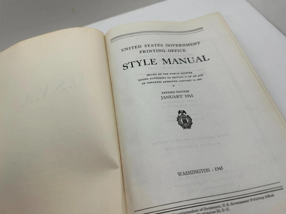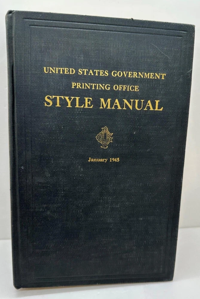 United States Government Printing Office Style Manual January 1945 Hardcover United States Government Printing Office Style Manual January 1945 Hardcover Thank you for browsing my listing and supporting Small Business. We've been selling online for 30+ Years. As Pictured. Listing and template services provided by inkFrog