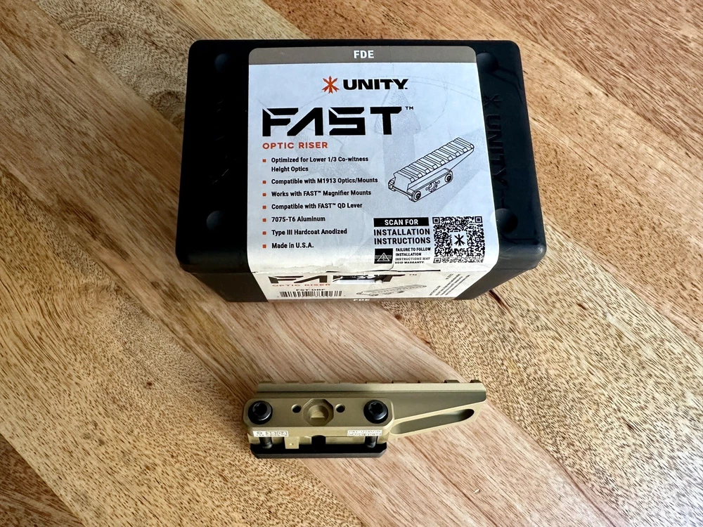 Purchased New. Lightly Used. No Damage. FAST™ is a series of optic mounts and platforms that provide end users with a quicker sight picture than standard height mounts. A 2.26” optical centerline height provides faster/easier reticle acquisition while wearing electronic earpro/communications headsets, night vision goggles and gas masks and allows for more rapid visual processing of the battlefield by promoting a heads-up posture. A heads-up posture also helps users maintain a neutral spine position which is more comfortable while wearing helmets, plate carriers, and other heavy gear. FAST™ Riser securely elevates block-type red dot optics with a standard lower 1/3 cowitness picatinny mount to a 2.26″ optical center line. FAST™ Riser provides an elevated M1913 Picatinny platform for direct attachment of optics such as EOTech EXPS®, Leupold LCO®, Vortex UH-1®, and other “lower 1/3” optics*. *Technically, the FAST™ Riser will support “absolute cowitness” optics such as EOTech XPS®, Sig Sauer Romeo8H®, etc. But, compatibility with the FAST™ FTC Magnifier Mount will be limited. The FAST™ Riser comes standard with a rail-grabber clamp. The FAST™ Riser is built from 7075-T6 Aluminum and Type III Hardcoat Anodized Black or FDE*. DIMENSIONS: 2.50″(L) x 1.21″(W) x 0.67″(H) WEIGHT: 2.8 oz. MATERIAL: 7075-T6 Aluminum COATING: Type III Hardcoat Anodized MOUNT TYPE: Rail Grabber COMPATIBILITY: All Direct-to-Rail Mounted Optics. Optimized for Lower 1/3 Height Optics Note if using Absolute Cowitness Height Optics: If used in conjunction with one of our FAST FTC Magnifier Mounts, you will notice a minimal occlusion of the bottom of the sight picture when the magnifier is stowed. *NOTE* Unity's “FDE” references a spectrum of colors that include tan, brown, bronze, earth, and everything in between. Due to the chemical process that takes place during Type III Hardcoat, the final finish can vary from part to part (even parts done in the same batch). Therefore, your “FDE” product may vary from other parts from UNITY and other companies, and may vary from the photos shown online.