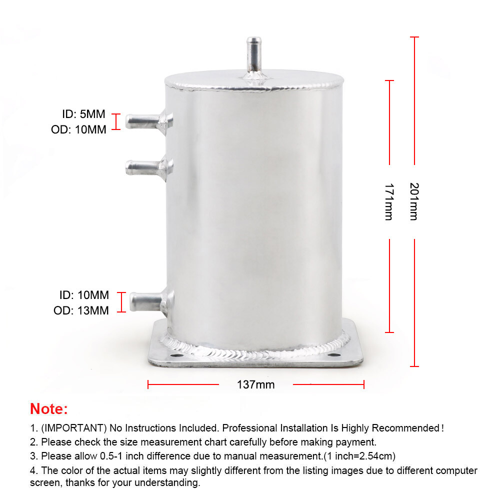 Store Categories Store Categories Other Universal Polished Aluminum 1.5L Oil Catch Can Alloy Fuel Swirl Pot Fuel Tank Product Description Features: 100% brand new. Polished aluminium/alloy water tank TIG welded. Primarily used for a radiator overflow bottle. Also suit windscreen washer or intercooler water spray bottle. Specification: Type: Oil Catch Tank Color:Silver Cylinder height 171mm 137mm x 137mm-base (with 4 screw holes for easy mounting) 8mm x 3 vent-pipe / return etc. (Also flared connectors) Material: Aluminium anodized Package Included: 1 x 1.5 Litre Tank Kit (as pictured) Notes: This tank is universal so some modification maybe require to fit it to your vehicle. Professional installation is strongly recommended. Please check the size measurement chart carefully before making payment. Payment Policy Contact Us Returns Policy Payment Policy We accept payment by PayPal only ! Payment should be completed within 5 days after buyer places the order,or else an unpaid case will be opened in order to cancel the transaction. If you can not pay in time, please contact us. e-check from PayPal will only be processed once the payment clears. All of the items will be shipped to buyer's EBAY address,please confirm your address on Ebay before you buy.Your order will be usually shipped out the same or next business days once the payment is made and cleared. Contact Us If you encounter any problems about anything, please feel free to contact us and we will do our best to assist you solve the issue. If you are not satisfied in anyway, please feel free to let us know and give us a second chance to correct it before you decide to leave any neutral or negative feedback. we will reply message or E-mail in 7-10hours our working time :monday -sunday 9:00am-22:30pm ( GMT+08:00Beijing ) 1:00am-14:30pm ( GMT+00:00London ) 19:00pm-08:30pm ( GMT+06:00USA / Canada ) Returns Policy If you encounter any problems about anything, please feel free to contact us and we will do our best to assist you solve the issue. If you are not satisfied in anyway, please feel free to let us know and give us a second chance to correct it before you decide to leave any neutral or negative feedback. we will reply message or E-mail in 7-10hours our working time :monday -sunday 9:00am-22:30pm ( GMT+08:00Beijing ) 1:00am-14:30pm ( GMT+00:00London ) 19:00pm-08:30pm ( GMT+06:00USA / Canada ) Copyright © 2023 Dianxiaomi