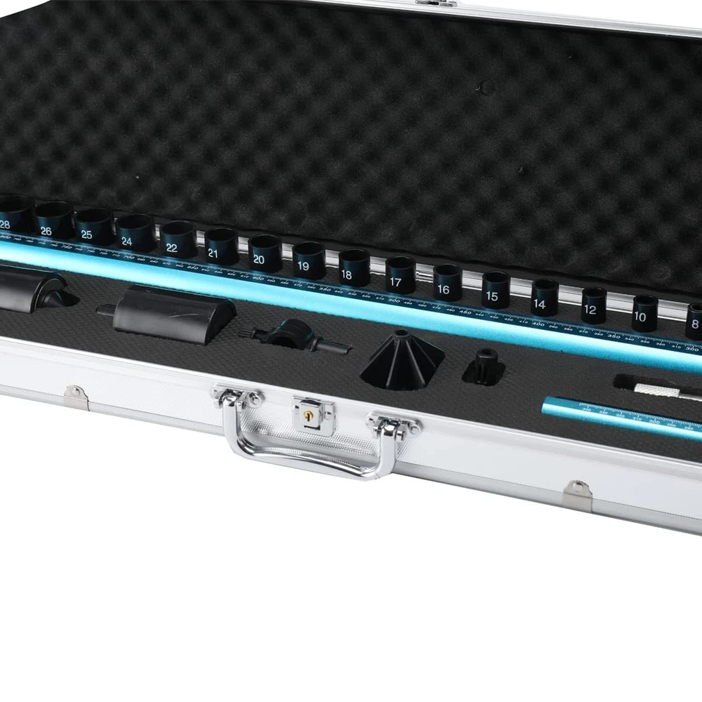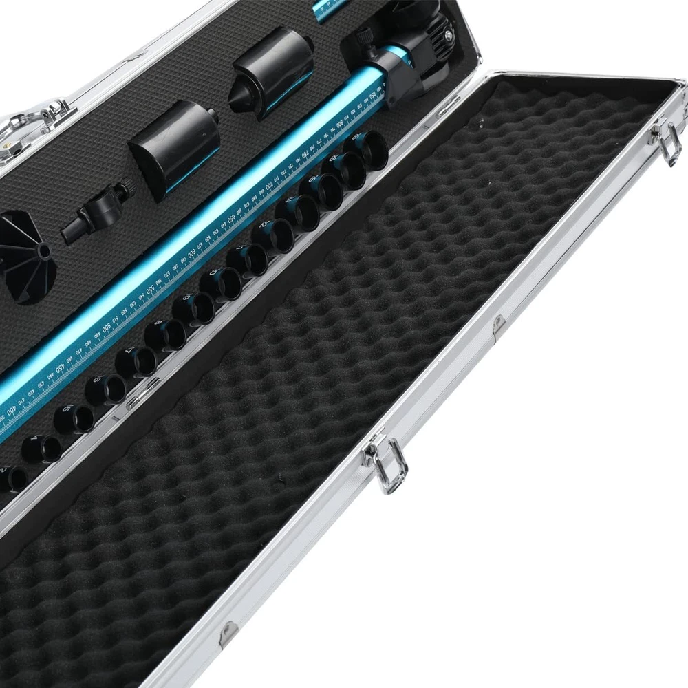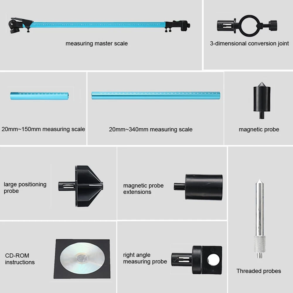 Features: 1. High precision, measurement error is less than 1mm. 2. Aluminum alloy material, high strength, small size, light weight, one person can complete measurement independently. 3. It can also be 3D measuring with the adapter connectors. Specification: Product size (with aluminum box): 102×20×12cm/ 40.15×7.87×4.72" Material: Aluminum alloy Color: Blue-black Measuring range, X axis: 200mm~2250mm/ 7.87-88.6" Y axis: 20mm~150mm (or 340mm)/ 0.8-5.9" OR 13.4" Z axis: 20mm~150mm (or 340mm)/ 0.8-5.9" OR 13.4" Package size: 104×20×10cm/ 41×7.87×3.9" Gross weight: 3.8kg Usage: 1. When measuring small size within 900mm,drawing measuring rule is not required. Use slide rule according to the position of the ranging point. The level (in the level of the level display) shows the measurement,read on the slider. 3. When measuring a size about 1800 mm, the inner rod that is stretched out and stretched is used, and measured according to the level displayed by the level. Read measurements on the slider holder. Pull the ruler smoothly during the measurement (in the level of the level display). 4. The vertical ruler is directly at the measuring point, up and down adjustable, and is screwed to the vertical position to maintain the level (in the level of the level display). Packing List: 1x Main scale 1x 20-150mm scale 1x 20-340mm scale 1x Screw thread probe 1x Magnetic probe 1x Magnetic probe and lengthen base 1x 3D adapter 1x Large positioning probe 1x Longitudinal positioning probe 1x Small positioning probe 1x Size Nut Probe 1x CD, English manual
