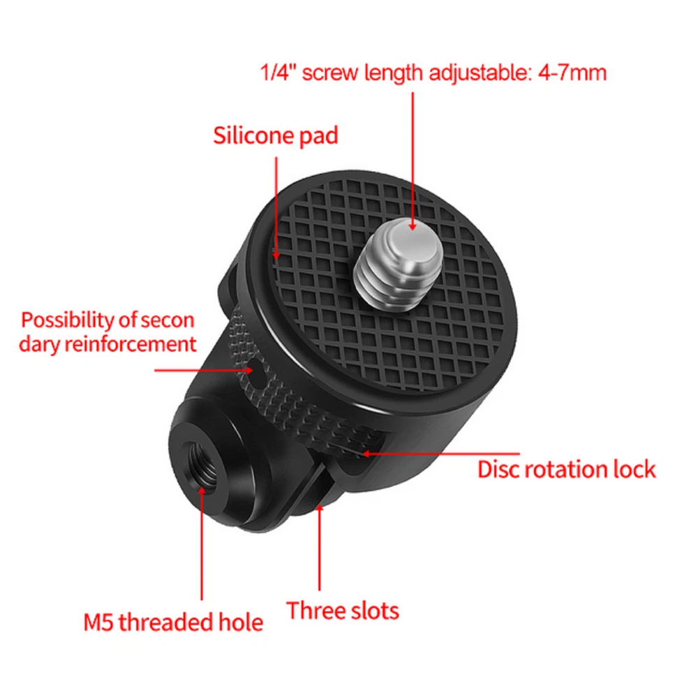 Product Description Mini Tripod Mount Aluminum Adapter 360 Swivel Disc Reinforced 1/4" Screw for Gopro Specifications: Type: 1/4" Screw to 3-Slot Metal Adapter for Gopro Material: Aluminum alloy + stainless steel Aluminum alloy surface process: The surface is anodized Size: 24x24x36.5mm Color: Black Features: 1. All aluminum alloy materials, CNC precision machining; 2. External silicone pad, anti-skid design; 3. Full angle 360-degree rotation self-tightening adjustment can be adjusted to any angle; 4. By rotating the disc, the camera can be fixed at any position; 5. The hand-twisted disc has a reinforcement hole, which can be strengthened and locked with a hexagonal hand to make the adapter and the camera firmly locked; 6. Universal 1/4" accessories, which can transfer the whole series of Insta360 ONE R/X2/GOPRO10/9/8/MAX GOPRO and other motion cameras to photographic equipment with 1x 4 screw holes; Packaging includes: 1x 1/4" Screw Aluminum Adapter 1x Spanner Shipping Returns Contact Us Payment 1. Items sent from US warehouse. 2. Receiving time = Processing time + Shipping time. 3. Pro cessing Time: Around 1-2 business Days. 4. Shipping Time: 3-5 business day. it may have a little delay during some holiday (such as Christmas), any problem, please feel free to contact. 1. 30 days warranty from the purchased date. Please contact us via email before returning the defective item. 2. Our warranty does not extended to any product that are physically damaged or that are not under normal operating conditions as result of misuse or improper installation on the buyer/user's part. 3. Return items should include the original packaging and all accessories. buyers MUST contact us for the returning address. 4. In all cases, buyers pay shipping fees at their own cost to return products for exchange or refund. We will be responsible for the postage of replacements. Refund will be made upon receipt of the returned item. If you have any question, please e-mail us immediately, we will reply you as quickly as possible. We care about our valued customers, and will always try to help you. We accept all verified payment from eBay. Shipping 1. Items sent from US warehouse. 2. Receiving time = Processing time + Shipping time. 3. Pro cessing Time: Around 1-2 business Days. 4. Shipping Time: 3-5 business day. it may have a little delay during some holiday (such as Christmas), any problem, please feel free to contact. Returns 1. 30 days warranty from the purchased date. Please contact us via email before returning the defective item. 2. Our warranty does not extended to any product that are physically damaged or that are not under normal operating conditions as result of misuse or improper installation on the buyer/user's part. 3. Return items should include the original packaging and all accessories. buyers MUST contact us for the returning address. 4. In all cases, buyers pay shipping fees at their own cost to return products for exchange or refund. We will be responsible for the postage of replacements. Refund will be made upon receipt of the returned item. Contact Us If you have any question, please e-mail us immediately, we will reply you as quickly as possible. We care about our valued customers, and will always try to help you. Payment We accept all verified payment from eBay. You may also like 2Pcs Dryer Roller Wheel Drum Support Kit Replacement Part For Maytag Whirlpool 18.91 USD 3.99 USD 8PCS Hair Clipper Cutting Guide Combs With Metal Clip Replacement Tools For WAHL 13.38 USD 3.99 USD Leather Cushion Face Cover Eye Foam Mask Pad Anti-Sweat For Oculus Quest 2 VR 15.94 USD 18 Grids Watch Tiny Parts Storage Box Plastic Repair Acc Container + Dust Cover 11.75 USD Metal Bead Eyeglass Chain Glasses Strap Holder Lanyard Sunglasses Non-slip 8.93 USD Soft Rubber Dust Blower Air Pump Cleaner Watch & Camera PCB Repair Cleaning Tool 4.61 USD 3.99 USD powered by