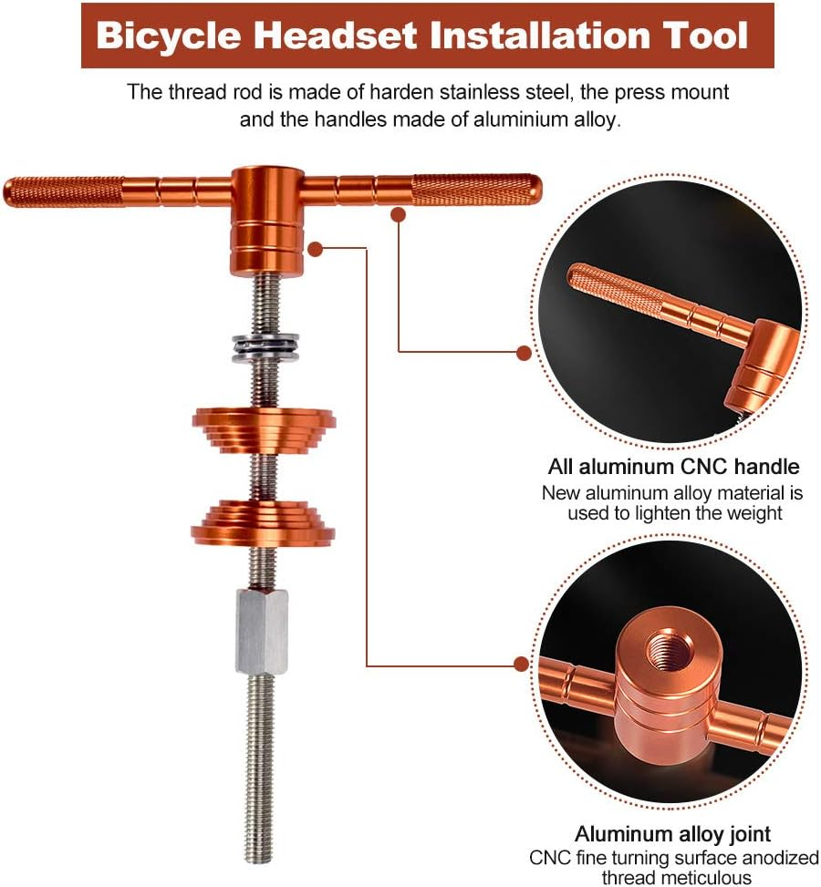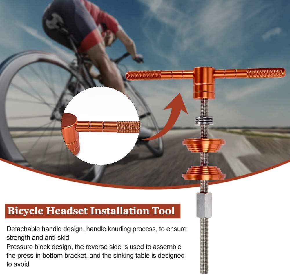 Usage: Bike Headset Installation Tool special designed for bike headset and bottom bracket installation, make you job done easily and professional. Materials: The thread rod is made of harden stainless steel, the press mount and the handles made of aluminium alloy. Size: Bike Headset Press-in Tool Length of the thread rod is about 24.5cm/9.65inch, diameter ia sbout 12mm/0.47inch. Easy Install: Bicycle headset bottom bracket is perfect tool for helping you to replace your bike old torn part, easy to use, convenient to install. Press Block Design: Pressure block design, the reverse side is used to assemble the press-in bottom bracket, and the sinking table is designed to avoid crushing the bearing during installation. Bike Headset Cup and Bottom Bracket Press Installation Tool,Universal Bike Headset Installation Tool,Bike Headset Press-in Tool,Bicycle Repair Accessories Bearing Installer Features: Usage: Bike Headset Installation Tool special designed for bike headset and bottom bracket installation, make you job done easily and professional. Materials: The thread rod is made of harden stainless steel, the press mount and the handles made of aluminium alloy. Size: Bike Headset Press-in Tool Length of the thread rod is about 24.5cm/9.65inch, diameter ia sbout 12mm/0.47inch. Easy Install: Bicycle headset bottom bracket is perfect tool for helping you to replace your bike old torn part, easy to use, convenient to install. Ball Bearing Design: Ball bearing design makes it more stable while using and would not hurt your bike frames. Press Block Design: Pressure block design, the reverse side is used to assemble the press-in bottom bracket, and the sinking table is designed to avoid crushing the bearing during installation. Remind: Please use the grease when installing, this could do a lot helpful for your job and protect your headset or bottom bracket. Specifications: Item Type: Bicycle Headset Installation Tool Material: Aluminum Alloy, Stainless Steel Color: Orange+Silver Stainless Steel Thread Rod: Total Length: About 24.5cm/9.65inch, Diameter: About 12mm/0.47inch Size: About 27 x 6 x 6cm/10.63 x 2.36 x 2.36inch(L x W x H) Package Includes: 1Pc x Bicycle Headset Installation Tool Notes: Transition: 1cm=10mm=0.39inch 1. Due to the different monitor and light effect, the actual color of the item might be slightly different from the color showed on the pictures. Thank you! 2. Please allow 1-3cm measuring deviation due to manual measurement.