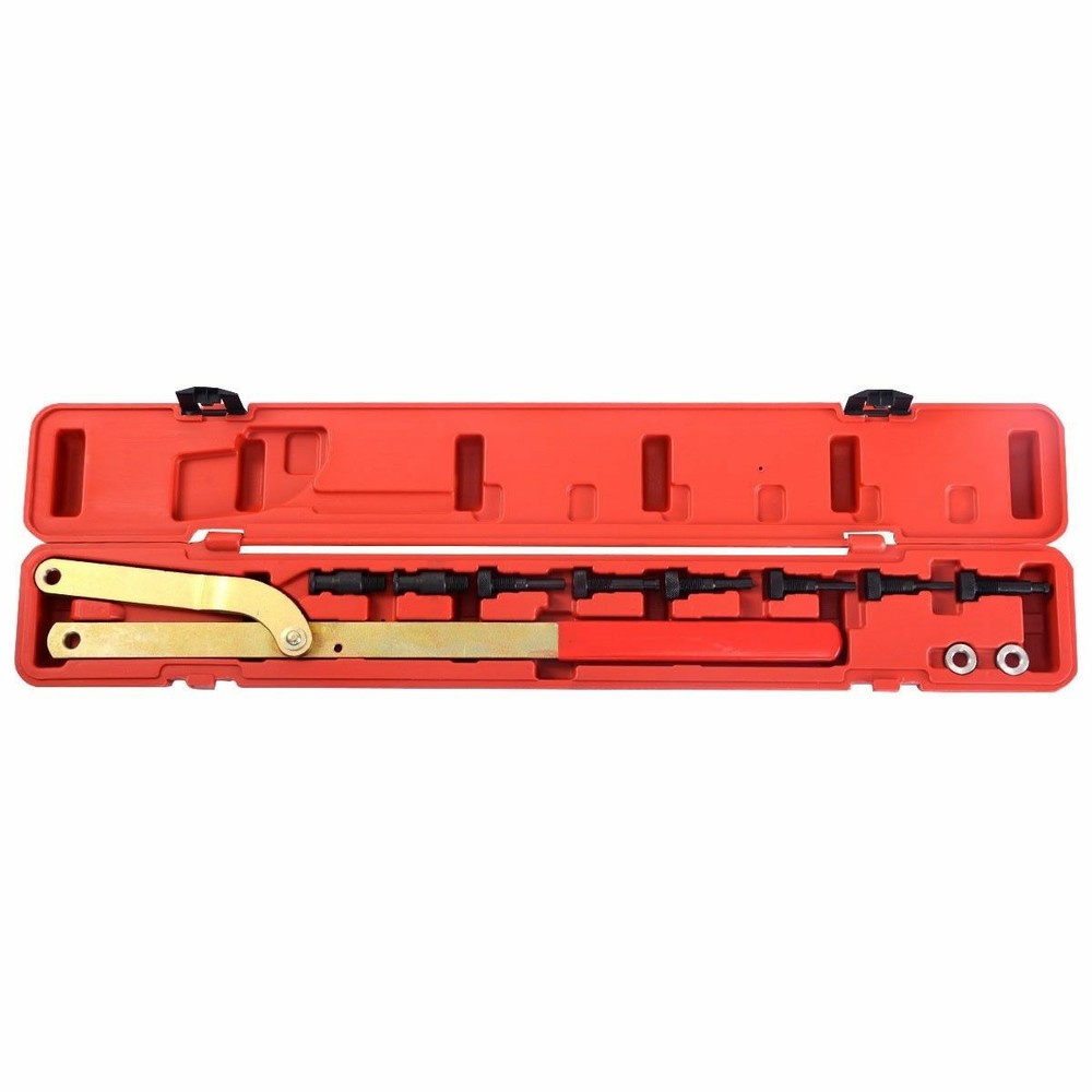 Universal Camshaft Pulley Fan Clutch Removal Holder Wrench Tool Kit 【Description】 Fan Clutch Sprocket Camshaft Pulley Holding Wrench Tool is designed to remove and install fan clutch and rotate or restrain the camshaft pulley. This camshaft pulley tool can be adjusted from 1-1/2" to 8-5/8" in diameter,It includes four interchangeable step pins of different sizes.(0.24-0.39", 0.31-0.43", 0.39-0.47", 0.43-0.62"). Fits many different fan clutches and camshaft/crankshaft pulleys with grooves or holes on variety vehicles. NOTICE!!! Not applicable to 99 F-150 supercharged 5.4L crank pulley. The tool is made of 45# Carbon steel, durability and high strength, great resistance to corrosion and rust. Long handle with non-slip enables technician to easily hold the pulley when tightening or loosening retaining bolts,does the work a lot faster convenient and saving your time and energy. 【Applicable】 It fits for most cars. NOTE!!! Not applicable to 99 F-150 supercharged 5.4L crank pulley. 【Specification】 Material: 45# steel Wrench opening size: 1.5" - 8.7" Step pins sizes: 0.24-0.39", 0.31-0.43", 0.39-0.47", 0.43-0.62" 【Includes】 1pc x Universal Fan Clutch Wrench 4pcs x 2 Step Pins (2pcs per set) 2pcs x Nuts PLEASE NOTE: 30 DAYS WARRANTY ON OUR PRODUCTS. 1. This LIMITED WARRANTY ONLY applies to products which shows that the warranty covers in the product information. 2. Warranty period: (Since the order was placed) 3. The warranty only covers the defects under normal use. 4. The warranty DOES NOT cover the defect was subjected to misuse,negligence or accident. 5. The warranty DOES NOT cover consumable parts. Quality and Performance: Our tools are top quality products and will not be beaten on performance. Payments & Shipments: We ship our tools all over the world.If your country is not approved on system please contact us for shipping cost. Generally, items will be dispatched within 3 business days after cleared payment being received. Please double check your address,we are not responsible for any delivery due to incorrect or undeliverable address. Returns: If customers are not fully satisfied with our product, simply return the item to us in an unused condition and we will process a refund once the item is received. Items must be returned within 30 days, by prior notification, please email us directly before making any returns. Contact US: If you have any questions, then kindly please contact us via the ?Ask a question? Tab which is located on the bottom of the listing page. Feel free to contact us for any reason, we will respond to eBay messages and emails within 24 hours. Weekend messages and emails will be dealt with on the Monday following the weekend. Customers Note: There are many ways to contact Top Rated Tools but the quickest and easiest way to get in touch with us is via the eBay messaging system. We answer our eBay messages at regular intervals and will get back to you with an answer within 24 hours. We encourage customers to contact us directly if you have a problem with an item return or delivery of an item. We are usually able to deal with any problem and remedy it without using the eBay appeals case, we encourage customer's to use this only as a last resort and we will do everything we can to help you and make sure you get the best customer service possible. WE DO NOT COMPLETE SALES OUTSIDE OF EBAY SO PLEASE DO NOT CONTACT US TO TRY AND DO SO. If you are interested in more products then kindly please have a look at our eBay shop. Thank You for shopping with us and we hope to see you soon!