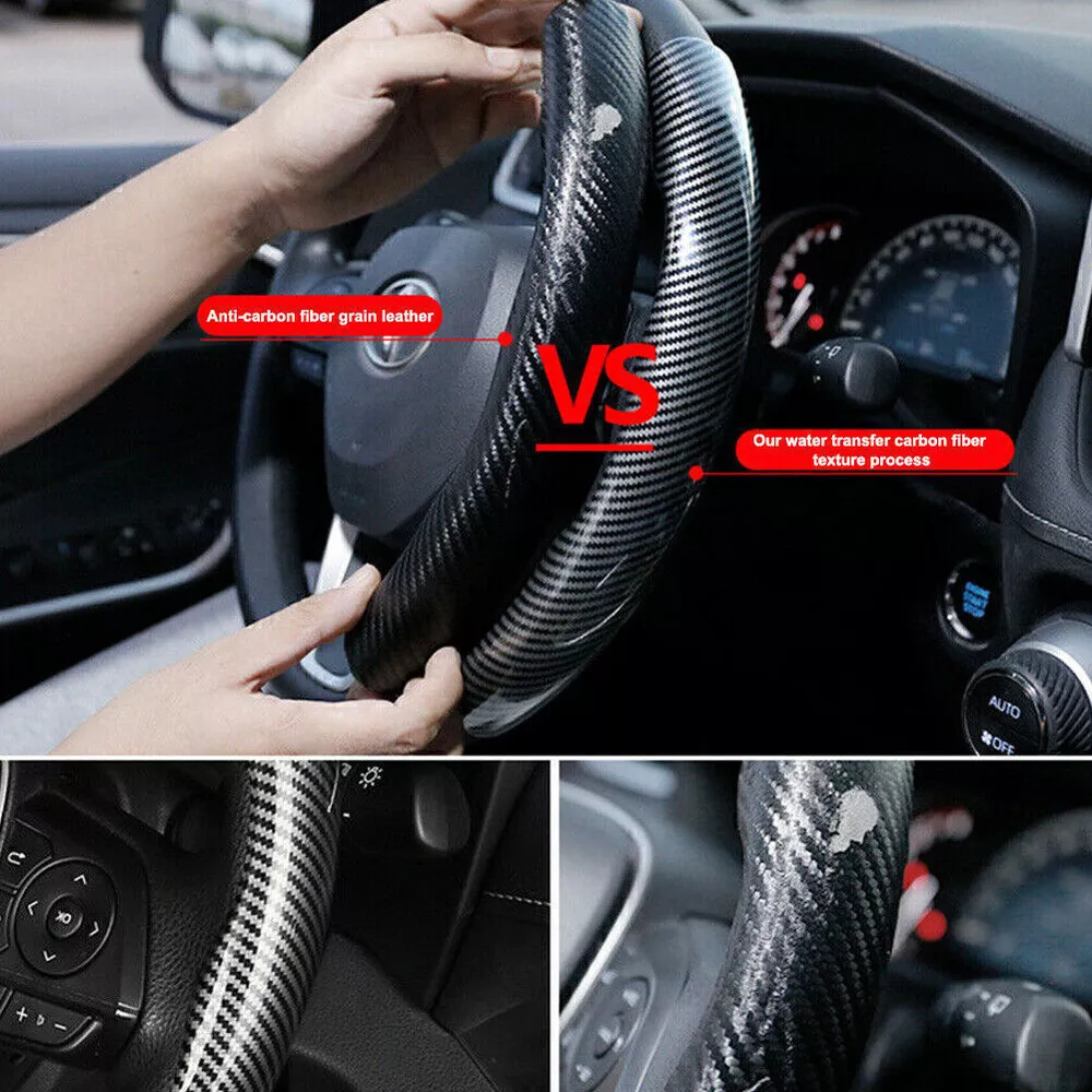 Universal Car Non-Slip Steering Wheel Booster Cover Carbon Fiber Accessories Description: Enhance your driving experience with our Universal Car Non-Slip Steering Wheel Booster Covers. Made from high-quality carbon fiber, these covers provide a sleek and stylish look while ensuring a firm grip on the steering wheel. Perfect for all seasons, they help reduce driving fatigue and improve control, especially during long drives or in challeng ing conditions. Features: • Premium Material: Crafted from durable carbon fiber for a modern and sophisticated appearance. • Non-Slip Design: Ensures a secure grip, enhancing safety and comfort while driving. • Universal Fit: Suitable for most steering wheels. • Easy Installation: Quick and hassle-free setup without any tools required. • All-Season Use: Keeps cool in summer and provides a comfortable touch in winter. Specifications: • Material: Carbon Fiber • Color: Black