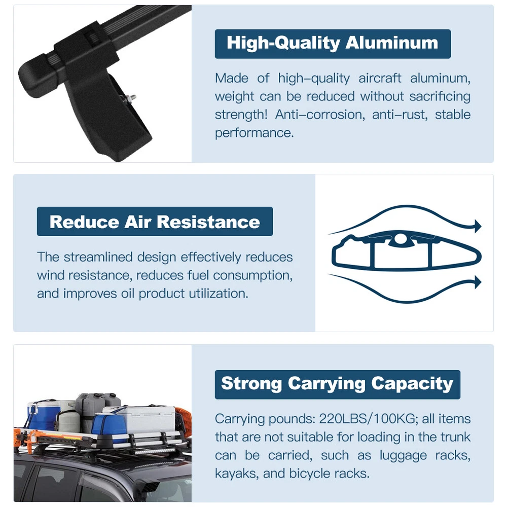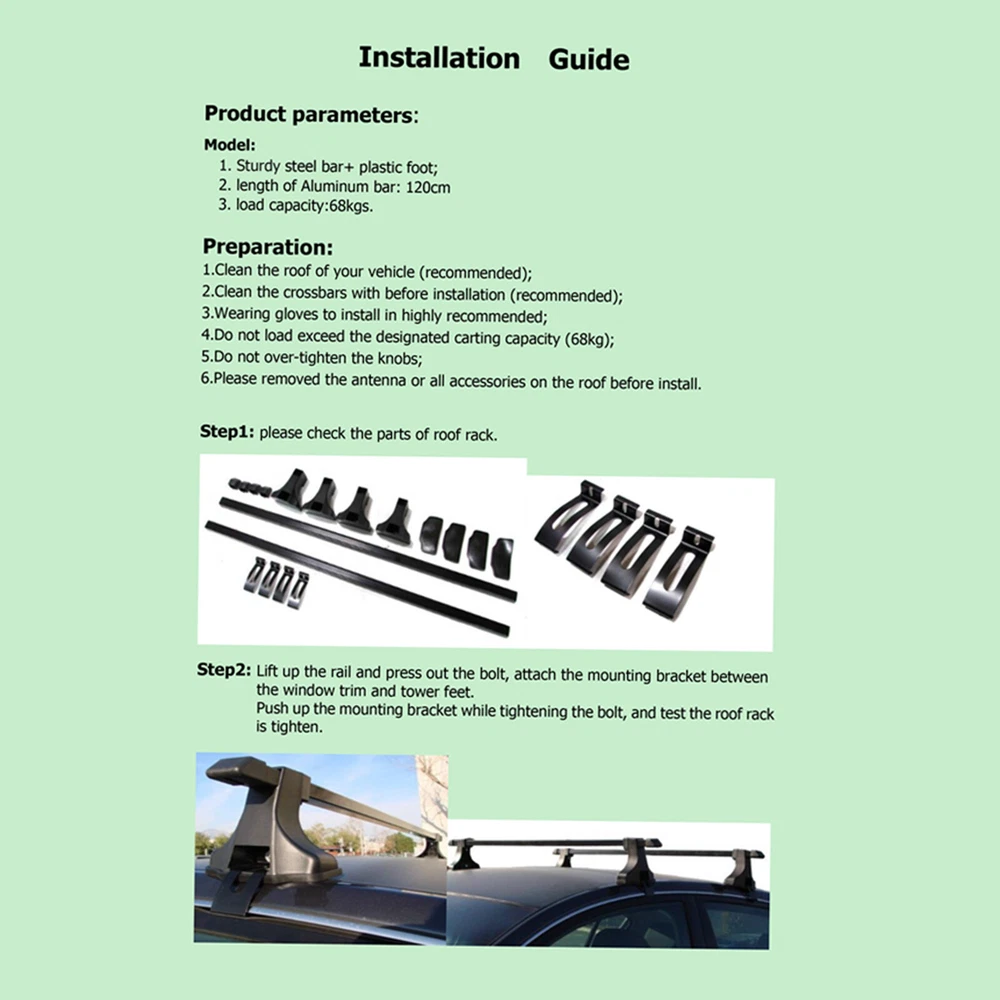 Item Features Surface Finish: Polished Material: Lightweight aluminum bar Max Load Capacity:165lb 2 x Roof Rack Bars made from high grade aluminum Easy installation,light weight and very durable Water-proof and anti-corrosion Fine workmanship with perfect details. Design to be used only when you need it. Brand new and high quality Vehicle Fitment For Universal 48"(Fits Naked Roof Models ONLY) Item Include 2 x Roof Rack Item Notes Universal Car Top Roof Rack Cross Bar 48" Luggage Cargo Carrier Aluminum Pair Item Features Surface Finish: Polished Material: Lightweight aluminum bar Max Load Capacity:165lb 2 x Roof Rack Bars made from high grade aluminum Easy installation,light weight and very durable Water-proof and anti-corrosion Fine workmanship with perfect details. Design to be used only when you need it. Brand new and high quality Vehicle Fitment For Universal 48"(Fits Naked Roof Models ONLY) Item Include 2 x Roof Rack Item Notes Please check the model according to the auto parts list to avoid the model not fit after purchase! Please Contact with Us If you have any questions please contact us. Your emails will be responded in 24 hours with the exception of weekends and holidays. Item Specifics Manufacturer Part Number E106581010201CP Brand ECCPP Manufacturer Warranty 1 Year Type Cross Bar Placement on Vehicle Upper Material Aluminum Fitment Type Direct Replacement Color Black Surface Finish Textured Custom Bundle No Modified Item Yes Weight Capacity 165LB Number of Pieces 2 Mounting Hardware Included Yes Features Adjustable Interchange Part Number For Universal 48" Other Part Number Roof Rack Top Luggage Carrier Universal Fitment Yes Maximum Weight Capacity 165 lb Item Specifics Manufacturer Part Number E106581010201CP Brand ECCPP Manufacturer Warranty 1 Year Type Cross Bar Placement on Vehicle Upper Material Aluminum Fitment Type Direct Replacement Color Black Surface Finish Textured Custom Bundle No Modified Item Yes Weight Capacity 165LB Number of Pieces 2 Mounting Hardware Included Yes Features Adjustable Interchange Part Number For Universal 48" Other Part Number Roof Rack Top Luggage Carrier Universal Fitment Yes Maximum Weight Capacity 165 lb WARNING: Cancer and Reproductive Harm - www.P65Warnings.ca.gov. We stand behind every product we sell. All of our brand new items come with a 60-Days money-back guarantee. We define the item as defective only if it doesn't function as described. It is the buyer's responsibility to understand the item description before bidding. We will replace the defective items, provided that they are in stock within the warranty period posted with the listing and the buyer return the original item and pay for the S&H cost for the replacement. We will refund the purchase price if the replacement is not available or buyer prefers a refund and send the original item back at his/her own cost. Shipping & handling cost are not refundable. Man-made damage by abuse or wrong operation is not covered by this warranty. No product liability insurance is assumed. PayPal preferred. Payments are expected within 7 days after the last winning auction is closed; Otherwise Unpaid Item Dispute will be filed with eBay. Product will be shipped within 2 business days after full payment is received and verified. Delivery Time is about 3-7 business days to most of countries. All domestic orders will be shipped via USPS, UPS or FedEx from our US warehouse and usually arrives to your door in about 3-5 business days. We ship the package to your shipping address in eBay instead of the one in PayPal. Please tell us your shipping address if it is different from the one in eBay. The tracking number will be given for the customer to check the shipping status online (registered or faster service only). We are not responsible for any wrong or undeliverable addresses. Please verify and update your shipping address on eBay during checkout. International Buyers a€“ Please Note: a) Import duties, taxes and charges are not included in the item price or shipping charges. These charges are the buyer's responsibility. b) Please check with your country's customs office to determine what these additional costs will be prior to bidding. Serious Buyer Only! Please place bid or "Buy it now" only if you agree the price and terms of the product and no argument after the auction. We strive to source genuine products from the suppliers. However, if you feel any of our products violate your Trademark, Patent Right or any other Intellectual Property Rights, please contact us. We will remove any offending listing immediately while awaiting further discussion. Picture Hot Item Pair Tow Mirrors for 88-98 Chevy GMC C/K 1500 2500 3500 Manual Telescoping Black USD 69.29 Pair For 2007-2014 Chevy Silverado Sierra Power Heated LED Signal Tow Mirrors USD 124.19 Front Wheel Hub Bearing For Chevy Monte Carlo Impala Cadillac Eldorado DTS FWD USD 40.38 ECCPP 2 Pcs Wheel Hub Bearing Front For Buick LaCrosse Century Regal Lesabre FWD USD 60.95 Universal 12V Low Pressure 5-9 PSI Electric Fuel Pump Installation Kit E8012S USD 14.89 Shop Category Store Home Air Dryer Car Tools ◈ Car Tools ◈ Electric Winch Tow ◈ Jack Stand ◈ Jumper Cable ◈ Removal Tool ◈ Tire Pressure Gauge Cooling System ◈ AC Compressor ◈ Air Blend Door Actuator ◈ Blower Motor Resistor ◈ Condenser ◈ Coolant Tank ◈ Cooling Fan ◈ Evaporator ◈ Heater Control Valve ◈ Heater Core ◈ Intercooler ◈ Radiator ◈ Radiator Hose ◈ Radiator Support ◈ Thermostat Housing ◈ Water Pump ◈ Water Pump Impeller Copper Tube ◈ ATV Brake Caliper ◈ Brake caliper ◈ Brake drum shoe ◈ Brake lines kit ◈ Brake pad sensor ◈ Brake rotor pad ◈ Brake Shoe ◈ Power Brake Booster Crankshaft And Camshaft ◈ Camshaft & Crankshaft ◈ Harmonic Banlancer ◈ Timing Chain Kit Drive Belt And Device ◈ Primary Drive Clutch ◈ Serpentine Belt Tensioner Drive Shaft And Half Shaft ◈ 4 Pcs Wheel Hub Bearing ◈ ATV/UTV CV Axles & Parts ◈ 