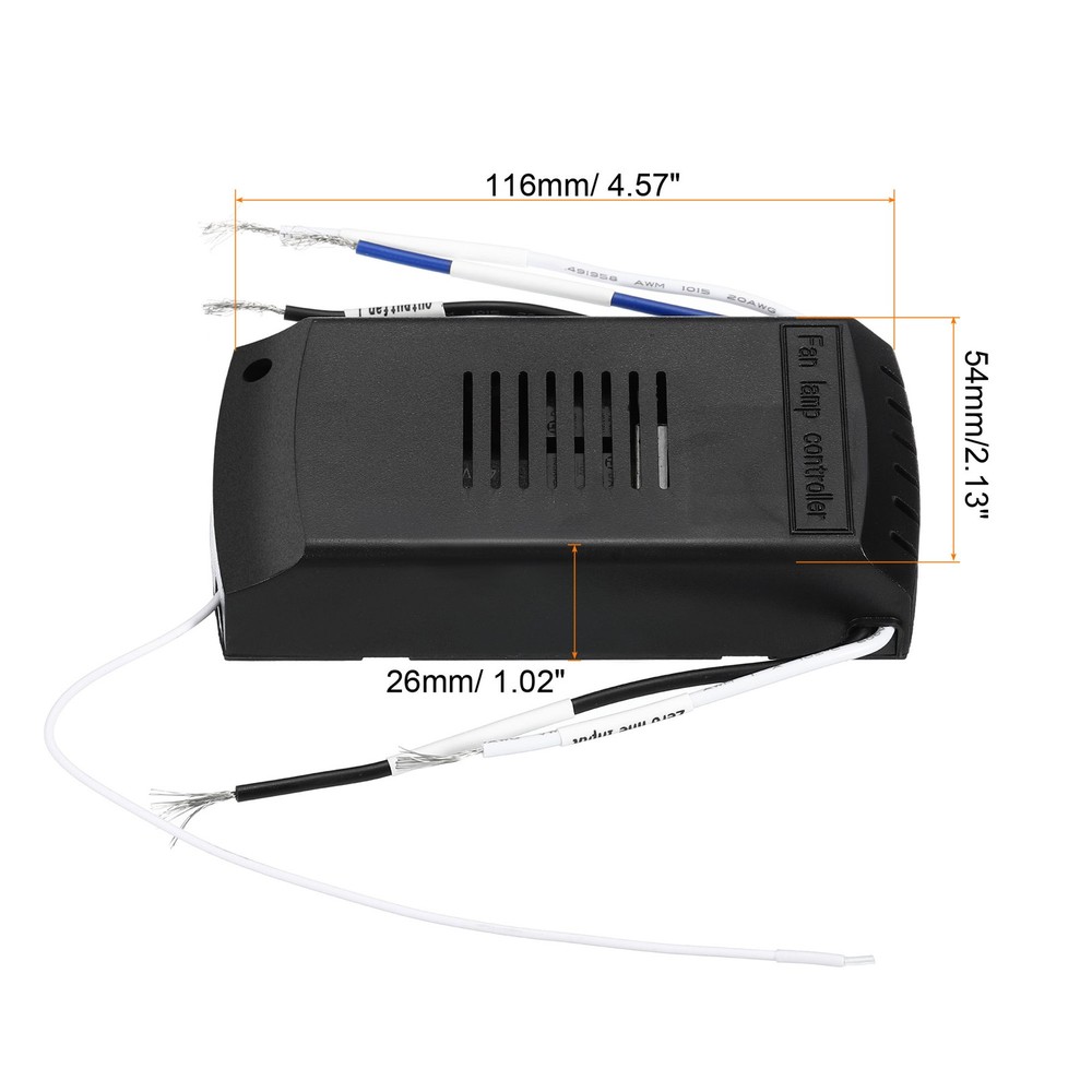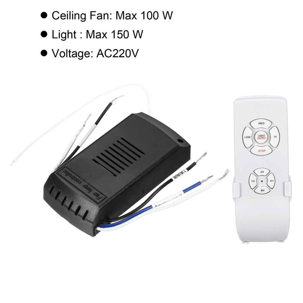 Document This universal ceiling fan remote control kit converts a normal ceiling fan or light into a wireless remote. 3 in 1: 3 speed control buttons, 4 timing control buttons, 1 light on/off control button. Usually used in home, office, hotel, exhibition, showroom, restaurant.Specification:Color: White, BlackMaterial: PlasticLoad power:Ceiling Fan: Max 100 WLight : Max 150 WVoltage: AC220VSize: 116*54*26mm/ 4.57*2.13*1.02 inch (L x W x T)Packing List: 1 x Remote Control , 1 x Receiver, 1 x Wall Mount HolderAdvantage:Timing Design: Timing switch, flexible time setting.30 Meters Receiving: The switch adopts excellent switching power supply IC, stable voltage reduction, strong receiving and high sensitivity, more safe and durable.Wall Mount Holder: Coming with a mounting plate, which can hold the black receiver on wall with 2 nails, reduce the risk of losing the receiver.Instruction:Two wires outside the ceiling connect the receiver to electricity, and three wires inside the fan control the fan. One end of the three wires of the receiver is - the wire connected to the ceiling fan lamp (color and color butt). One end of the two lines of the receiver is - docking with the home's fire wire and neutral wire (white is connected to neutral wire, black is connected to fire wire).NOTE:Don't open or modify the controller and receiver.Please leave children far away from high voltage power sources.Please be aware to keep the wires away from water.Please use it under a professional electrician's guidance. Universal Ceiling Fan Remote Control Kit 220V Wireless 3 in 1 Speed Light Timing This universal ceiling fan remote control kit converts a normal ceiling fan or light into a wireless remote. 3 in 1: 3 speed control buttons, 4 timing control buttons, 1 light on/off control button. Usually used in home, office, hotel, exhibition, showroom, restaurant. Specification: Color: White, Black Material: Plastic Load power: Ceiling Fan: Max 100 W Light : Max 150 W Voltage: AC220V Size: 116*54*26mm/ 4.57*2.13*1.02 inch (L x W x T) Packing List: 1 x Remote Control , 1 x Receiver, 1 x Wall Mount Holder Advantage: Timing Design: Timing switch, flexible time setting. 30 Meters Receiving: The switch adopts excellent switching power supply IC, stable voltage reduction, strong receiving and high sensitivity, more safe and durable. Wall Mount Holder: Coming with a mounting plate, which can hold the black receiver on wall with 2 nails, reduce the risk of losing the receiver. Instruction: Two wires outside the ceiling connect the receiver to electricity, and three wires inside the fan control the fan. One end of the three wires of the receiver is - the wire connected to the ceiling fan lamp (color and color butt). One end of the two lines of the receiver is - docking with the home's fire wire and neutral wire (white is connected to neutral wire, black is connected to fire wire). NOTE: Don't open or modify the controller and receiver. Please leave children far away from high voltage power sources. Please be aware to keep the wires away from water. Please use it under a professional electrician's guidance. Hot Item Payment 1.We accept eBay payment . 2.Payment must be received within 7 business days of auction closing. Shipping 1.We ship to your eBay or Paypal address. Please make sure your eBay and Paypal address is correct before you pay. 2.Items will be shipped within 1-3 business day when we received payment. 3.Delivery time depends on destination and other factors. Description Policy Universal Ceiling Fan Remote Control Kit 220V Wireless 3 in 1 Speed Light Timing This universal ceiling fan remote control kit converts a normal ceiling fan or light into a wireless remote. 3 in 1: 3 speed control buttons, 4 timing control buttons, 1 light on/off control button. Usually used in home, office, hotel, exhibition, showroom, restaurant. Specification: Color: White, Black Material: Plastic Load power: Ceiling Fan: Max 100 W Light : Max 150 W Voltage: AC220V Size: 116*54*26mm/ 4.57*2.13*1.02 inch (L x W x T) Packing List: 1 x Remote Control , 1 x Receiver, 1 x Wall Mount Holder Advantage: Timing Design: Timing switch, flexible time setting. 30 Meters Receiving: The switch adopts excellent switching power supply IC, stable voltage reduction, strong receiving and high sensitivity, more safe and durable. Wall Mount Holder: Coming with a mounting plate, which can hold the black receiver on wall with 2 nails, reduce the risk of losing the receiver. Instruction: Two wires outside the ceiling connect the receiver to electricity, and three wires inside the fan control the fan. One end of the three wires of the receiver is - the wire connected to the ceiling fan lamp (color and color butt). One end of the two lines of the receiver is - docking with the home's fire wire and neutral wire (white is connected to neutral wire, black is connected to fire wire). NOTE: Don't open or modify the controller and receiver. Please leave children far away from high voltage power sources. Please be aware to keep the wires away from water. Please use it under a professional electrician's guidance. Hot Item Payment 1.We accept eBay payment . 2.Payment must be received within 7 business days of auction closing. Shipping 1.We ship to your eBay or Paypal address. Please make sure your eBay and Paypal address is correct before you pay. 2.Items will be shipped within 1-3 business day when we received payment. 3.Delivery time depends on destination and other factors.