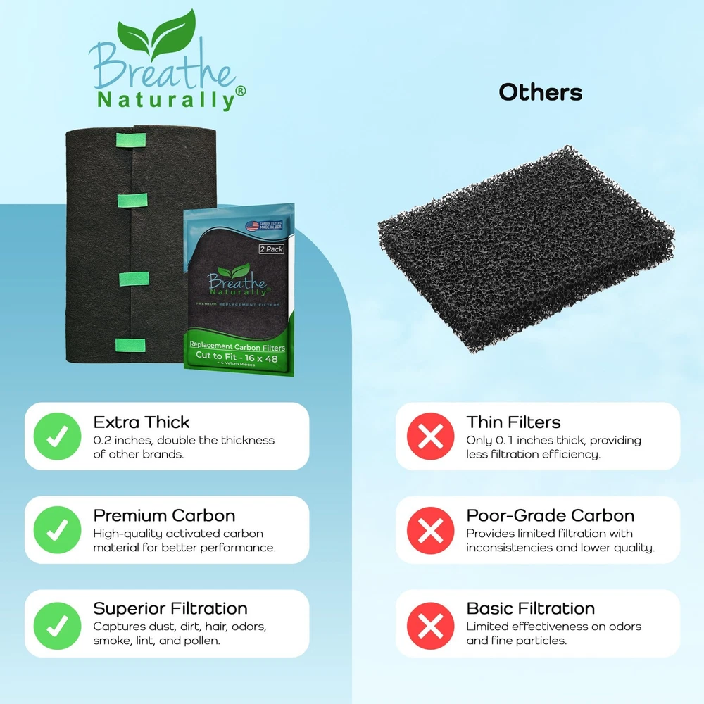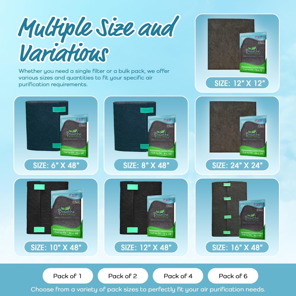 Breathe Naturally's carbon-activated pre-filters use advanced activated carbon air filter technology to trap and neutralize smoke and airborne pollutants, ensuring a cleaner indoor environment. With an extra thick 0.2-inch filtration capacity, these activated carbon air filters outperform standard 0.1-inch filters, capturing more particles and contaminants without hindering airflow. Each activated carbon air filter is universally cut-to-fit, includes two hook and loop tapes for easy attachment, and can be customized for a variety of applications such as air purifiers, vents, fans, windows, trash cans, litter boxes, range hoods, furnaces, HVAC systems, and dehumidifiers. Available in multiple sizes and packs of 1, 2, 4, or 6, they offer convenience and value for maintaining optimal air quality. Proudly made in the USA, these activated carbon air filters come in a resealable plastic bag to keep unused carbon filters fresh and effective, ensuring consistent air purification for a healthier home. ductless range hood charcoal filter humidifier breathe carbon prefilter cut fit activated air active purifier model hepa roll size ceiling fan return odor absorber sheets vent allergies cloth filter sheet hvac fabric home floor ac wrap pad universal furnace pack register material breath cutfit window vents purifiers covers dust heat thick foam prefilters allergy premium block mesh hunter media canister evaporative fliter screen inline ventilate thin replacement microwave paper liner conditioner mat apartment smoke fiber acitvated coconut rolls registers ACTIVATED CARBON AIR FILTER: Breathe Naturally's activated carbon air filter uses advanced activated carbon to capture and neutralize smoke, household odors, and airborne pollutants. This technology effectively neutralizes harmful particles and contaminants, enhancing indoor air quality. By providing an additional layer of filtration, the pre-filter helps maintain a fresher atmosphere and improves overall air quality. EXTRA THICK FILTRATION: Our activated carbon air filters are 0.2 inches thick, offering greater filtration capacity than standard 0.1-inch carbon filters. This extra thickness allows them to combat pet hair, pollen, smoke, dust and more, without restricting airflow. Designed for efficiency, these activated carbon air filters improve air quality by capturing a wider range of pollutants while maintaining optimal airflow. Perfect for homes or offices. UNIVERSAL CUT TO FIT: Each activated carbon air filter comes with two hook & loop tapes for easy attachment & can be adjusted to fit a wide range of applications. Simply cut the activated carbon air filter to the required size for a perfect fit. These versatile carbon filters are ideal for use in air purifiers, vents, fans, windows, trash cans, litter boxes, range hoods, furnaces, HVAC systems, dehumidifiers, & many other uses. This customizable design ensures no gaps for unfiltered air. MULTIPLE SIZE AND PACK: These activated carbon air filters are available in various sizes & come in packs of 1, 2, 4, or 6 to suit your needs. Whether you require a single carbon filter or multiple replacements, these options offer convenience and value. Designed to fit your specific requirements, they help you maintain optimal air quality in your home by ensuring regular activated carbon air filter replacements. Choose the pack size that most suits your needs and enjoy fresher air with ease. MADE IN USA AND WITH RESEALABLE PLASTIC BAG: Proudly made in the USA with the highest-quality craftsmanship, each pack of our activated carbon air filters comes in a resealable plastic bag, keeping unused carbon filters fresh and ready for use. This ensures your activated carbon air filters remain effective, providing consistent and reliable air purification for your home, and maintaining a clean and healthy environment for you and your loved ones.