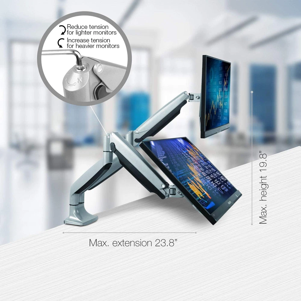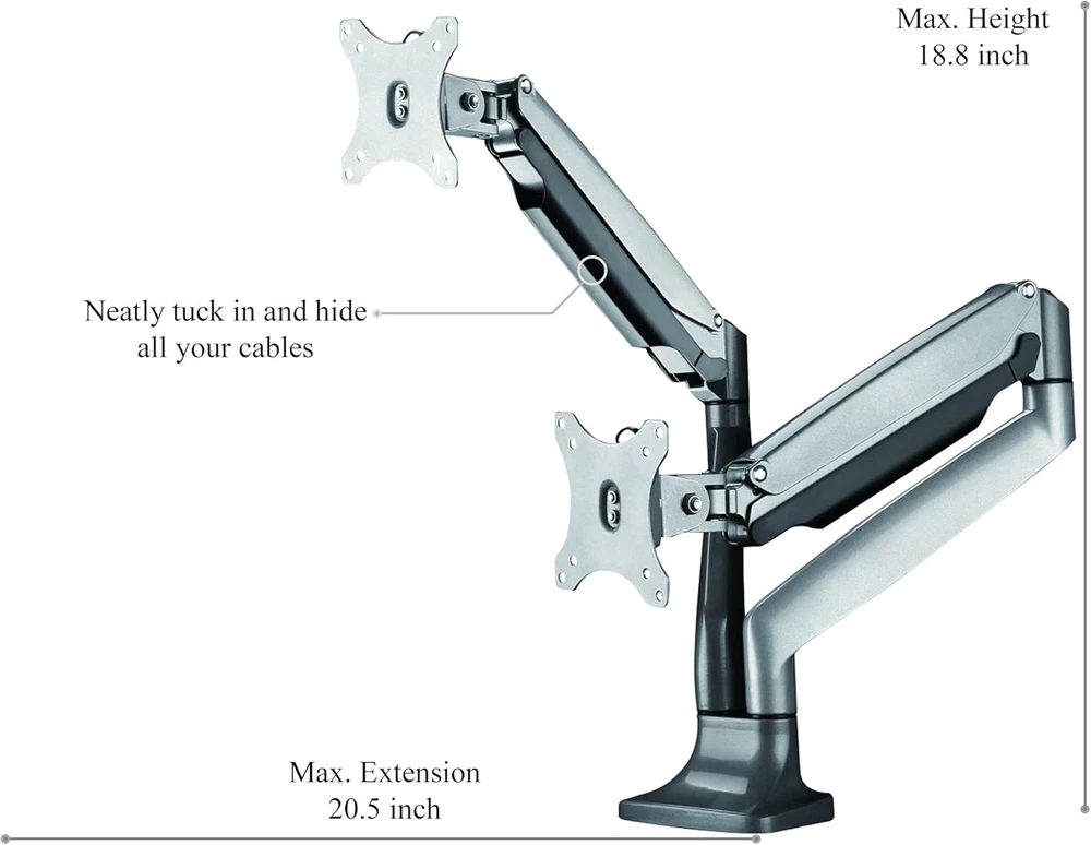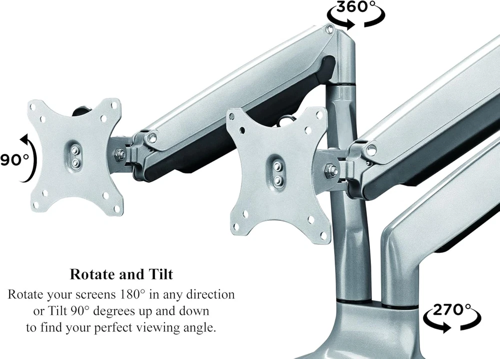 Menu Other Items Feedbacks About Us Contact Us Add To Favorites Universal Desk Mount for Dual Monitor - Fits Two 13-30" Monitors with Swivel & Clamp Space Saver: Extra room for your personal laptop or desktop computer is now easy to come by with this triple monitor stand. Simply attach your displays to each monitor arm and voila! More desk space. Universal Fit: Talk about the perfect size! The TechOrbits dual monitor desk mount is suitable for most 13in to 30in screens with 75mm x 75mm and 100mm x 100mm standard VESA mount patterns. Full Range of Motion: Engineered with SmartSWIVEL technology, the 2 monitor arms on this computer monitor mount can easily be turned or tilted in all directions for optimal visibility and minimal glare. Strong Support: Designed with premium, articulating gas springs and heavy-duty aluminum, our computer monitor stand for desk spaces can hold nearly 20lbs per self-balancing arm. Clamp-on Design: Secure this stand to your desk (0.4" to 3.3" in thickness) with the heavy-duty C-clamp or optional grommet. TechOrbits designed our SmartSWIVEL Dual Monitor Mount to easily move your screen anywhere you want to go! Our gas loaded springs make it easy to quickly move, spin, twist, or tilt your screen in any direction. We make it easy for you to take your presentation wherever you need it! Our universal mounting system can fit nearly all monitors 13" - 30" and under 19.8 Pounds . These stylish, floating arms attach to your desk with ease and provide your desk with elegant style. The SmartSWIVEL also helps: - Improve Organization: Store your supplies underneath your premium computer screens - Camouflage Cables Each mount is equipped with cable storage to prevent wires from cluttering your workspace. - Elevate Your Work: Raise your workstation and your work will follow! Buy yours now risk-free with our satisfaction . We love our customers and take great pride in our products, therefore we've included an extended 3-year . Buy yours now risk-free and If you aren't completely satisfied with your TechOrbits product, simply and will take care of you! Item Specification Item model number OF-MAA-10-C024 Movement Type Tilt Item Dimensions LxWxH 22.5 x 18.5 x 4.5 inches Mounting Type Tabletop Mount Color silver Series OF-MAA-10-C024 Material Aluminum Color silver Compatible Devices Monitor Item Weight 14.41 pounds Minimum Compatible Size 13 Inches Maximum Compatible Size 30 Inches Is Discontinued By Manufacturer No Product Dimensions 22.5 x 18.5 x 4.5 inches Dimensions Shipping Returns Additional Info Product Dimensions: 18.5 inches x 22.5 inches x 4.5 inches. Weight: 14.41 lb Fast shipping is very important for us. Our standard shipping service is FREE. Your order will be shipped within 1-3 business days upon full payment received. Most items are delivered within 3-5 business days, however, please allow 3-10 business days. We are shipping only to USA. We only ship to the confirmed Paypal address. We reserve the right to cancel any order for any reason at any time. We are not responsible for undeliverable addresses. We offer a 30 day return policy from checkout winning date. Your satisfaction is guaranteed! If for any reason you are unhappy with your item, just return it within 30 days for a full refund, minus shipping cost. Please contact us prior to initiating a return so that we can issue you a refund authorization. Items defective upon receipt must be packaged in their retail packaging as if new and returned with a detailed description of the problem. Return shipping fees are not refundable. We reserve the right to decline any returns if the above guidelines are not followed. All of our items, unless otherwise stated, will only run on 120 volts. Please check to make sure your country complies with these specifications. If you have a problem or question regarding your transaction please contact us before leaving any type of feedback. We will work with you to resolve any problem you may have.