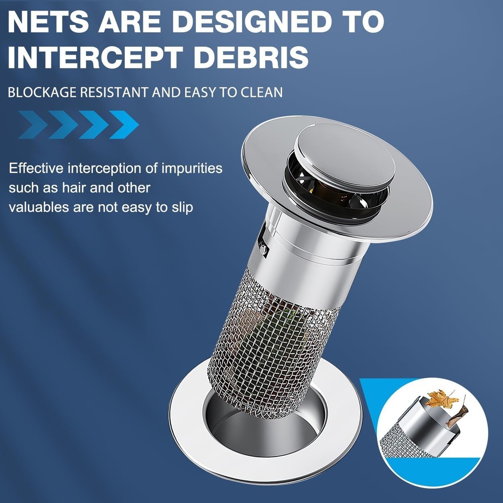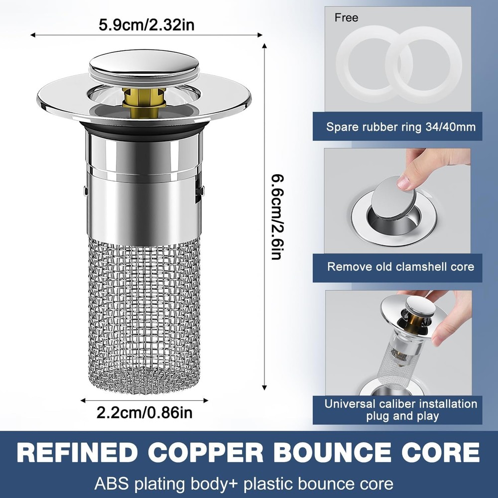 Model: New Wash Basin Spring Core Water Filter Specification: ABS+brass core+304 stainless steel filter screen Form: General Type: Bounce type 【Notes】 1. Please allow 1-2cm error due to manual measurement. 2. The colors may have different as the difference display,pls understand. An Innovation in Bathroom Sink Drain! Easily save your sink drain away from clogging issues, and also give a perfect new look to your sink. Reliable and low-maintenance solution practical choice for any bathroom sink. Effective interception to keep bathroom sink drain away from clogging trouble. Effectively catch hair, jewel, or any other stuff cause drain clogging. EASY INSTALLATION Update your bathroom with a new look! First: Take out the old sink stopper. Second: Put into our bathroom drain plug. Thrid: Finish installation easily and press to try the results. Package Including: 2x Pop-up Drain Filter 【Stainless Steel Floor Drain Filter】Has an Removable Filter Basket, innovative design cleverly will sink pop-up stopper and sink strainer made in one that collects hairs and prevents the drain from clogging, or prevents valuables such as rings that are prone to slipping from falling into the sewer. 【Quality Materials】The stainless steel floor drain filter is made with a brass core construction for durability and longevity. Easy to install by simply replacing the old sink plug with a new one. 【Low Maintenance and Reliable】This sink stopper is a practical choice for any bathroom sink. Its efficient drainage and clogging prevention capabilities, coupled with its easy-to-clean design, make it a reliable and low-maintenance solution for bathroom sinks. 【Versatile Application】Suitable for use in various settings, our filter supplies are compatible with kitchen sinks, bathtubs, sink water pipes, and floor drains, offering versatile solutions to keep your drains clean and functional in any area of your home. 【Easy to Use】It is easy to install by simply replacing the old sink plug with the new one. Cleaning is also a breeze, as you can simply remove the filter basket and rinse it under running water.Easy removal when sundries enter the stopper, simply pull the drain out and remove from the strainers.