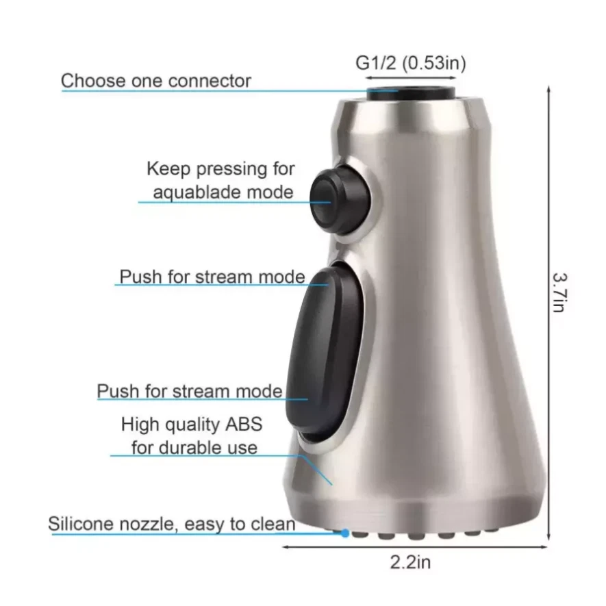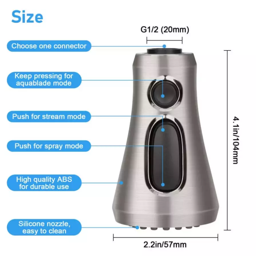 Product Feature : 【Premium Quality】 Crafted from high-grade ABS plastic with a premium chrome finish, our pull-down faucet spray head ensures durability and rust resistance, providing everyday convenience for various rinsing and filling needs. 【9 Different Adapters】 Our faucet spray head replacement includes 9 adapters, catering to various connections. Compatible with major brands of faucet hose connectors such as Moen, Delta, AquaSource, Kohler, Hansgrohe, Grohe, and so on. Please note that it is not compatible with most Pfister or Glacier Bay hoses. 【3-Mode Spray Options】 Enjoy three water modes: stream, spray, and aquablade. The aquablade mode provides powerful flushing to remove food debris. Easily switch between water modes with the push of a button. 【Removable & Washable Faucet Aerator】 We provide a free aerator key for easy removal or replacement of the faucet aerator for cleaning purposes. The interior multi-mesh aerator ensures a quiet, no-splashing aerated stream, filtering out most impurities. Cleaning the aerator ensures a continuous flow of clean water. 【Easy to Install】 Installation is a breeze! No tools required. In just minutes, unscrew your old faucet head and replace it with our new one for immediate use. Product Specification: Type: Pull Down Faucet Material: Engineering-grade ABS plastic Outer Diameter: G1/2 (20mm) Connection: G1/2 Male Thread, 5/8-16 UN, 5/8-18 UNF,4 Male Thread(17.1mm, 16.4mm, 15.5mm and 14mm) Overall Height: 4.09". (104 mm) Max. Width: 2.24". (57 mm) Package Included: 1 x Faucet Spray Head 9 x Connectors 1 x Aerator Key Tool Shipping * All items are in US warehouse and will be dispatched within 24 hours after receipt of payment. Please note that items purchased on weekends and Bank Holidays will be dispatched on the next working day. * It usually takes 3-5 working days for the delivery. But, the transit time is highly depend on Postal Service after we dispatched.If you have any problems, please feel free to contact us. * We ship items to your eBay confirmed address only. Please make sure your address on eBay is matched with your shipping address before you pay. * We are unable to take any responsibility for wrong address, any custom delay or tax. Returns * If the item can't works fine, please check twice to confirm that the item is defective, and contact our customer service representative asap let's know the detailed problem, we will do our best to server you. * If the package damaged during the freight, please refuse to sign for the package and return to us, then contact us promptly. * All of the Non-Seller mistake returns for refund are subject to 20% re-stock fee. And buyer should pay for the return shipping fee.(E.g choose the wrong size or wrong item) * We only accept the original package. Please make sure the item have No man-made sabotage. If you purchased in improper condition, please Note that the shippping and handling fee will not be refunded, all return shipping fee should paid by the buyer unless item DOA. * Guaranteed to Not be DOA and 100% working. Warranty covers replacement or repair. * Buyers are responsible for part return shipping fees on return package. * We reserve the right to refuse any returns for objective reasons. Contact Us * If you are dissatisfied for any reason, please don't leave negative/neutral feedback without asking. We work hard to make sure EVERY CUSTOMER 100% SATISFIED and resolve any problem for you. We always l eave positive feedback to all our customers. * If you are satisfied with the product you received,please leave us Positive Feedback and 5 Scores DSR * We are strive to providing 100% satisfaction services for our customers. Your satisfaction is our greatest pursuit. Positive Feedback is very important to us! Thank you!