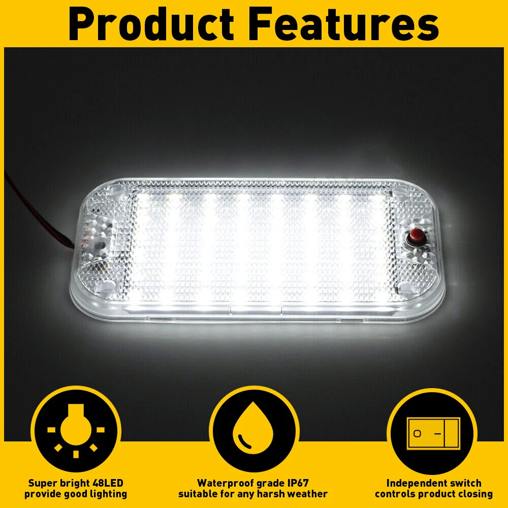 Specification: Waterproof IP: IP67 LED quantity: 48LED Light color: white Service life:50000h Voltage:12-85v Power: 10 w Suitable for: fit for 12 volt to 85 volt vehicle. Such as cars/RVs/trailers/camper/boats. Features: *High-brightness and Comfortable Light Source Super bright light with 48LED natural white color gives a better lighting for safety guarantee. *Simple installation Simple and convenient installation. It can be punched or use double-sided adhesive for installation. *IP68 waterproof Prevent from water, snow, moisture, rusting and dust, don't worry about leak inside problem. *Special material Universal RV Interior Car Vehicle Roof Indoor Dome Ceiling Light White Lamp Specification: Waterproof IP: IP67 LED quantity: 48LED Light color: white Service life:50000h Voltage:12-85v Power: 10 w Suitable for: fit for 12 volt to 85 volt vehicle. Such as cars/RVs/trailers/camper/boats. Features: *High-brightness and Comfortable Light Source Super bright light with 48LED natural white color gives a better lighting for safety guarantee. *Simple installation Simple and convenient installation. It can be punched or use double-sided adhesive for installation. *IP68 waterproof Prevent from water, snow, moisture, rusting and dust, don't worry about leak inside problem. *Special material The aluminum alloy base with high transmittance PC light cover ensures the long service life and durability of the product. *Independent switch control Easy to open and close at any time, safe and convenient Packaging include: Dome light*2 screw*8 Double-sided Tape*2 Item Specifics Brand Unbranded Performance Part Yes Brand Unbranded Lighting Technology LED Suitable For Dome Light Light Color Cold White Type Light Bulb Voltage 12-85v Service life 50000h Universal Fitment Yes LED quantity 108 LED Waterproof IP IP67 Manufacturer Warranty 1 Year Packaging include Dome light *2 Number of Bulbs 48LED Wattage 10 W Payment We can accept payment by credit, debit, and gift cards; Apple Pay, Google Pay, PayPal, and PayPal Credit. Shipping 1. All items will be shipped in 24 hours after receiving your payment . 2. We ship this item to US only via USPS first class mail. It usually takes 3-5 working days to deliver. Returns 1. We offer 60 days return policy. 2. Please contact us within 60 days from the date you receive your package if you have any questions with the products . 3. Refund will be sent after we got your returned package. 4. All returned items should be in the original packaging with tracking number. Contact Us We work from Monday - Saturday 9:00AM - 6:00PM PST, but we will reply you once we get your message .There will be some delay on response if you send message or E-Mail on Sunday. DESCRIPTION PAYMENT SHIPPING RETURN POLICY CONTACT US Hot item Help & Info Payment Policy Shipping Policy Return Policy FAQ About Us Universal RV Interior Car Vehicle Roof Indoor Dome Ceiling Light White Lamp Specification: Waterproof IP: IP67 LED quantity: 48LED Light color: white Service life:50000h Voltage:12-85v Power: 10 w Suitable for: fit for 12 volt to 85 volt vehicle. Such as cars/RVs/trailers/camper/boats. Features: *High-brightness and Comfortable Light Source Super bright light with 48LED natural white color gives a better lighting for safety guarantee. *Simple installation Simple and convenient installation. It can be punched or use double-sided adhesive for installation. *IP68 waterproof Prevent from water, snow, moisture, rusting and dust, don't worry about leak inside problem. *Special material The aluminum alloy base with high transmittance PC light cover ensures the long service life and durability of the product. *Independent switch control Easy to open and close at any time, safe and convenient Packaging include: Dome light*2 screw*8 Double-sided Tape*2 Payment Shipping Returns Contact Us We can accept payment by credit, debit, and gift cards; Apple Pay, Google Pay, PayPal, and PayPal Credit. 1. All items will be shipped in 24 hours after receiving your payment . 2. We ship this item to US only via USPS first class mail. It usually takes 3-5 working days to deliver. 1. We offer 60 days return policy. 2. Please contact us within 60 days from the date you receive your package if you have any questions with the products . 3. Refund will be sent after we got your returned package. 4. All returned items should be in the original packaging with tracking number. We work from Monday - Saturday 9:00AM - 6:00PM PST, but we will reply you once we get your message .There will be some delay on response if you send message or E-Mail on Sunday. All rights reserved. On Jan 30, 2025 at 16:02:21 PST, seller added the following information: