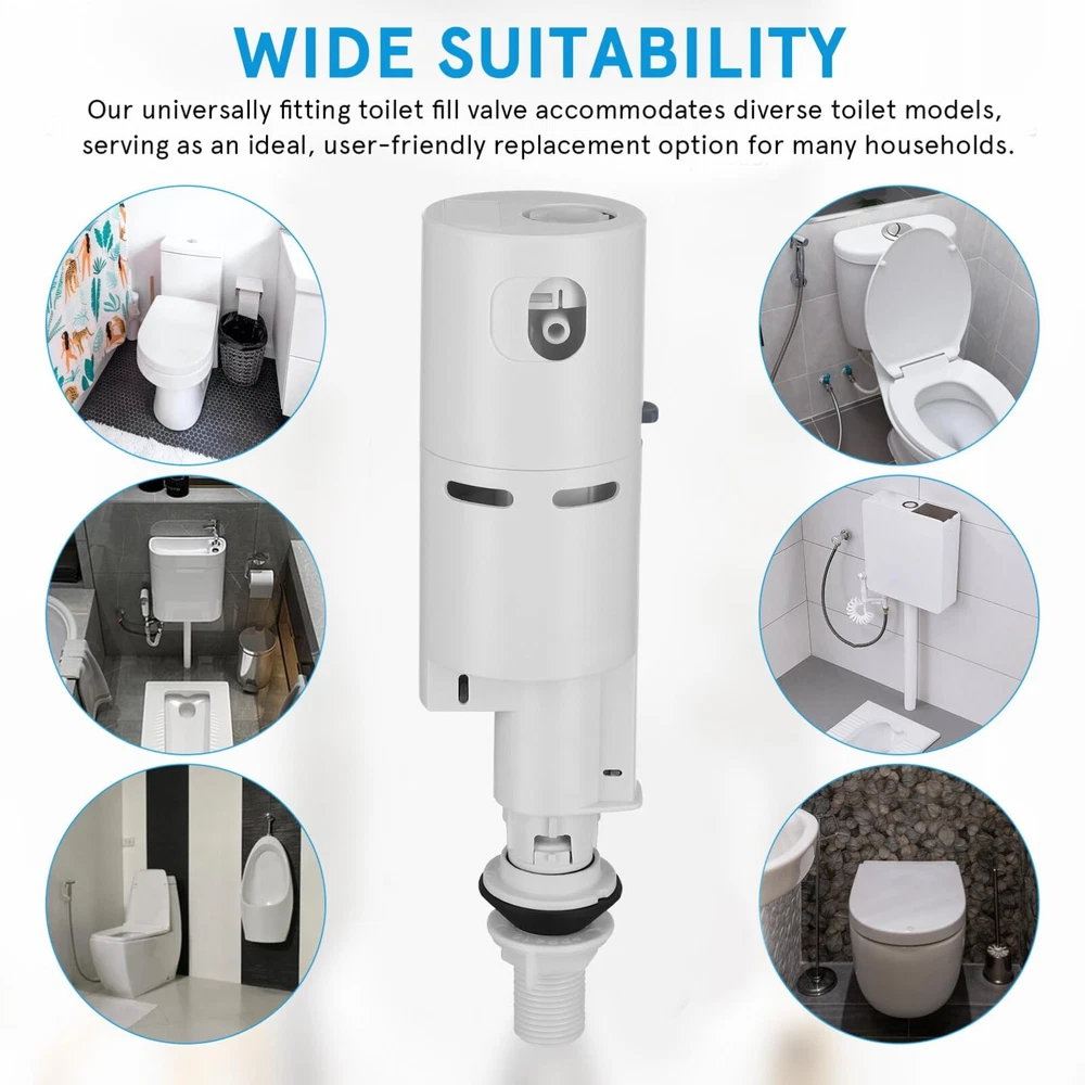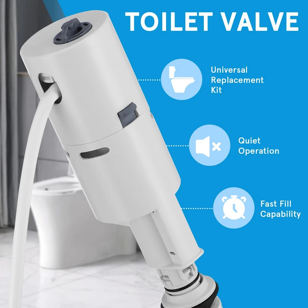 Sturdy Composition: Made with robust ABS material, the toilet valve stands strong against wear and impact, delivering a resilient and dependable service life Quick Water Refill: Characterized by swift and precise water level management, this filling valve rapidly replenishes your toilet tank, while reducing water usage Removable Filter: This fill valve boasts a top-mounted detachable filter, simplifying cleaning tasks, preserving unobstructed water flow, and effectively hindering any clog Quiet Performance: With its low noise, the valve maintains a serene bathroom ambiance, reducing disruptions even during late-night flushing Wide Suitability: Our universally fitting toilet fill valve accommodates diverse toilet models, serving as an ideal, user-friendly option for many households