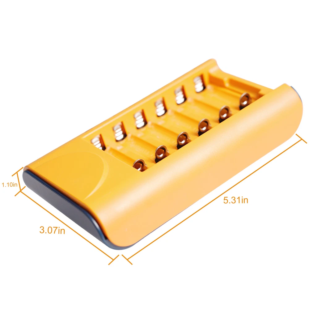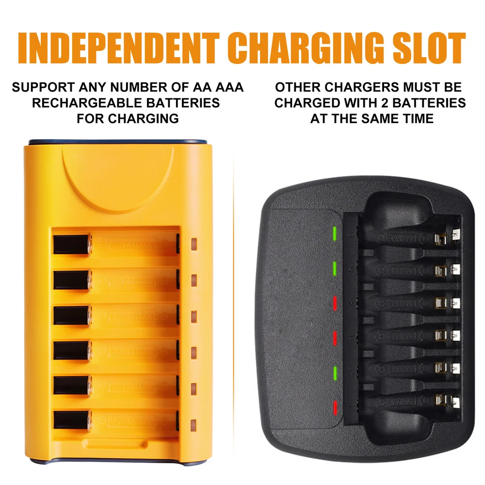 Universal USB Battery Charger 6-Slot Fast Charger for AA Rechargeable Batteries Features: 1. 【Smart Rechargeable AA Battery Charger】 AA AAA battery charger 6 bay for Ni-MH Ni-CD rechargeable batteries can charge any quantity in any slot. Single, double or triple ones can be charged, and not necessary to put them in neighboring slots. Besides, you can also mix charge AA and AAA batteries, as long as they are Ni-MH or Ni-CD batteries. 2.【Safety Protection】 Comes with special charge and discharge management circuit. With multiple security protection settings, battery charger aa can effectively prevent reverse, short circuit, overcharge, over discharge, over-current damage to the battery, which makes users using the product without any safety concern. 3.【LED Indicators Charging Display】 This aa aaa battery charger with Red/Green led light display, And the aa rechargeable battery charger will display the status of each rechargeable battery when you insert a battery to charge, the light will turn solid red, only on the port(s) containing the battery, to indicate the battery is charging. The light turns solid green when charging is complete. 4.【USB AA Battery Charger】 USB Powered Universal Intelligent Battery Charger, allows for on the go worldwide portability.the USB charging line can be connected to USB socket, car charger, computer, phone adapter, other USB output equipment to charge. 5. Note: Products with electrical plugs are designed for use in the US. Outlets and voltage differ internationally and this product may require an adapter or converter for use in your destination. Please check compatibility before purchasing. Specification: 1. LED state the charging statues: Power connection, no battery, Green light is always on. Charging - Red light Full charged- Green light 2. Compatible: Can both charge AA and AAA Ni-MH Ni-Cd rechargeable batteries (Do not charge alkaline or Lithium batteries) 3. Input and Output: Input: DC 5V 1A, Worldwide voltage Output: DC 1.2V 200mA, faster for charging 4. Individual fast-charging,LED indicator light, Easy to use AA/AAA/ Ni-MH Ni-CD rechargeable batteries,Perfect Fit 6. Can charge any number of batteries at the same time, independent charging channels 7. Safety Charging, Offer over-voltage over-current protection, short-circuit protection, over-charge protection, over-heat protection, Good Protection Package Included 1 x Smart Battery Charger 6-Slot 1 x USB Cable On Feb 9, 2025 at 23:44:00 PST, seller added the following information: