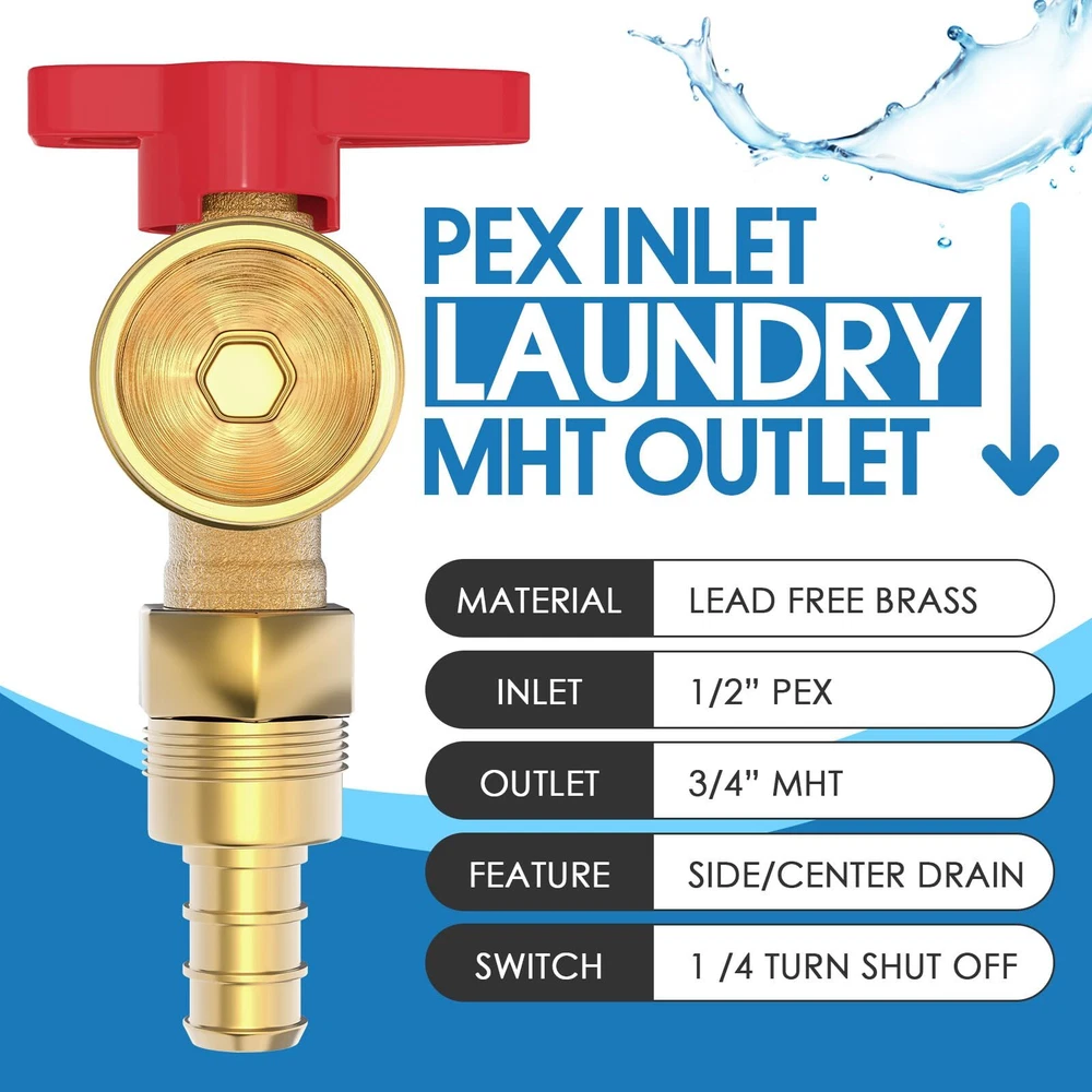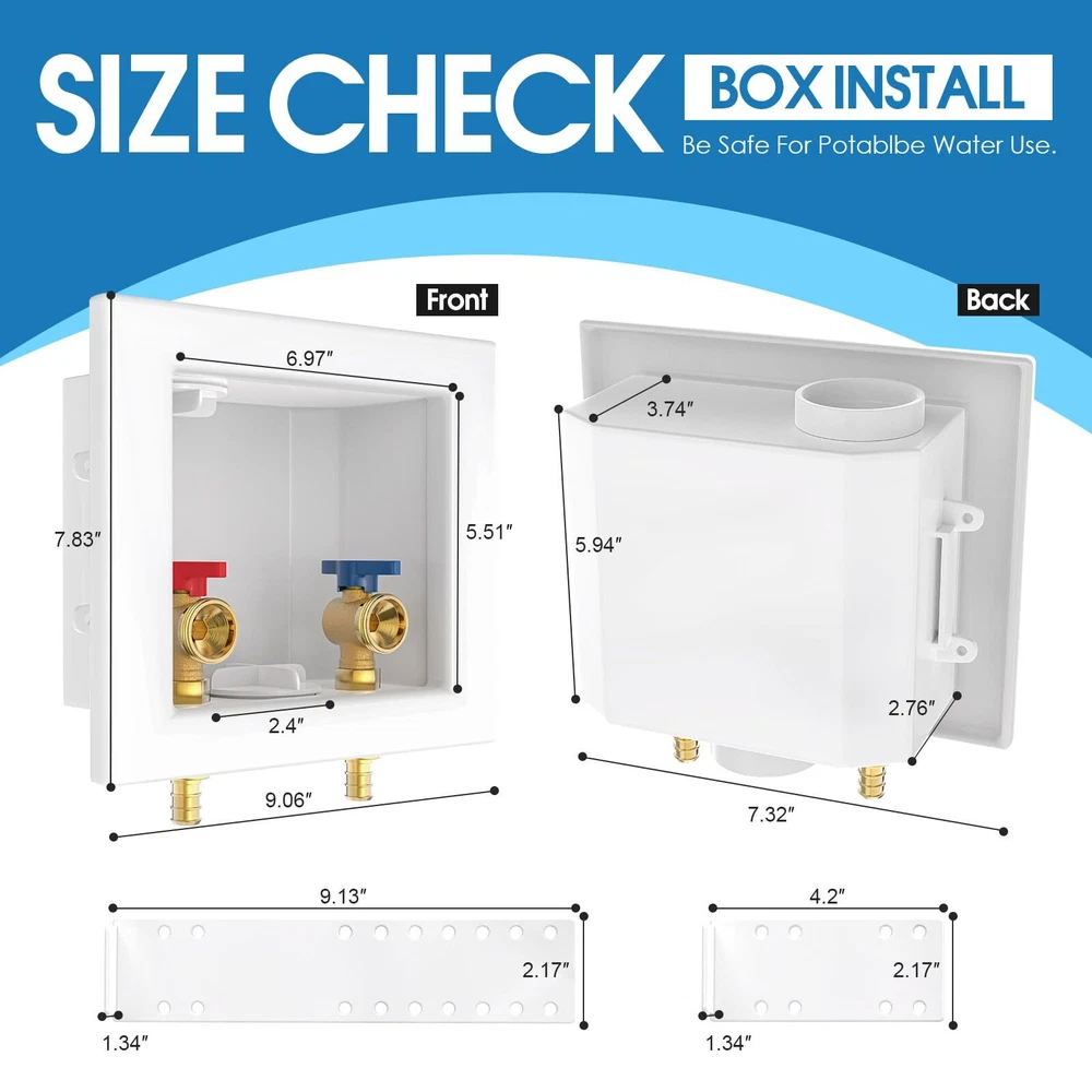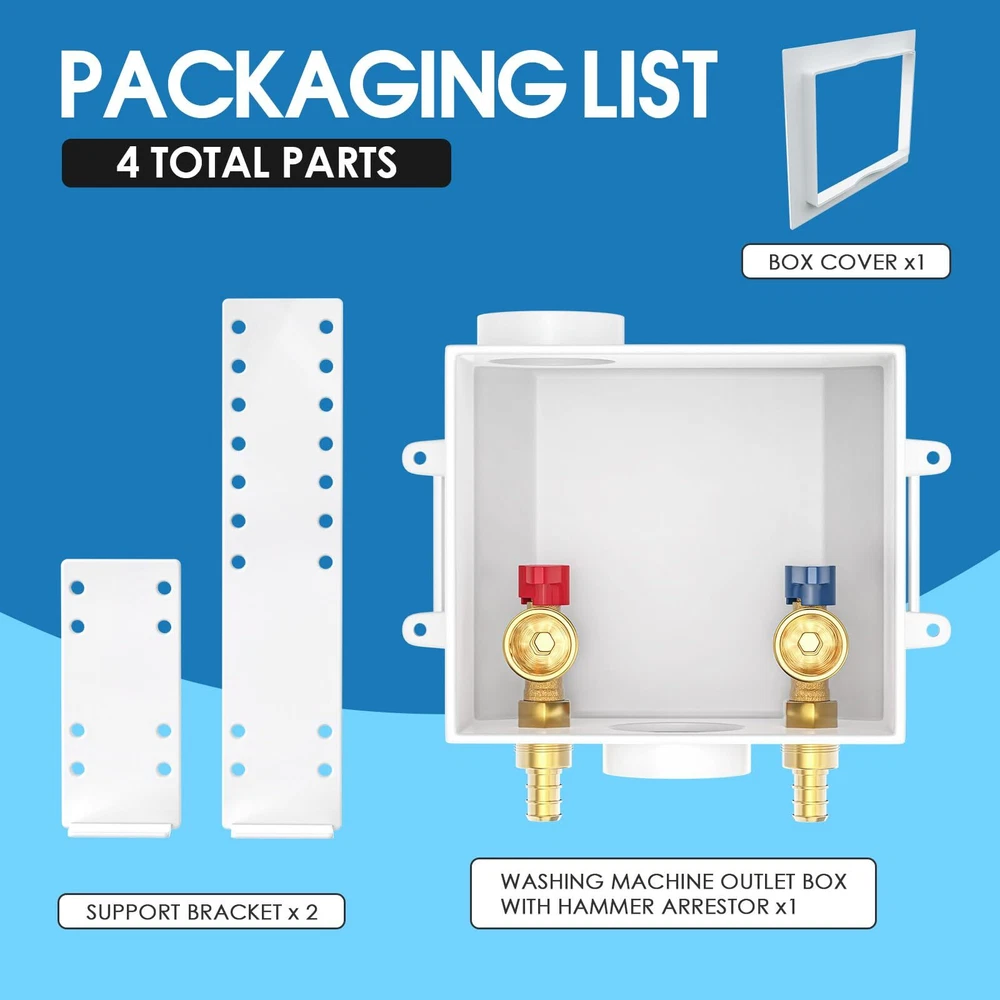 Package Includes: Washing Machine Outlet Box, 1/2-Inch Pex Crimp Connection x 3/4 Inch MHT; Support Bracket ×2 Pipe Compatibility: This pex washing machine outlet box is with crimp pex fitting system, NOT with expanding fitting system. The box is equipped with 1/4-turn hot and cold shut off valves; the inlets of washing machine box work well with 1/2 inch PEX pipes; the outlets fit well with 3/4 inch MHT washing machine hoses Long Lasting: The washing machine outlet box is made from high-quality C46500 brass, known for its high corrosion and abrasion resistance. This material ensures long-lasting performance and reliable water flow Standards Compliance: The washing machine outlet box meets American standards and complies with UPC and NSF requirements, ensuring adherence to strict safety and quality standards Versatile Applications: 1/2 pex washing machine outlet box allows for inverted installation and provides solutions for a range of residential washing machine applications. It features a recessed design and features a snap on frame which accommodates to drywall Flexible Installation: The washing machine outlet box is perfect for connecting your washing machine or water dispenser to your water supply