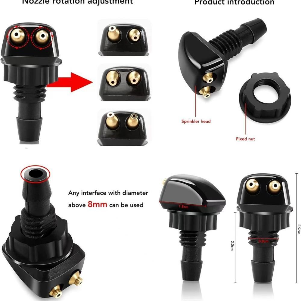 Product Description Gross Weight: 50g Package Contents: 2 x Universal Car Windshield Wiper Nozzles Description: 1. Wide Compatibility and Easy Installation Full Model Coverage: This universal car windshield wiper nozzle is ingeniously designed to fit the vast majority of car brands and models available on the market. Whether it’s a popular family sedan like the Toyota Corolla, Honda Civic, or Volkswagen Lavida; an SUV such as the Haval H6, BYD Tang, or Tesla Model Y; or a business MPV like the Buick GL8 or GAC M8, it can be perfectly matched. There’s no need to worry about compatibility issues, providing car owners with a convenient replacement and usage experience. Easy Installation: With a user-friendly universal interface design, the installation process is simple and easy to understand. No complicated tools or professional automotive repair knowledge is required. Car owners can follow the simple installation instructions to easily complete the replacement in just a few minutes. By doing it yourself, you can enjoy the fun of car maintenance and save the time and cost of going to a repair shop. 2. High-Quality Materials for Durability Corrosion-Resistant Material: The main body of the nozzle is made of high-quality corrosion-resistant material, which can effectively resist the erosion of windshield washer fluid and various acidic and alkaline substances in the external environment. During long-term use, it will not rust or get damaged due to chemical corrosion, significantly extending the service life of the nozzle and ensuring stable operation in various harsh environments. High-Strength Structure: The carefully designed high-strength structure gives the nozzle excellent impact resistance. Whether it’s small pebbles splashing up during daily driving or accidental collisions in complex road conditions, it can withstand the impact without breaking or deforming, maintaining good working condition and providing reliable safety for driving. 3. Precise Adjustment for Efficient Cleaning Multi-Angle Adjustment: It features a flexible multi-angle adjustment function. Car owners can easily adjust the angle and range of the spray according to their actual needs. Whether you want to focus on cleaning the upper vision area of the windshield or need to evenly cover the entire glass surface, you can achieve it through simple adjustment operations. This ensures that the windshield washer fluid is accurately sprayed to the desired cleaning position, improving the cleaning effect. Optimized Spray Pattern: The unique internal structure design makes the sprayed water form an optimized spray pattern. Compared with traditional nozzles, the water mist sprayed out is more uniform and fine, covering a larger area of the windshield. It can quickly dissolve dirt, stains, insect carcasses, and other impurities. When combined with the wiper, it can wipe the glass cleaner, providing the driver with a clear and unobstructed view. 4. Anti-Clogging Design for Stable Performance Precision Filtration: A precision filtration device is installed inside the nozzle, which can effectively intercept impurities and particles in the windshield washer fluid, such as dust and sand. This prevents these impurities from entering the nozzle and causing blockages, ensuring that the windshield washer fluid can always be sprayed out smoothly and maintaining a stable spray effect. This avoids the decline in cleaning performance due to blockages. Self-Cleaning Function: Some models of the nozzle also have an innovative self-cleaning function. After each spray, the self-cleaning structure will automatically activate, using special water flushing or mechanical movement to remove residual impurities around the nozzle hole, keeping the nozzle hole clean and unblocked. This further reduces the risk of blockage and reduces the trouble of later maintenance for car owners. powered by