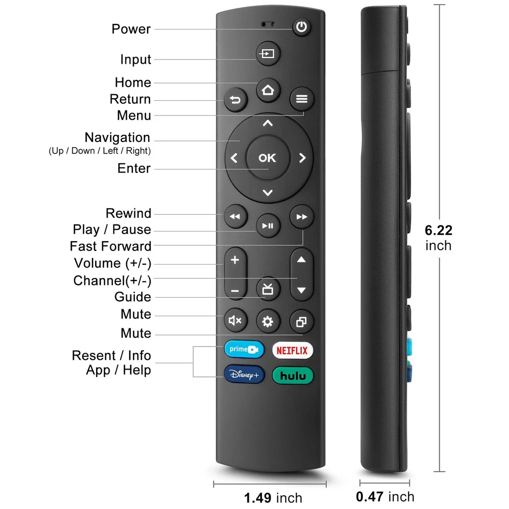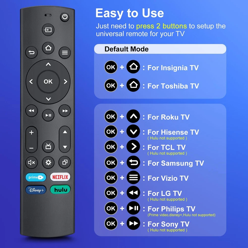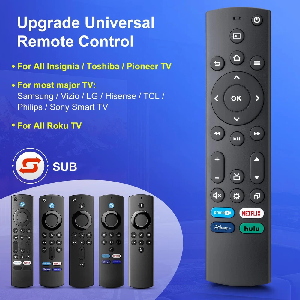 【All In One Remote】Universal Remote Control for All Insignia/Toshiba/Pioneer Smart TVs, replacement for Samsung/TCL/LG/Hisense/Vizio/Sony/Philips Smart TVs, for All Roku TV, allowing you to conveniently control different TVs with just one remote. 【Perfectly Replace Your Remote】Replacement IR remote control compatible with Voice Remote Pro / Alexa Voice Remote(1st/2nd/3rd Gen), compatible with Insignia & Toshiba smart TV remote control models : NS-RCFNA-21, NS-RCFNA-19, CT-95018, CT-RC1US-21,CT-RC1US-19 and more. 【Key Features】With NETFLIX, Prime Video, Disney and hulu hot keys, you can switch to your favorite application very conveniently. The remote is made of high quality ABS and silicone,so that makes remote comfortable and durable. 【Easy Setup and Use】Universal remote control is fit for most major TV, just need to insert 2*AAA batteries, then press 2 setting buttons to setup the remote according to your TV brand. (Package includes 1*manual to help you setup the remote, but batteries are not included.) 【UPGRADE MATERIAL】 The remote control upgrades to High-end glossy design, the material made of Shiny plastic, it is more durable than matter material,and it's ABS material that children use safely.