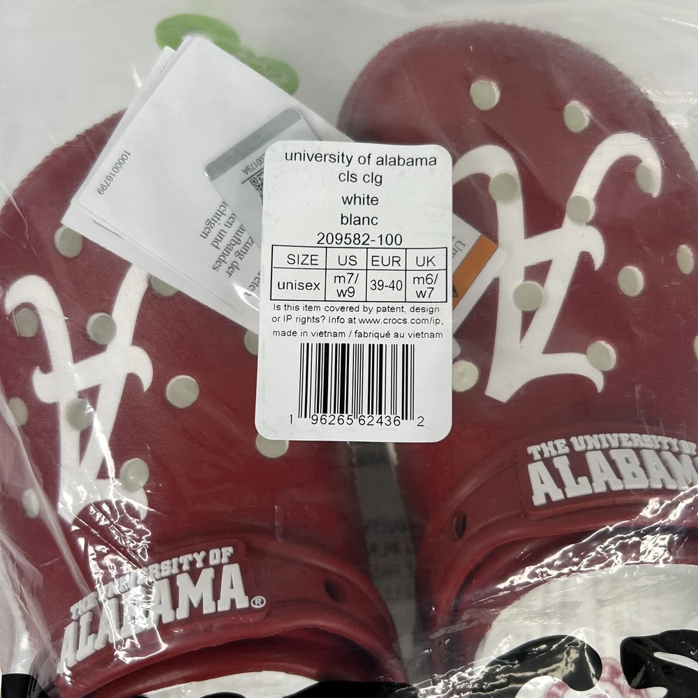 Color: Crimson Red Features: Ankle Strap, Breathable, Comfort Vintage: No US Shoe Size: 7 Model: Classic Croc EU Shoe Size: 39 Character: Al the elephant Occasion: Activewear, Casual, Travel Accents: Logo Type: Casual Department: Unisex Adults UK Shoe Size: 6 Upper Material: Synthetic Style: Clog Theme: College, University of Alabama, University, Crimson Tide Brand: Crocs
