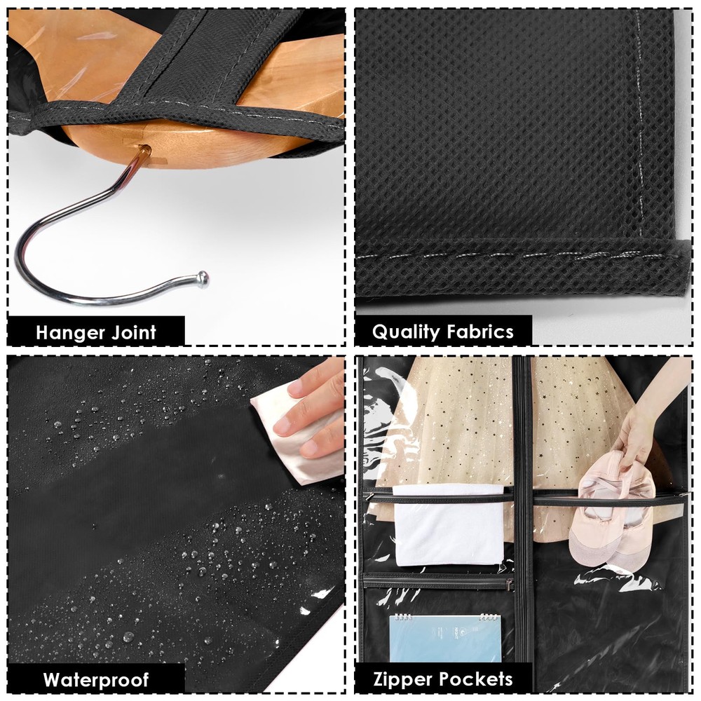 HIGH QUALITY FABRIC - Set of 4 Dance Costume Bags, Made of clear black PVC with Breathable Non-woven fabric gusset, durable, odorless, breathable and Waterproof and reuse use. MULTIPLE ZIP POCKETS - 3 Medium clear zipper pockets to separately storing your shoes and accessories, such as belts, socks, hair ties, makeup box, dance shoe etc. STRONGER ZIPPER AND D-RING - We use qualified 5# nylon zipper and added the upper and bottom metal stoppers to avoid zipper slip off, which ensure the durable, smooth and long-time user of the zipper. Durable D-ring allows hangers to pass through for folding. BEST DANCE COSTUME GARMENT BAG - Long size 24 x 40 inch, it’s ideal for your Dance Costume, Dress, Suits, jackets, shirts and other size clothes. CUSTOMER SATISFACTION - We wish every customer will have a happy buying experience with us. Please do contact us if you have any problem with your garment bag. We’ll solve your problem immediately.