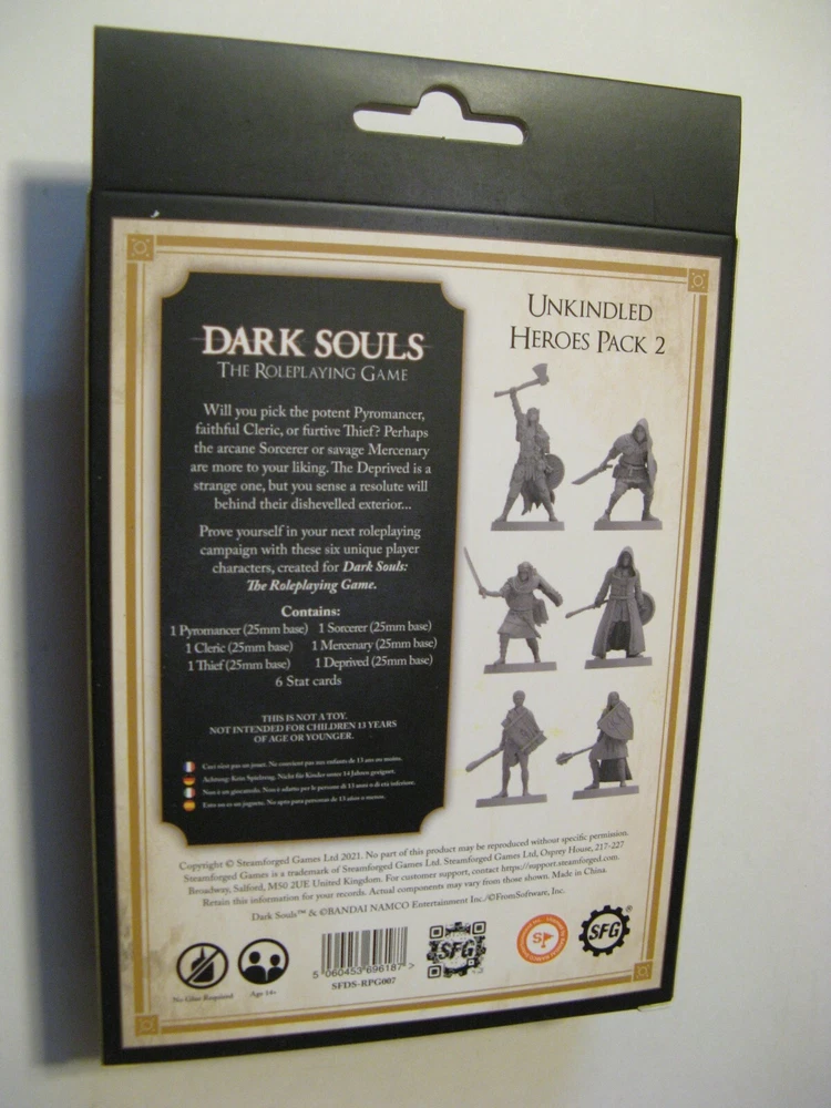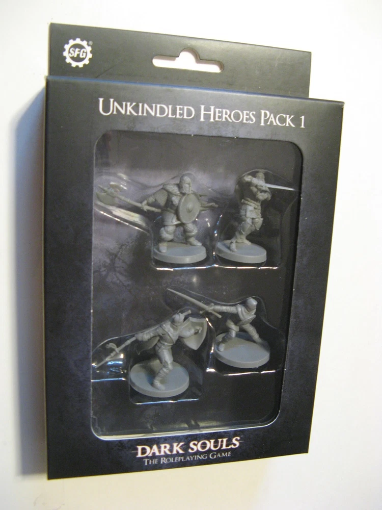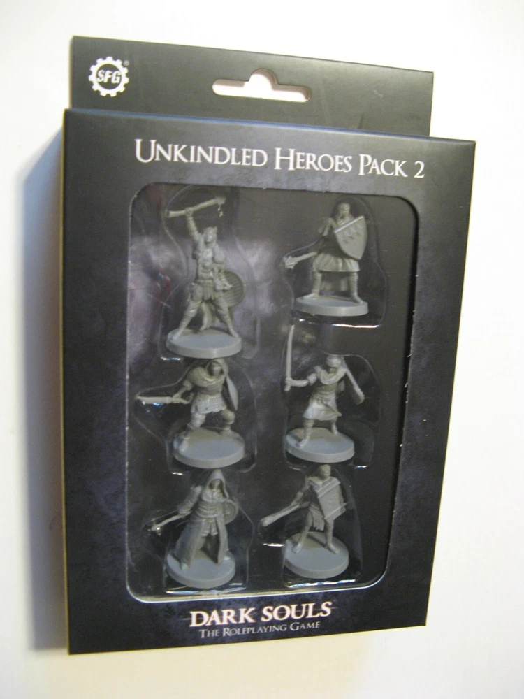 Here are Unkindled Heroes Pack 1 (Steamforged Games, SFDS-RPG005) and Unkindled Heroes Pack 2 (SFDS-RPG007) for Dark Souls, The Roleplaying Game. Pack 1 includes 4 figures - knight, herald, assassin, warrior - and 4 stat cards. Pack 2 includes 6 figures - pyromancer, cleric, thief, sorcerer, mercenary, deprived - and 6 stat cards. Both are brand new and sealed. Shipping cost will be determined by the shipping calculator . Thanks for looking!