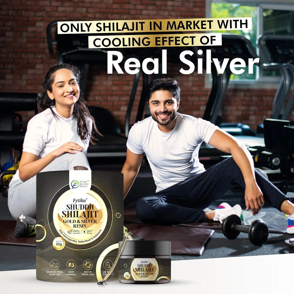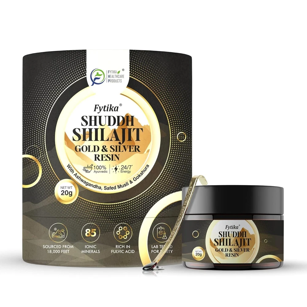 Fytika Shuddh Shilajit Gold and Silver Resin - Pure Himalayan Power for Strength, Stamina, and Energy (20g) Elevate your vitality and well-being with Fytika Shuddh Shilajit Gold and Silver Resin, a premium Ayurvedic supplement crafted from 100% authentic Himalayan Shilajit. Enriched with Swarn Bhasam (Gold Ash) and Rajat Bhasam (Silver Ash), this potent blend combines the rejuvenating benefits of Ayurvedic herbs like Ashwagandha, Safed Musli, and Gokshura to support strength, stamina, and energy. Key Ingredients & Benefits: Swarn Bhasam & Rajat Bhasam: Known in Ayurveda for their rejuvenating properties, these elements enhance the body’s endurance and vitality. Ashwagandha & Safed Musli: Renowned for reducing stress, enhancing energy, and improving stamina. Gokshura: Supports strength, muscle tone, and optimal hormonal balance. Why Choose Fytika Shuddh Shilajit Gold and Silver Resin? This unique blend harnesses the power of traditional Ayurvedic herbs to promote overall vitality, resilience, and well-being. Fytika ensures high-quality, 100% natural ingredients sourced from the Himalayas, delivering purity in every gram. Suggested Use: Consume as directed to boost energy, improve strength, and support stamina for a balanced, active lifestyle. Product Details: Weight: 20g per pack 100% Ayurvedic Formula: Pure and free from artificial additives
